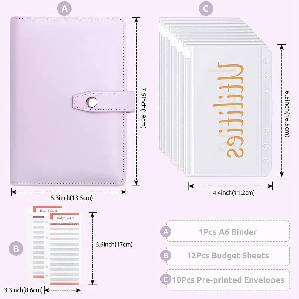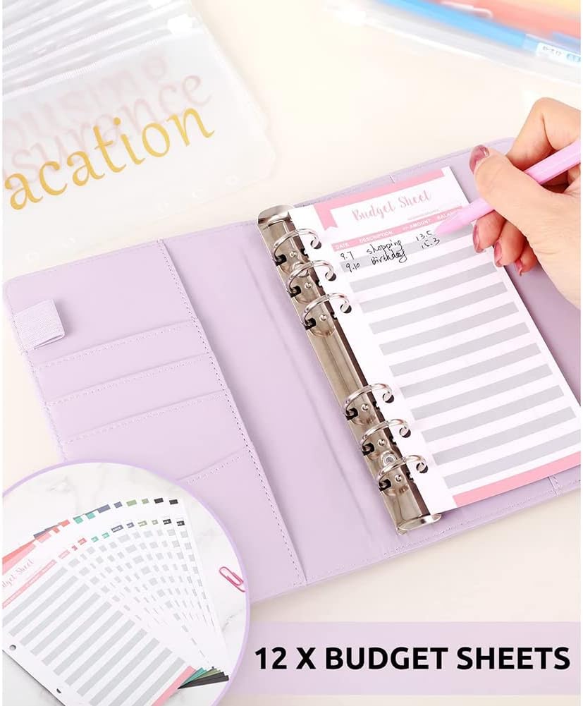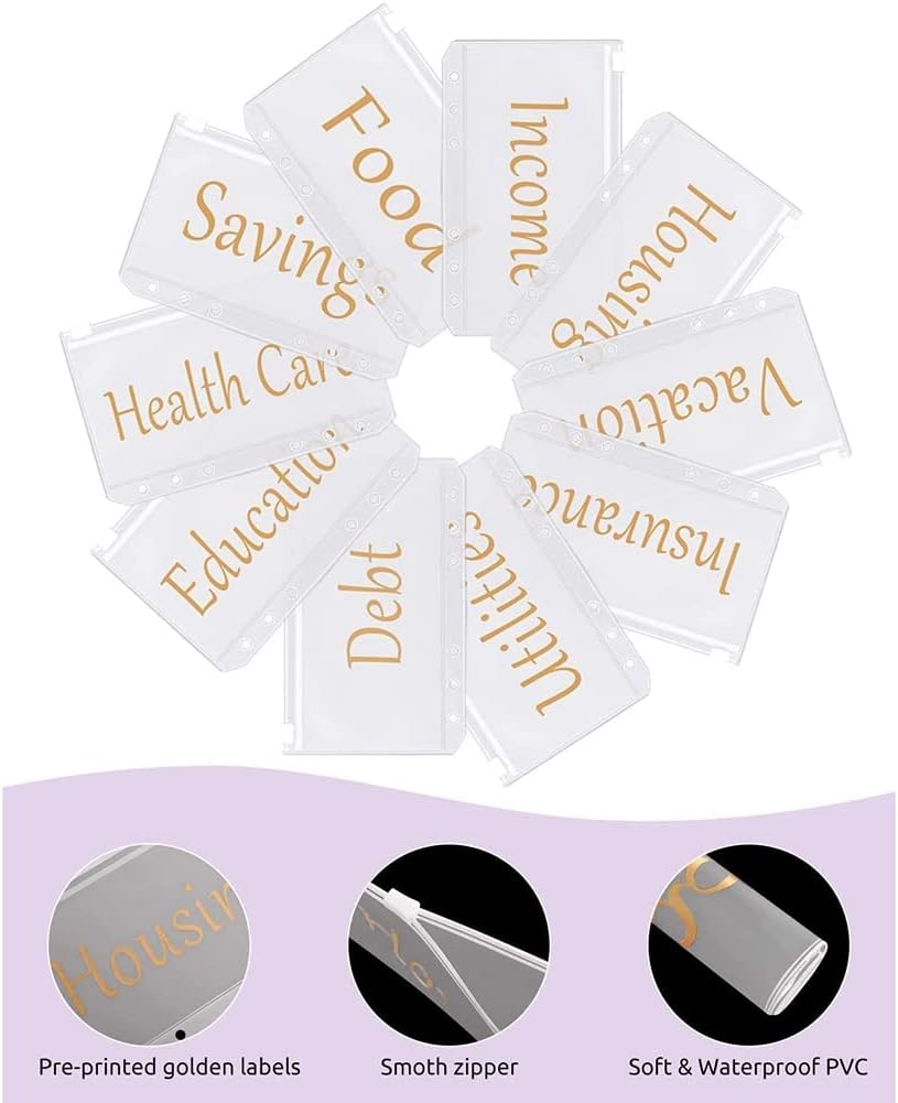 12 fogli di budget PCS: tabelle budget a 6 colori, adatte per registrare flussi di denaro e deflussi di ogni categoria, in modo da poter verificare chiaramente la presenza effettiva di tutti i fondi. Organizer per denaro contante con fogli di budget ti aiuta a gestire le tue finanze e raggiungere gli obiettivi di budget. 10 tasche prestampate con cerniera – Borse in PVC di alta qualità stampate con scritta dorata, non è necessario scrivere a mano o incollare etichette adesive. Le buste per contanti sono ideali per riporre banconote, carte, francobolli, biglietti, monete e penne. Copertura lucida Laiser – Budget – Buste con cerniera con superficie a strati elegante e accattivante, impermeabile e morbido. Dotato di una pratica fibbia magnetica e di una pratica struttura interna, entrambi i lati sono nascosti scomparti, scomparti per carte di credito e passanti per penne per mantenere gli oggetti ordinati e ordinati. Facile da trasportare: le nostre buste economiche per il sistema di cassa sono leggere e facili da trasportare, adatte per l'uso quotidiano a casa, in ufficio, a scuola e in viaggio. È anche un regalo perfetto per la famiglia, i colleghi e i bambini.