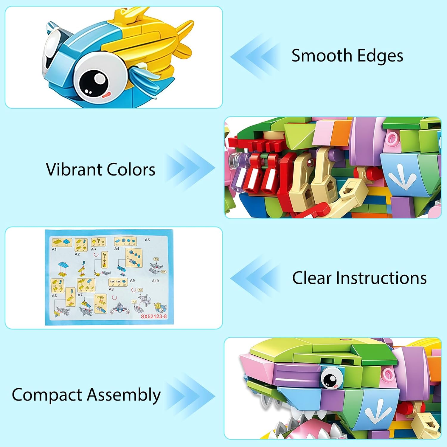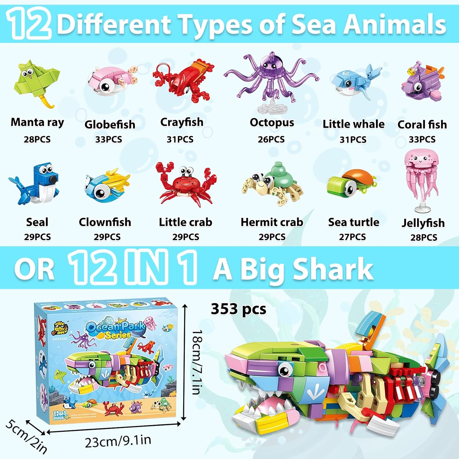 [12 in 1]: ottieni 12 mattoncini di creature marine, tra cui una piccola balena, una manta, un pesce palla, un piccolo granchio, una foca, un polpo, un granchio di fiume, un pesce pagliaccio, un granchio eremita, una medusa, un pesce corallo e una tartaruga marina. Combina tutti i blocchi per costruire un grande squalo. I bambini adoreranno i disegni affascinanti e realistici. [Materiali di alta qualità]: i mini blocchi da costruzione a forma di animali sono realizzati in plastica resistente e riutilizzabile con bordi lisci, in modo che i bambini non si feriscano durante il gioco, ricreare le loro opere e godere di un divertimento senza fine. [Assemblaggio senza sforzo]: ogni confezione di micro mattoncini contiene istruzioni per consentire ai bambini di assemblare i pezzi senza sforzo. Puoi anche assemblare i mattoncini secondo la tua creatività e goderti ore di divertimento. Si tratta di un giocattolo educativo multifunzionale, adatto per bambini dai 6 anni in su. [Imparare a giocare]: questo set di mini blocchi di costruzione promuove le capacità di risoluzione dei problemi, l'immaginazione spaziale, le capacità motorie e il pensiero creativo dei bambini nella costruzione di affascinanti modelli di creature marine, rendendolo un prezioso complemento per ricompense e attività di apprendimento in classe. [Il regalo ideale]: questo versatile set di mini animali da costruzione è il giocattolo interattivo perfetto per tutta la famiglia con le sue dimensioni compatte e le possibilità illimitate di costruzione. La scatola esterna ben confezionata è ideale come regalo di compleanno, premio in classe o come imbottitura per sacchetti regalo.