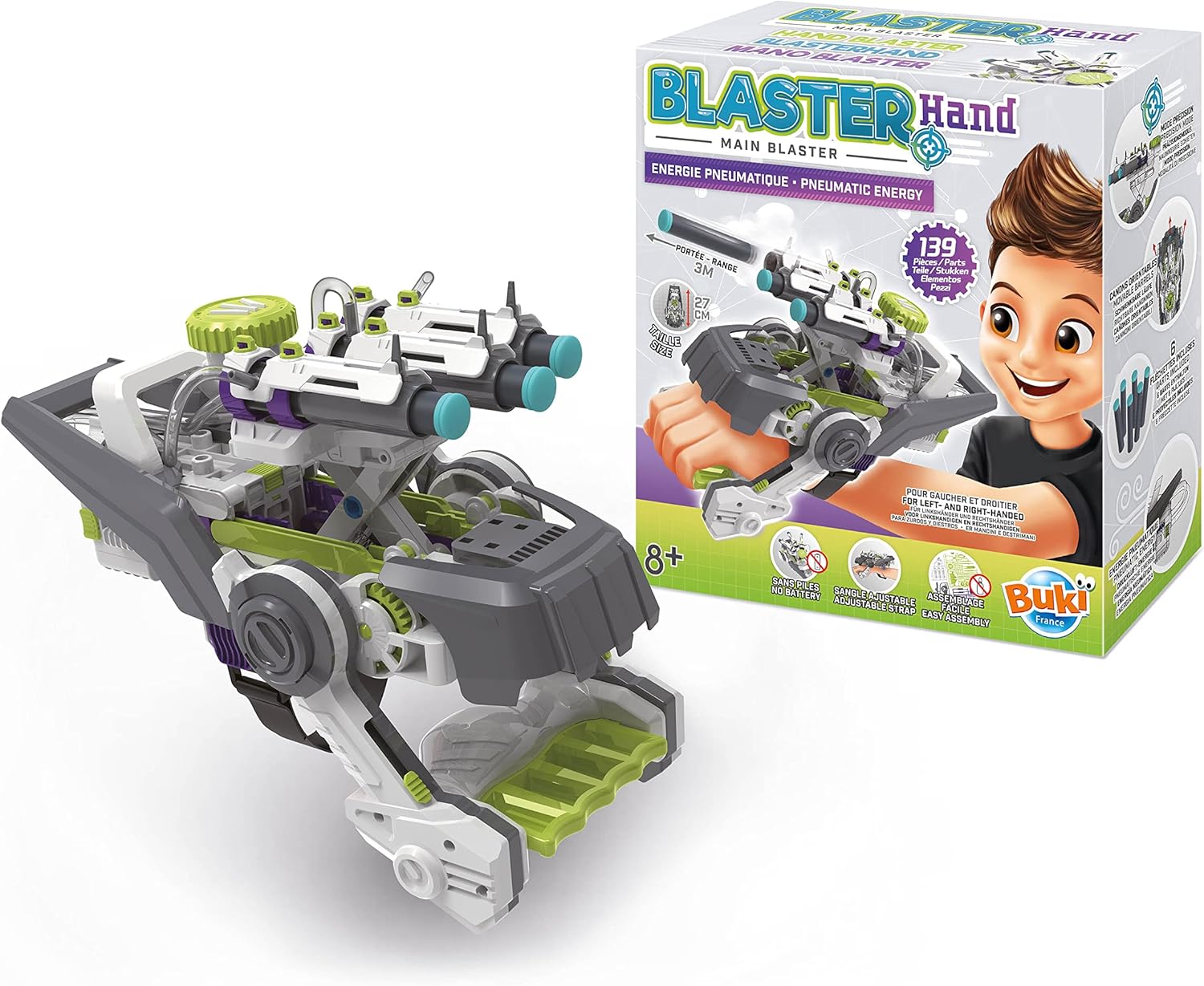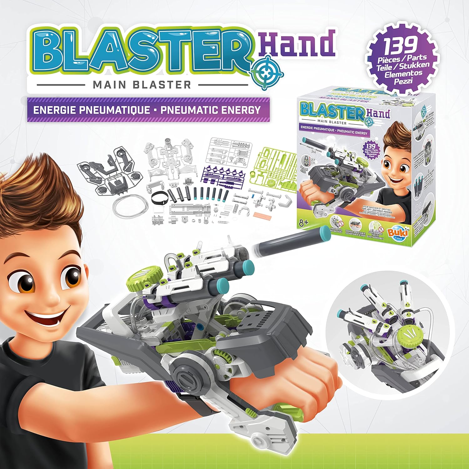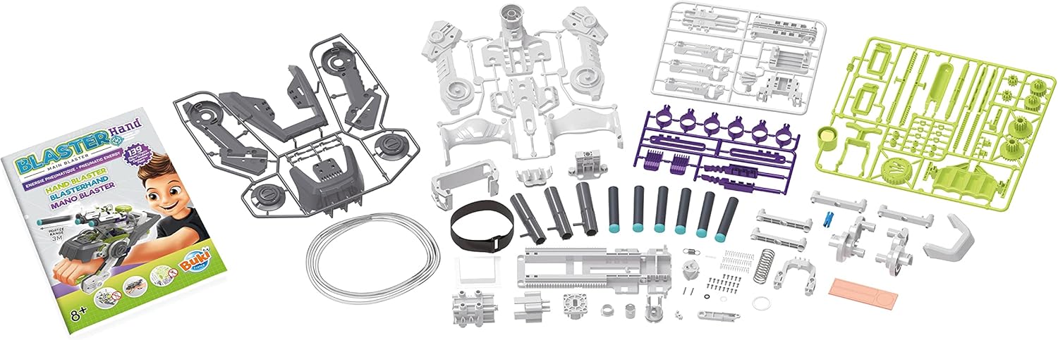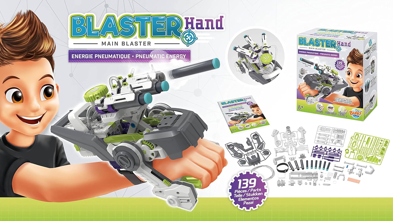 Assembla i componenti e costruisci una mano blaster alimentata da energia pneumatica Posiziona la mano all'interno del blaster e pompa per sparare le freccette; per destrimani e mancini Cannoni orientabili; 2 modalità di sparo: precisione e raffica Sono incluse 6 freccette; il blaster è compatibile con la maggior parte delle altre freccette in gommapiuma Dimensione della mano: 27 cm; assemblaggio facile; funziona senza batteria; da 8 anni