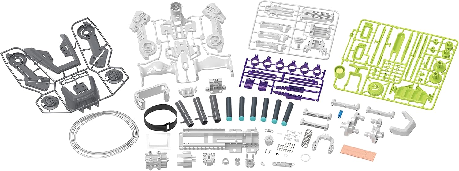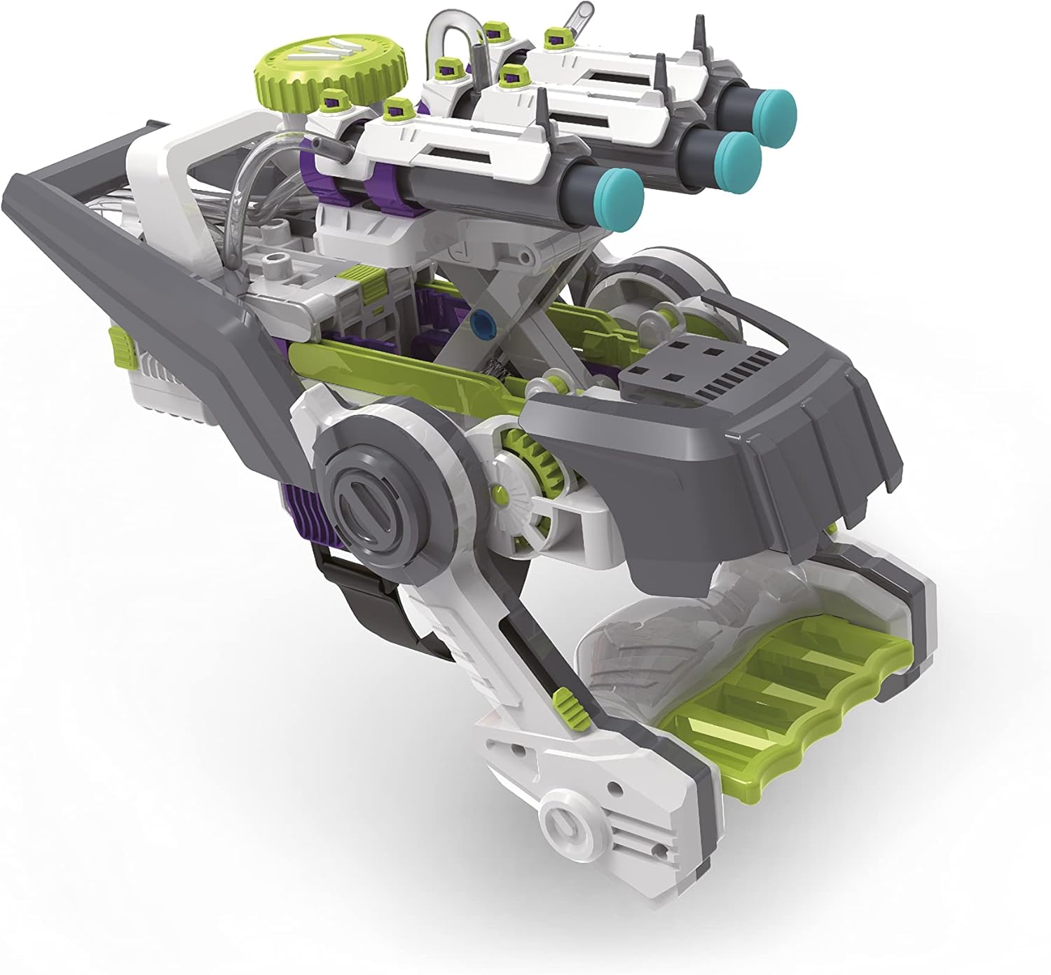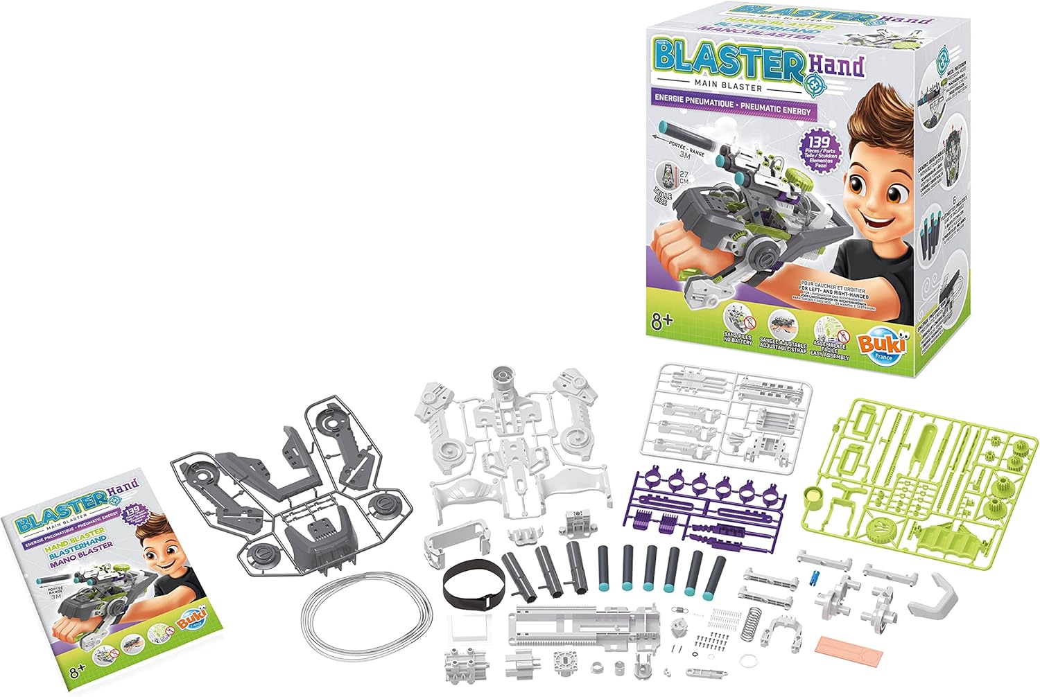 Assembla i componenti e costruisci una mano blaster alimentata da energia pneumatica Posiziona la mano all'interno del blaster e pompa per sparare le freccette; per destrimani e mancini Cannoni orientabili; 2 modalità di sparo: precisione e raffica Sono incluse 6 freccette; il blaster è compatibile con la maggior parte delle altre freccette in gommapiuma Dimensione della mano: 27 cm; assemblaggio facile; funziona senza batteria; da 8 anni