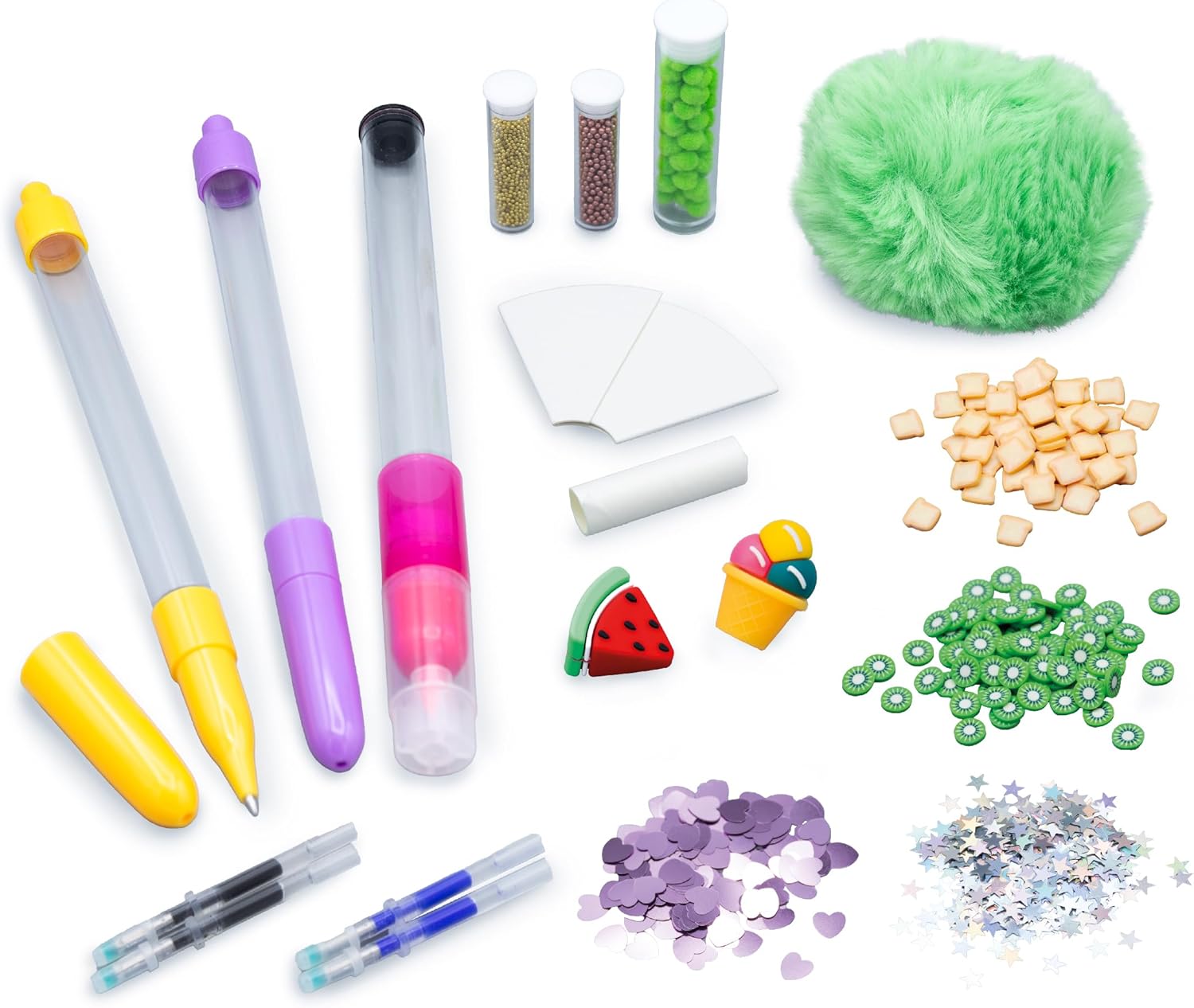 Un kit per personalizzare 2 penne a inchiostro cancellabile e 1 evidenziatore Compatibile con la fabbrica di penne (FK007) ma può essere utilizzata separatamente 3 modelli disponibili: Kawaii, animali e cibo Contiene: 2 penne a frizione con 4 punte di inchiostro, 1 evidenziatore, 1 imbuto, 1 pompon, 2 figurine, assortimento di paillettes e Da 6 anni