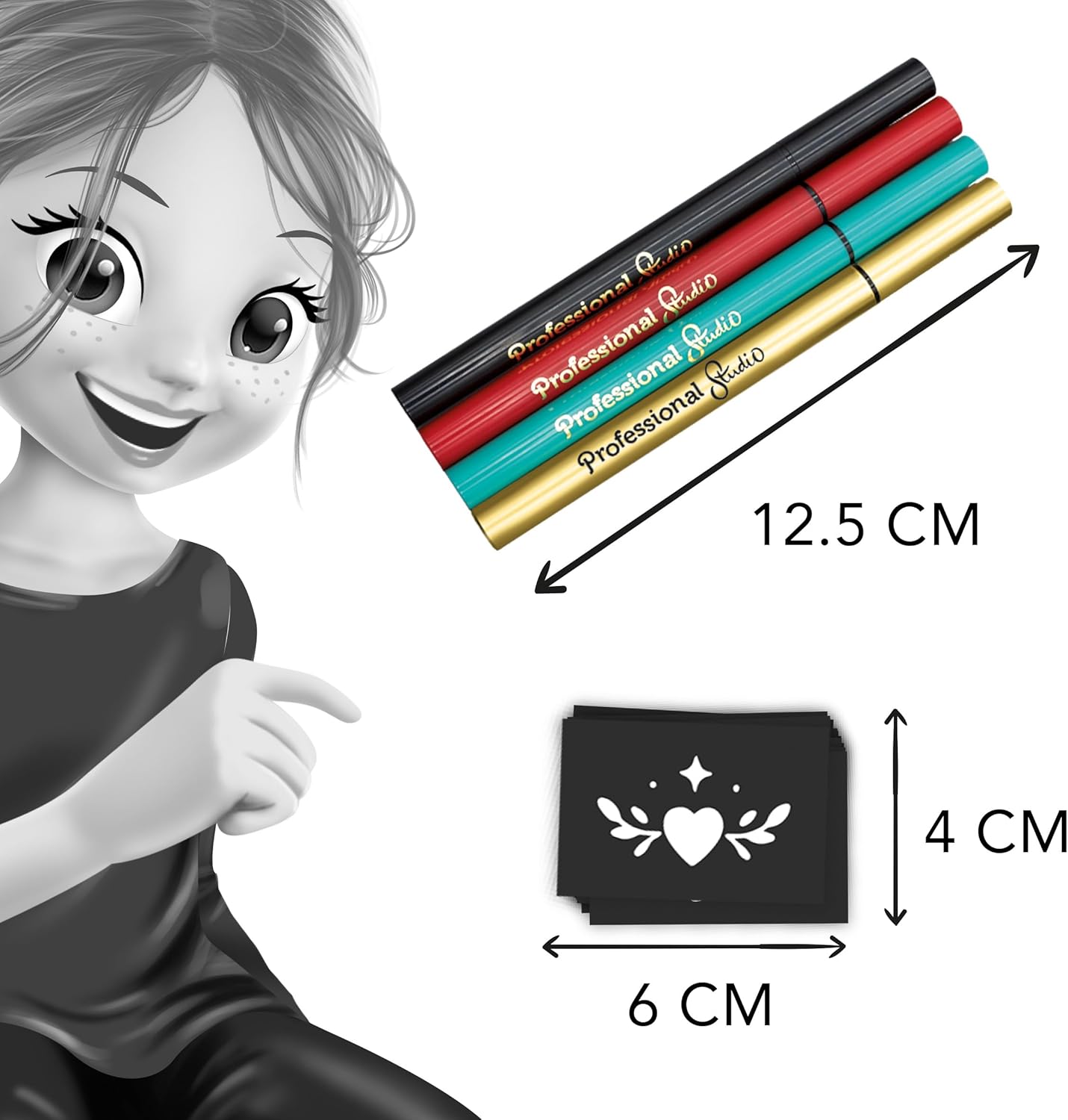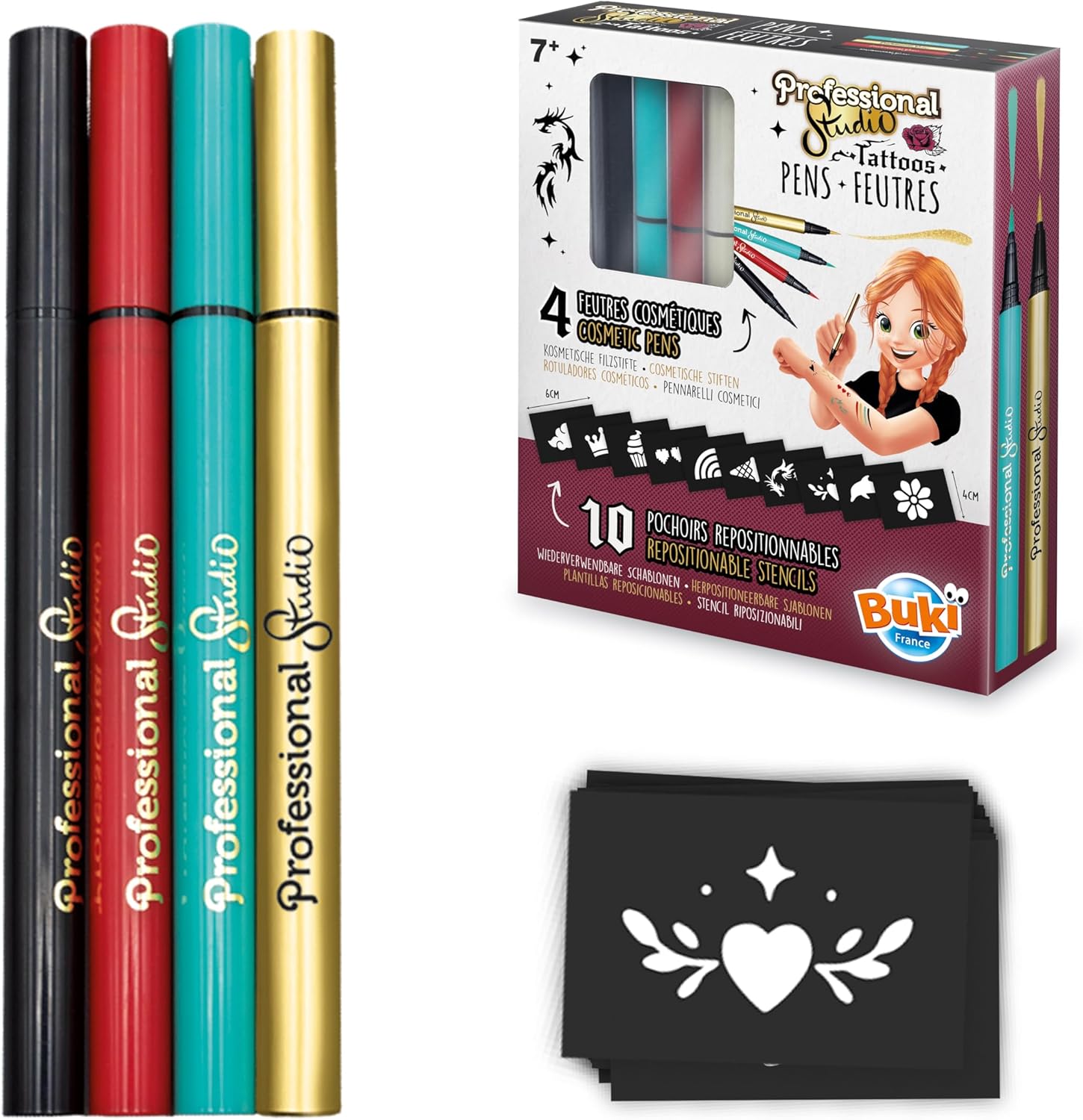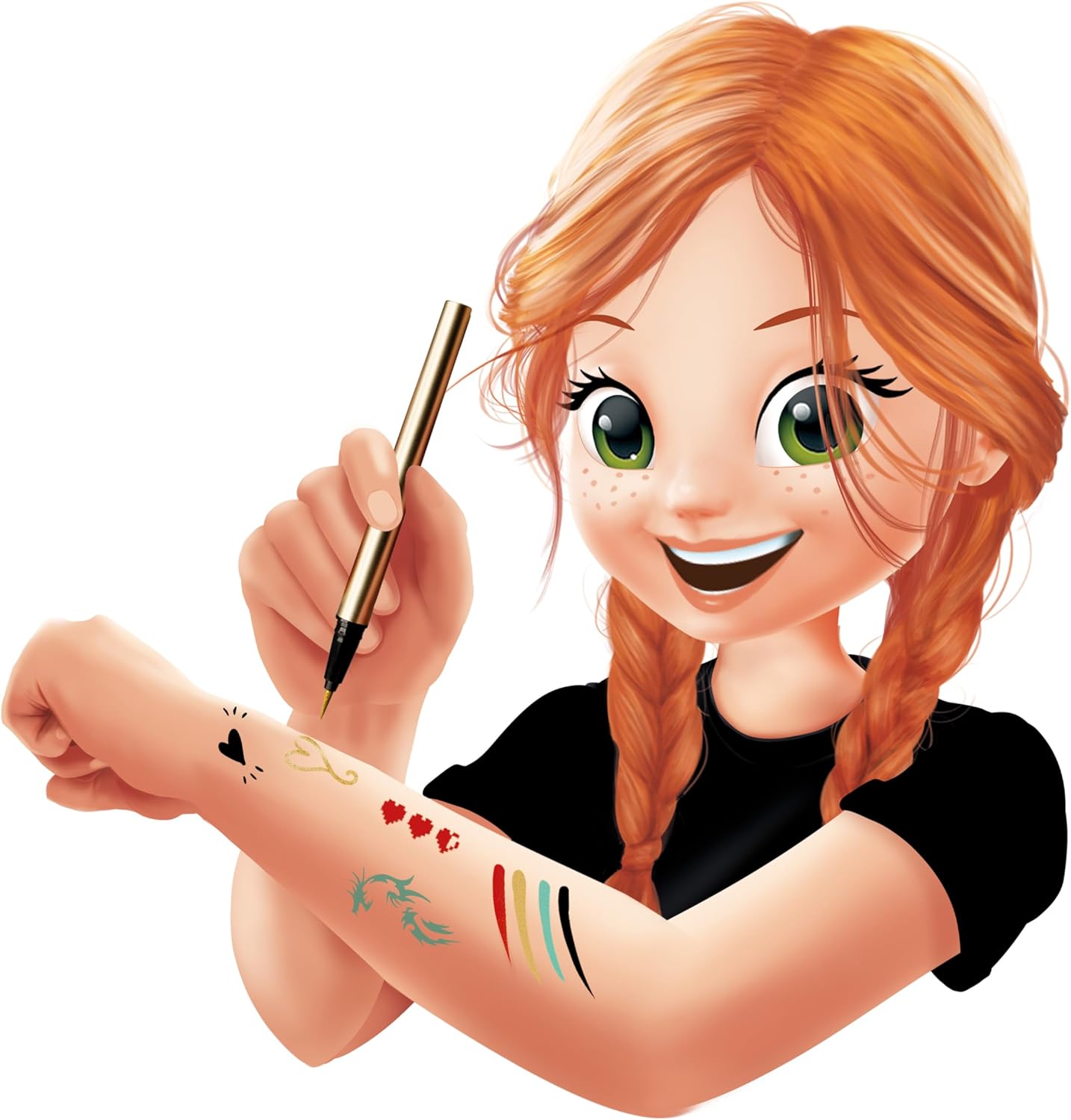 Dei pennarelli cosmetici per disegnare fantastici tatuaggi colorati! Con il pennarello puoi disegnare liberamente oppure colorare negli stencil. I disegni fatti con i pennarelli possono essere rimossi dopo qualche giorno semplicemente lavandosi o utilizzando uno struccante, a seconda del tipo di pelle. Contiene: 4 pennarelli per tatuaggi e 10 stencil riposizionabili. Libretto di istruzioni illustrato a colori. A partire da 7 anni.