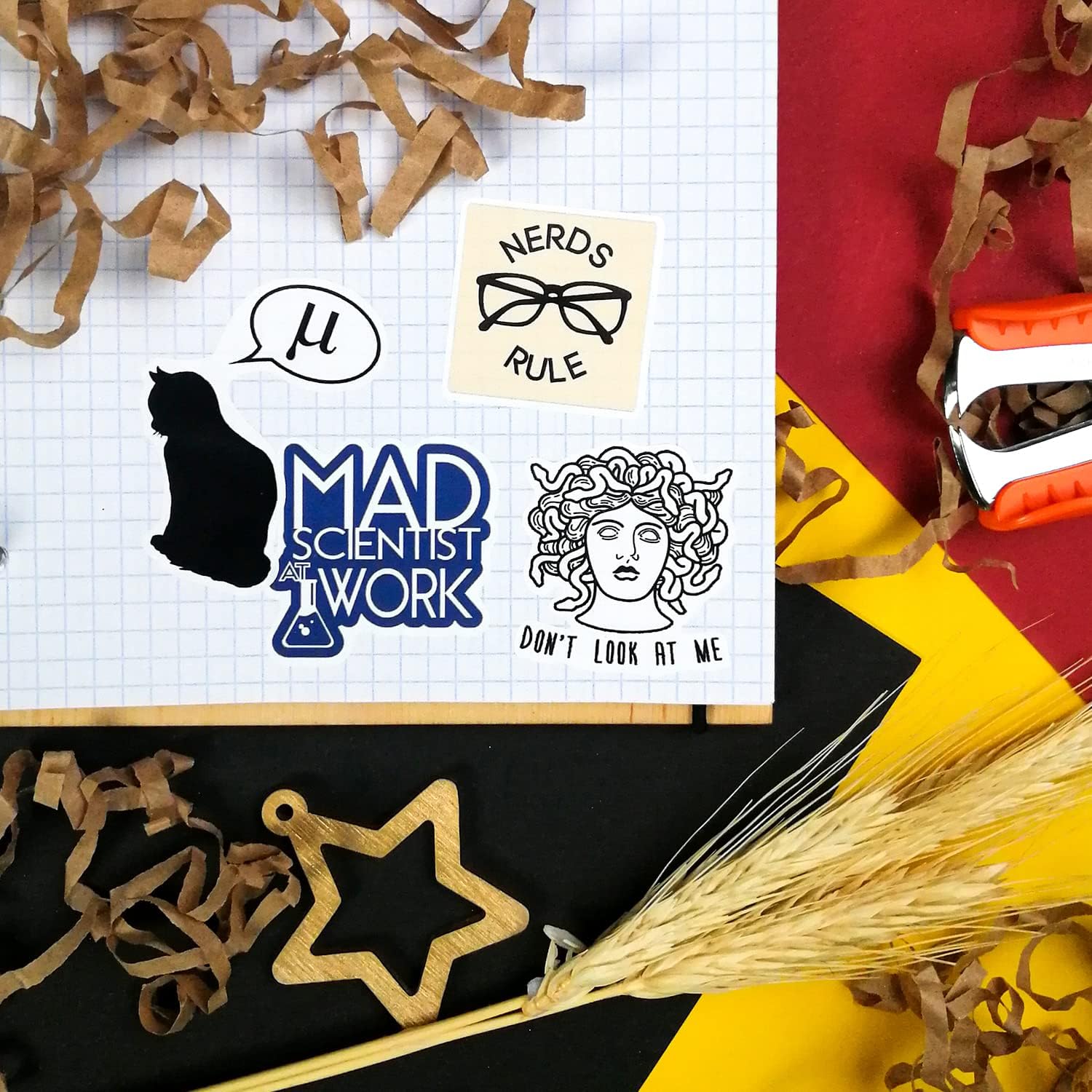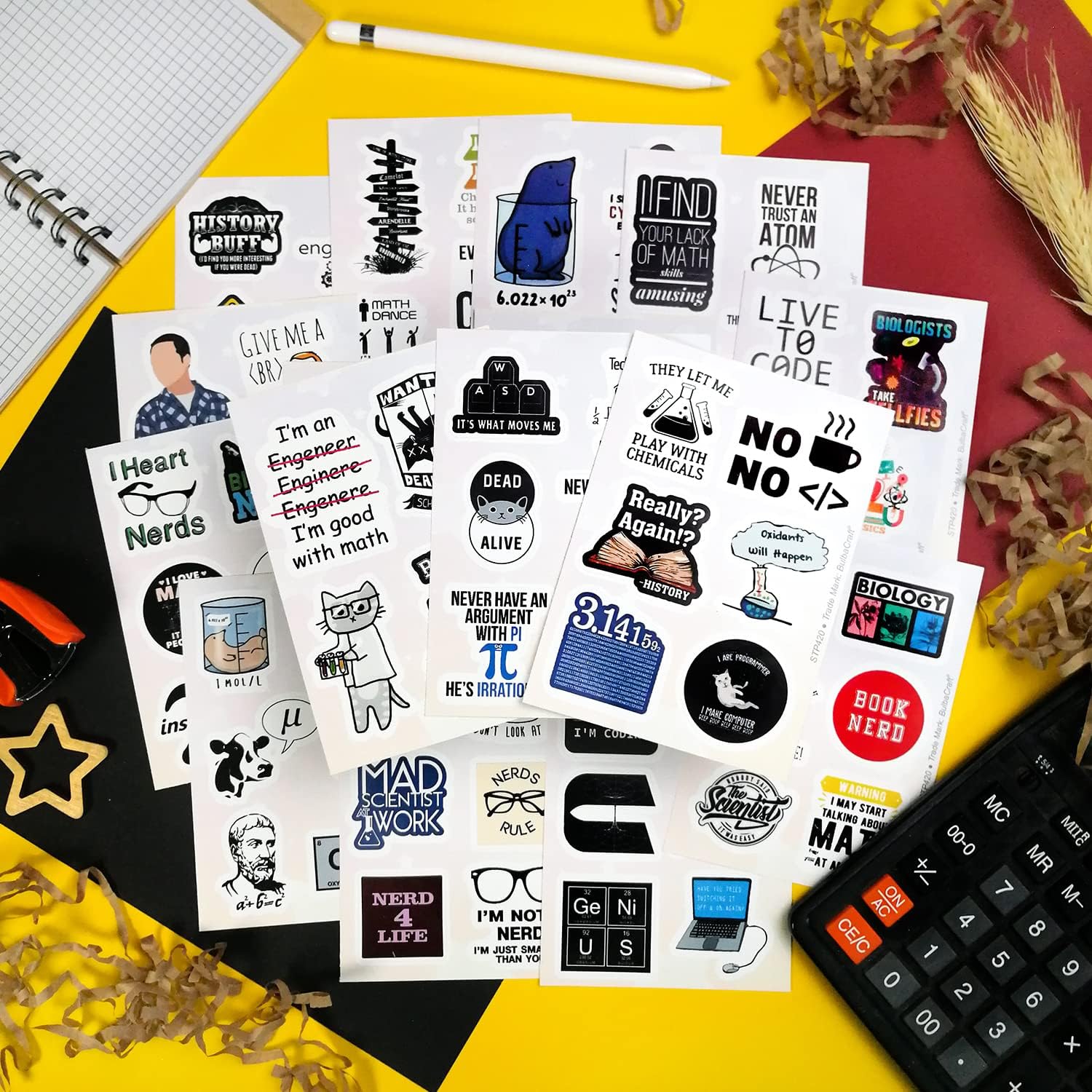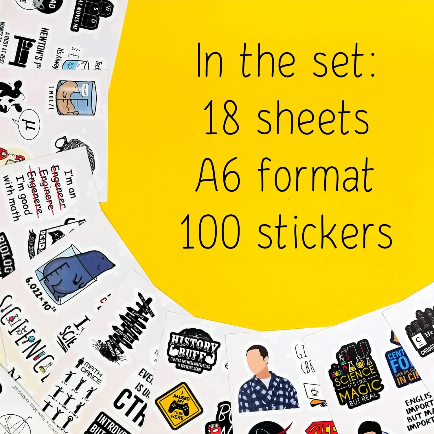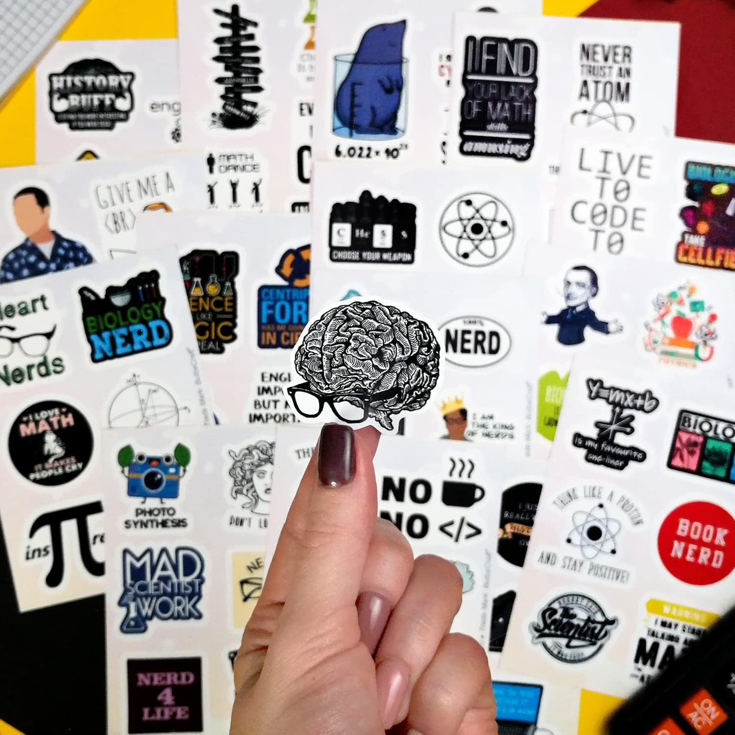 GODITI IL MATERIALE IN VINILE DI ALTA QUALITÀ - Gli adesivi Nerd sono realizzati in vinile sicuro e di qualità professionale e aderiscono saldamente a qualsiasi superficie liscia, non si staccano facilmente. Gli adesivi non sbiadiscono, quindi i loro colori rimangono chiari a lungo. ✏️ FOGLI DI ADESIVI UTILIZZABILI - Il nostro set di adesivi contiene diversi fogli di adesivi colorati. Questa disposizione è molto comoda per l'uso e la conservazione. Gli adesivi possono essere riutilizzati più volte incollandoli nuovamente sul foglio. Gli adesivi in vinile impermeabile Nerd sono perfetti per le tue bottiglie d'acqua o i contenitori per il pranzo che devono essere conservati in frigorifero. Non preoccuparti dei danni derivanti dalle fuoriuscite. ✏️ Gli adesivi nerd versatili sono adatti a tutti. Sono regali nerd perfetti per i tuoi amici, parenti e insegnanti. Chiunque ami la scienza sarà felice di ricevere un regalo scientifico così divertente. Personalizza te stesso con i nostri adesivi nerd life e tutti conosceranno la tua passione. Rendi la festa della scienza unica e memorabile con i nostri adesivi. Usali per forniture per feste nerd o come bomboniere per feste nerd. Il set di adesivi nerd contiene tante citazioni divertenti che delizieranno i tuoi ospiti. Divertiti con i nostri ottimi adesivi ✏️ Decora tutto ciò che vuoi. Il materiale resistente degli adesivi nerd consente loro di ravvivare un numero infinito di oggetti: telefoni, specchi, frigoriferi, laptop, skateboard, valigie, biciclette. Usa gli adesivi per finestre per decorare le finestre. Usa adesivi nerd per creazioni e collage. Decora i tuoi libri, album fotografici, quaderni, diari. Le possibilità di decorazione sono infinite
