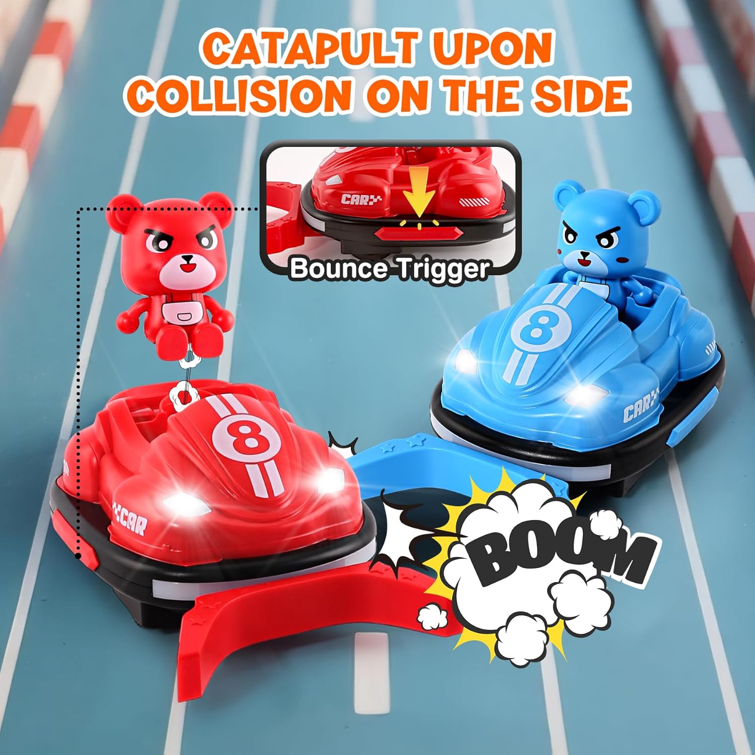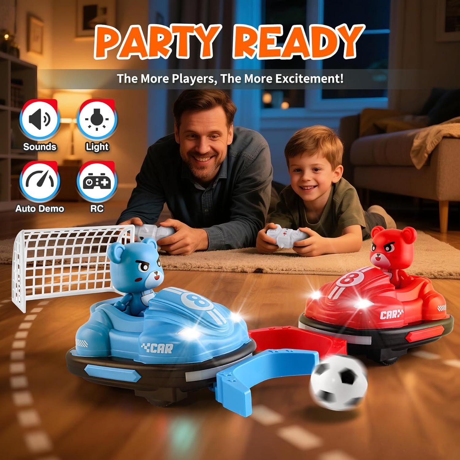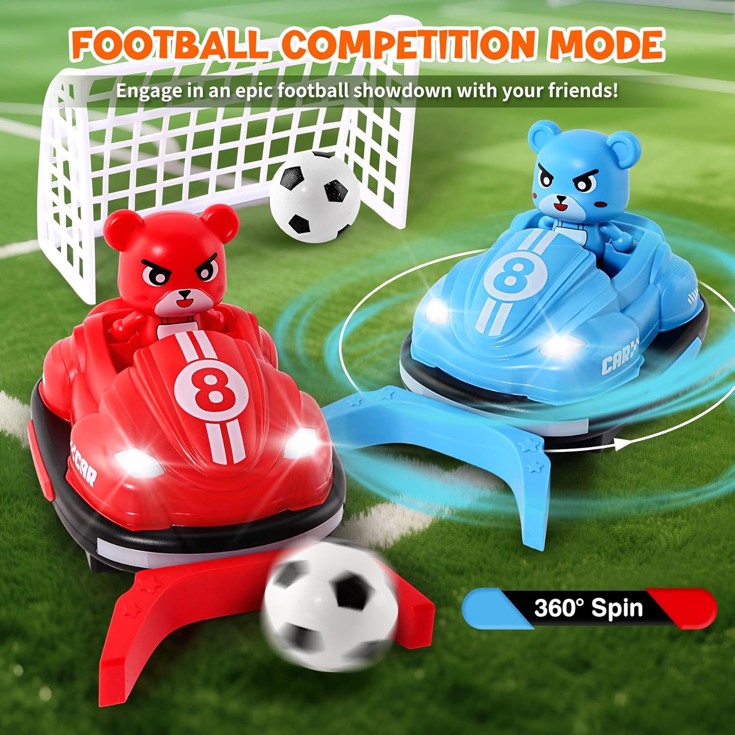 Set di 2 auto telecomandate con gioco di calcio: questo giocattolo pieno di azione include 2 auto da shock telecomandate, 2 gol di calcio e un mini pallone. I bambini possono divertirsi a fare battaglie in auto o passare a partite di calcio telecomandate per il doppio divertimento! Luci, musica e modalità sport interattive: le luci LED lampeggianti e la musica accattivante aumentano l'impegno e danno l'impressione di vivere una vera competizione. Che si tratti di un duello incisivo o di una partita di calcio, questo giocattolo RC garantisce momenti emozionanti per i bambini attivi che amano le auto e lo sport. Telecomando adatto ai bambini: progettato per i principianti, il telecomando intuitivo è perfettamente adatto alle mani piccole. I comandi semplici (anteriore, posteriore, rotazione) consentono ai bambini dai 5 agli 8 anni di guidare la propria auto facilmente, sia in modalità battaglia che in calcio. Resistente, sicuro e progettato per l'azione: realizzato con materiali resistenti agli urti e sicuro per i bambini, le auto RC sono pronte a incassare collisioni e colpi durante i giochi energici. Ideale per giocare al chiuso, questo giocattolo favorisce il movimento e la competizione sana. Regalo ideale per i bambini: stai cercando un'idea regalo originale? Questo giocattolo 2 in 1 auto autoguidata e calcio soddisfa sia i ragazzi che le ragazze. Una scelta dinamica e creativa che unisce divertimento del telecomando e passione per lo sport.