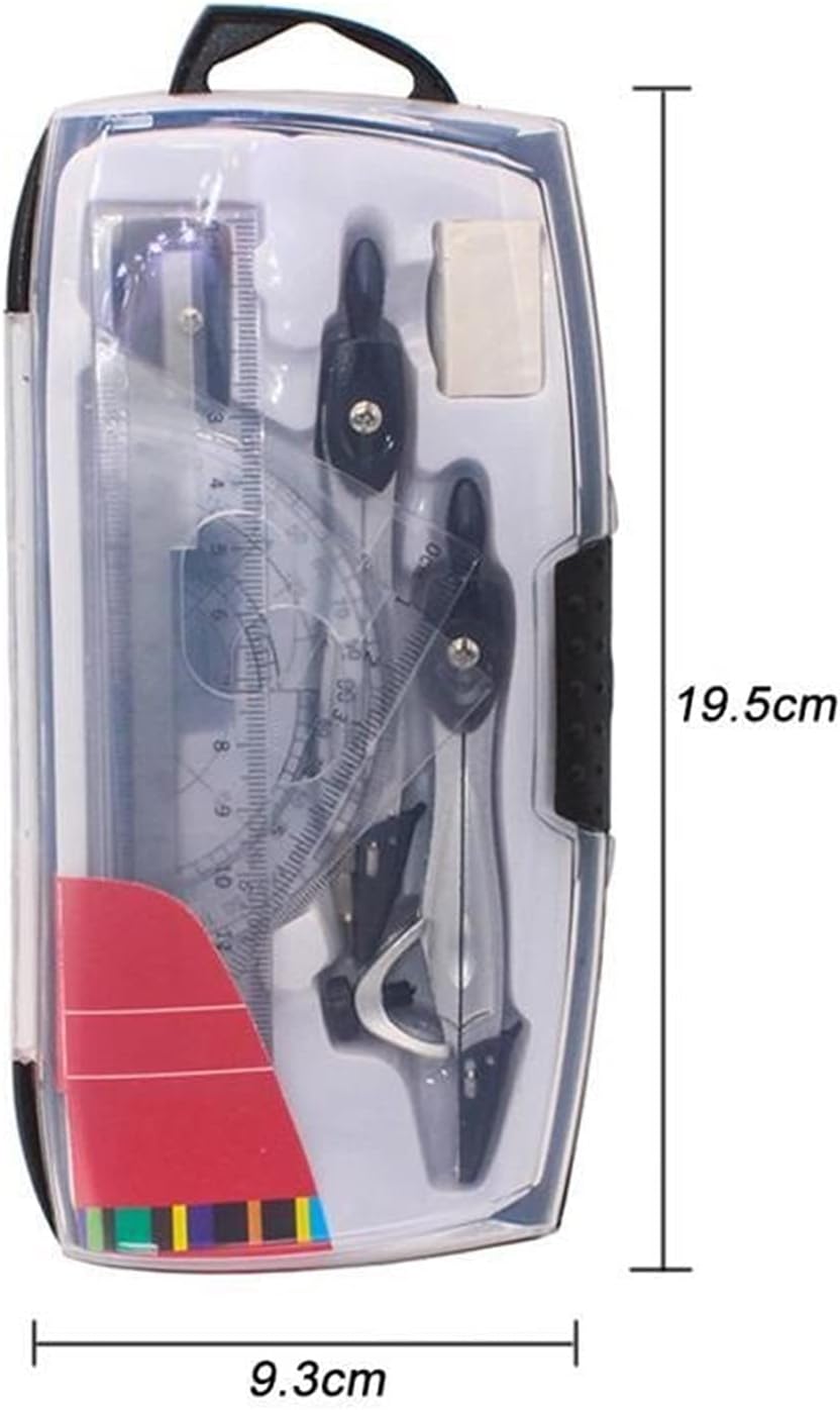 Set di strumenti di geometria per tutti i livelli di studenti. Con scale inglesi, grande precisione. La confezione include: 2 * Compasso in metallo, 1 * Gomma, 1 * Portapenne in metallo, 1 * Righello, 1 * Set quadrato (30°/60°), 1 * Set quadrato (45°), 1 * Goniometro, 1 * Portamine per bussola, 1 * Confezione di mine per portamine. Materiale: plastica + metallo, dimensioni imballo (L*L): 19,5*9,3 cm. Cancelleria scolastica perfetta per studenti e insegnanti.