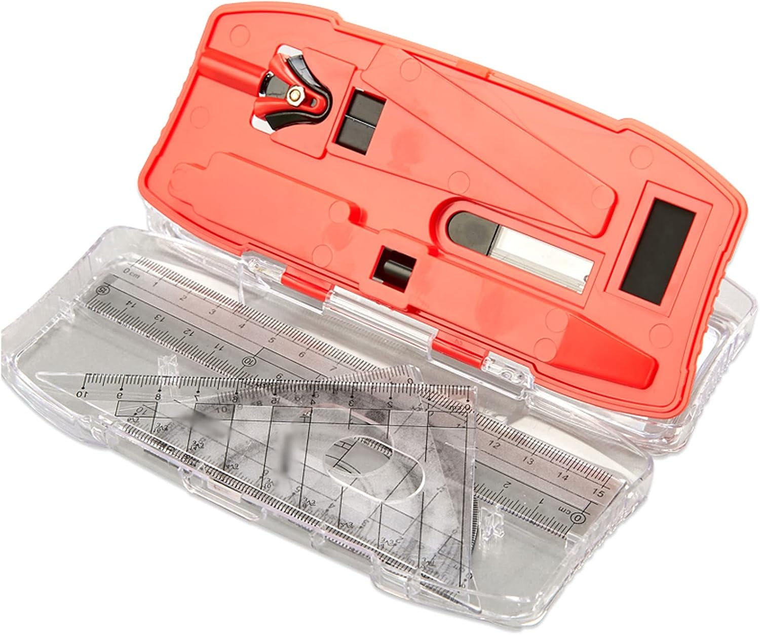 I prodotti includono: compasso, portamine, gomma, nucleo della penna, righello, 2 triangoli (45° e 30°/60°), protreseur. Dimensioni del prodotto: 17*7,5 cm/6,69*2,95 pollici. Materiale del prodotto: materiale in lega di alluminio, materiale PS, nessun odore particolare Caratteristiche del prodotto: 1. Ogni righello è progettato con cura con misurazioni chiare e misurazioni accurate;2. Funzioni complete ed alta realizzabilità;3. Le bussole in metallo sono comode e pratiche e il disegno è preciso.