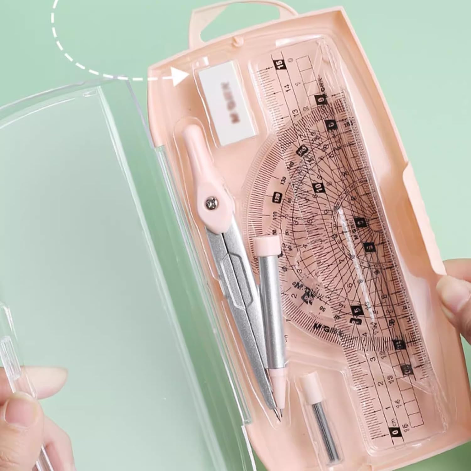 Tutto ciò di cui hai bisogno per le lezioni di matematica - Include 1 goniometro, 1 compasso, 1 ricarica di piombo, 2 righelli triangolari, 1 righello dritto e 1 gomma. Materiale: il set geometrico è realizzato in materiale plastico, leggero, facile e comodo da mettere nello zaino o in ufficio. Dimensioni della scatola: 18,5*8,5*2,5 cm/7,28*3,3*0,98 pollici; mantieni gli strumenti in un unico posto Il goniometro in plastica trasparente ti semplifica la misurazione, puoi misurare da 0 a 180 gradi da sinistra a destra e da destra a sinistra Il set di matematica/geometria progettato con tutti gli elementi essenziali per insegnanti e studenti di tutti i livelli; È anche un regalo perfetto per i tuoi bambini e amici. Adatto a insegnanti e studenti, il nostro set di compassi può disegnare qualsiasi forma geometrica.