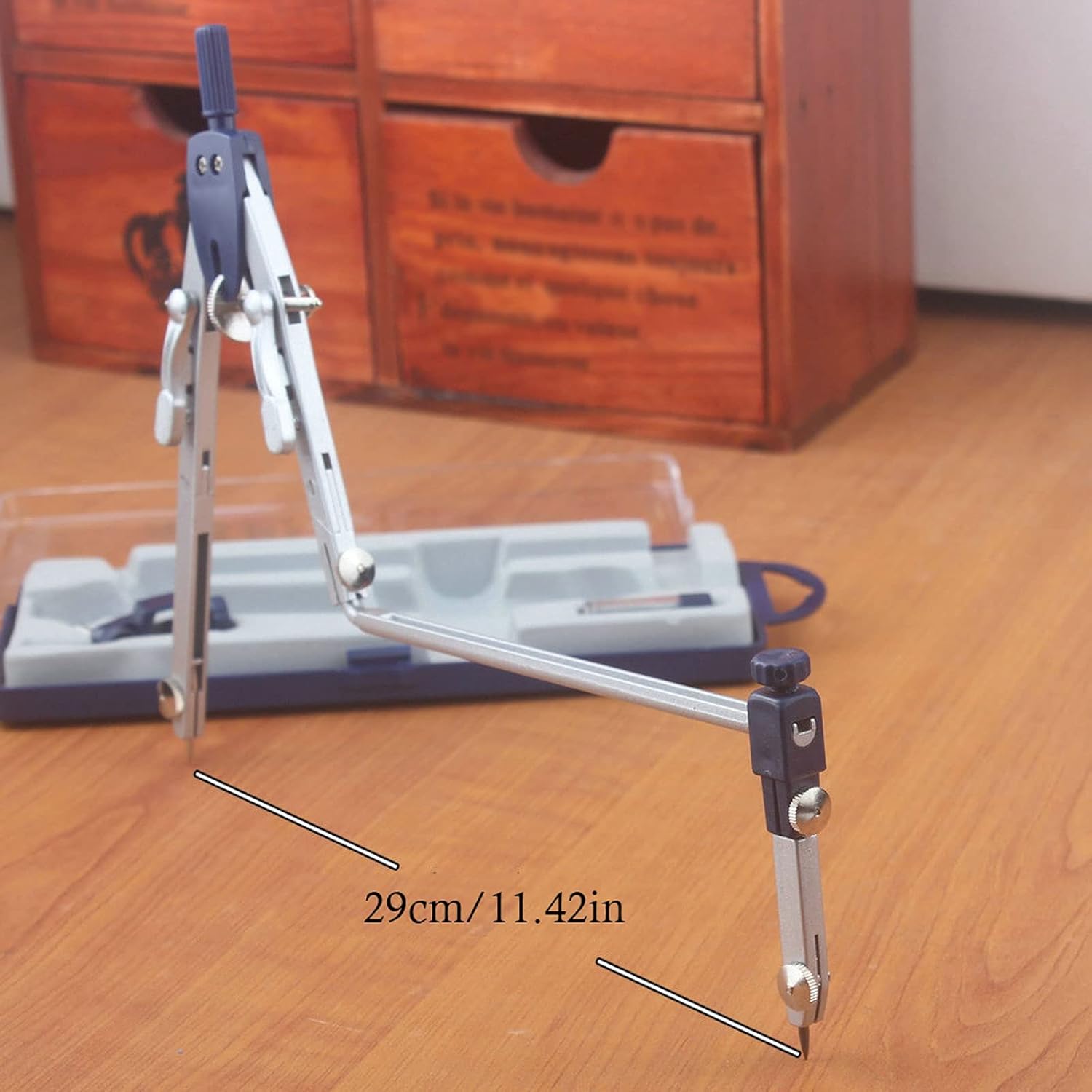 Strumenti pratici: perfetti per studenti, insegnanti, esperti di matematica, architetti, ingegneri, artisti, designer di qualsiasi livello. Può essere utilizzato a scuola, in ufficio, a casa o al lavoro. I compassi da disegno professionali sono più grandi dei compassi generali e possono essere dotati di penne. Disegna un cerchio e fai un disegno. Il diametro massimo del cerchio è 58 cm/22,83 pollici dopo aver collegato il braccio lungo, con poche vibrazioni e facile da usare. La bussola è lunga 16,5 cm / 6,50 pollici. Il braccio esteso è formato integralmente senza allentarsi e il design della scanalatura si muove agevolmente.