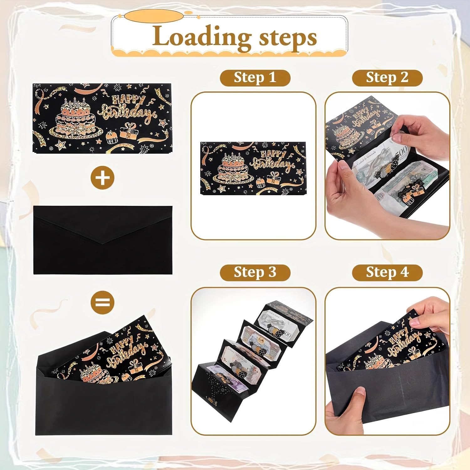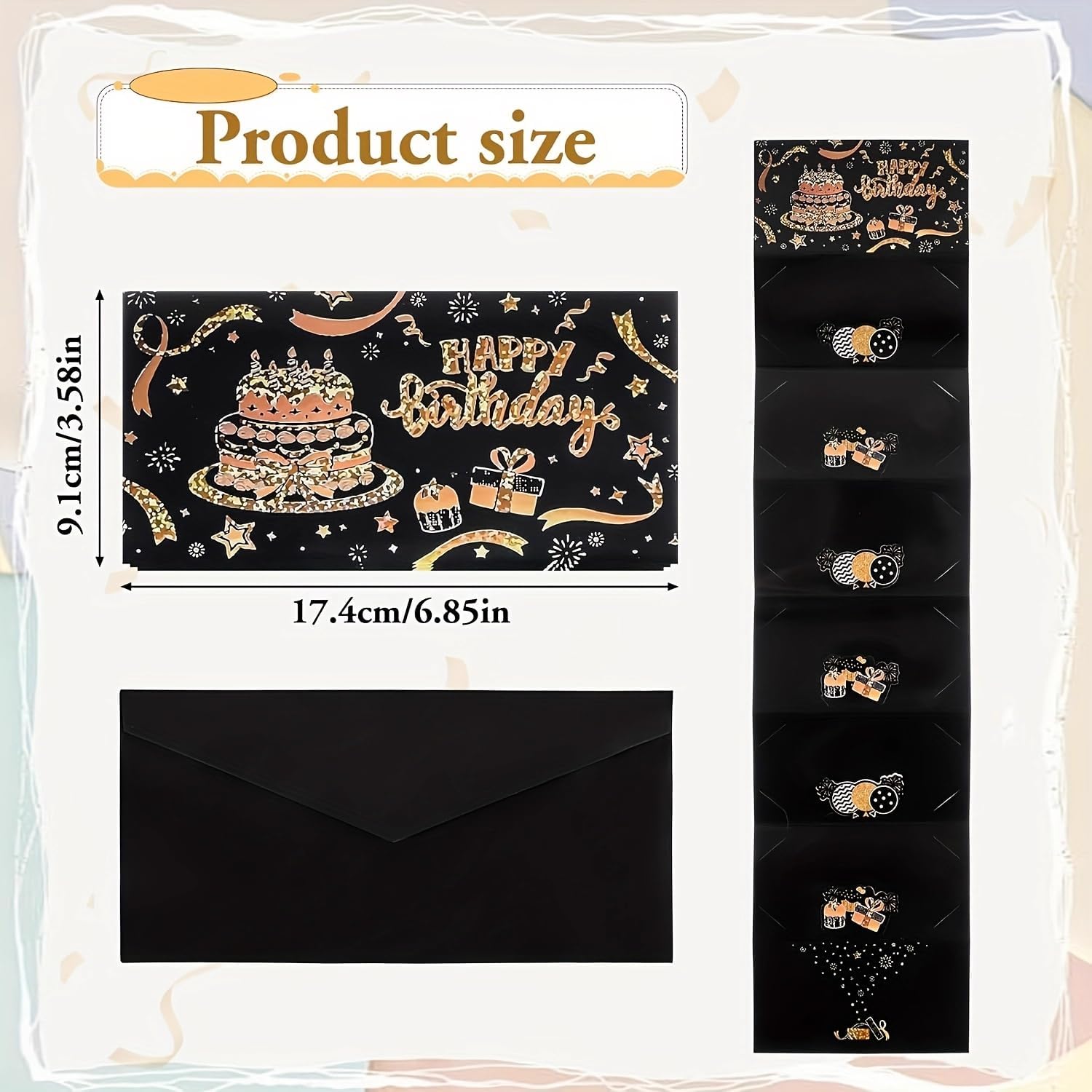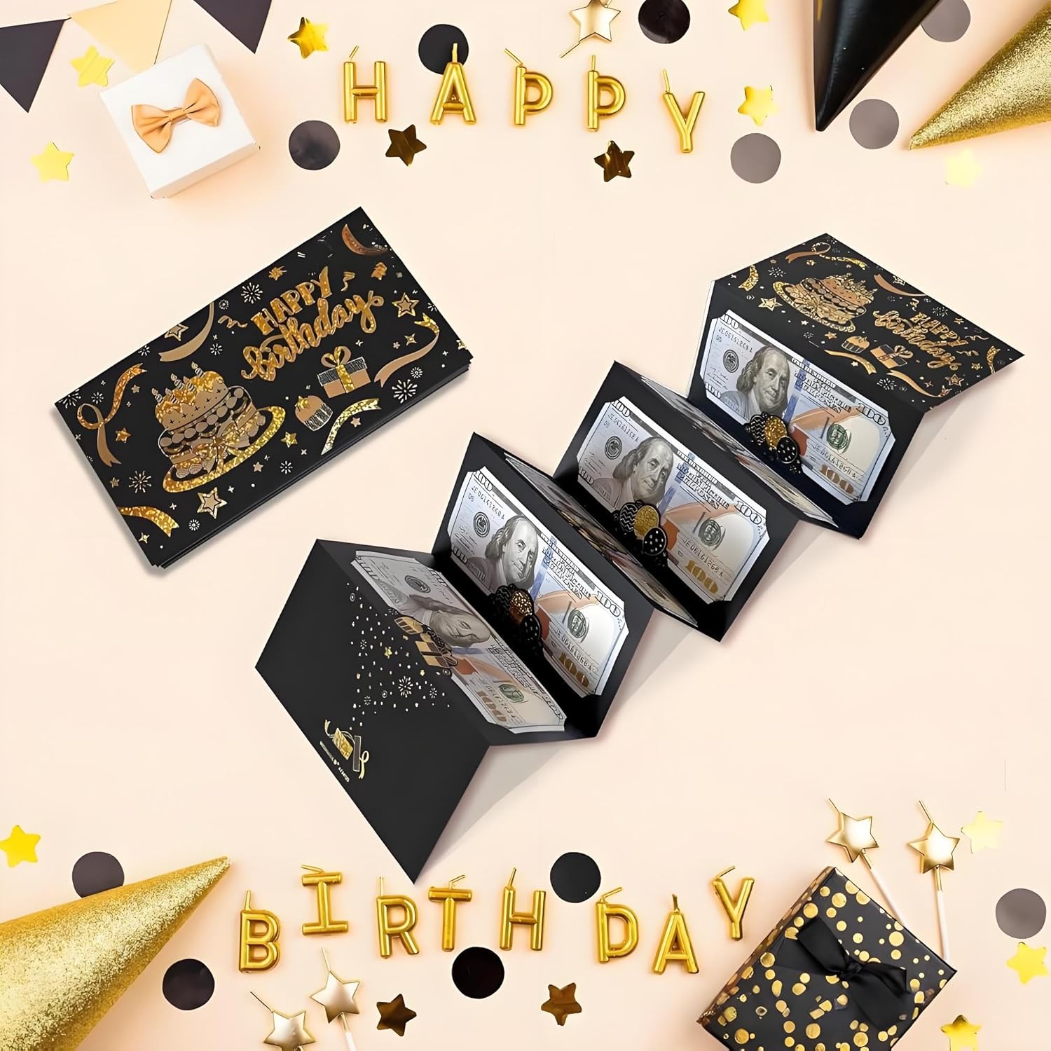 Elegante design nero e oro: la busta per soldi di compleanno presenta un sofisticato sfondo nero con lussuose lettere dorate, mostrando "Happy Birthday" in uno stile finemente realizzato. La sua finitura scintillante aggiunge un tocco di festa, rendendolo un accessorio regalo visivamente sorprendente per ogni occasione speciale. Sei pratiche slot per contanti: progettata con sei slot dedicati per contenere saldamente regali in contanti, questa busta ti consente di presentare denaro in modo creativo e organizzato. Offre un modo sorprendente e memorabile per fare regali monetari, assicurando che il destinatario scopre il tesoro nascosto con eccitazione. Ideale per compleanni traguardi: adatto per festeggiare compleanni di tutte le età, che si tratti di un 16°, 18°, 21°, 30°, 40°, 50° o oltre, questo biglietto aggiunge un tocco premuroso al tuo regalo. È perfetto per uomini, donne, ragazze e ragazzi, rendendolo una scelta versatile per familiari e amici. Crea ricordi duraturi: più di un semplice biglietto, questo porta soldi funge da ricordo che può essere amato per anni. La combinazione di un design elegante e un regalo monetario lo trasforma in un ricordo significativo che riflette la tua generosità e attenzione ai dettagli. Regalo perfetto per qualsiasi celebrazione: che si tratti di una festa di compleanno, di un evento importante o di una riunione a sorpresa, questa busta per contanti migliora la gioia di fare un regalo. Il suo aspetto raffinato e il design funzionale lo rendono un'ottima scelta per chi vuole offrire stile e praticità.