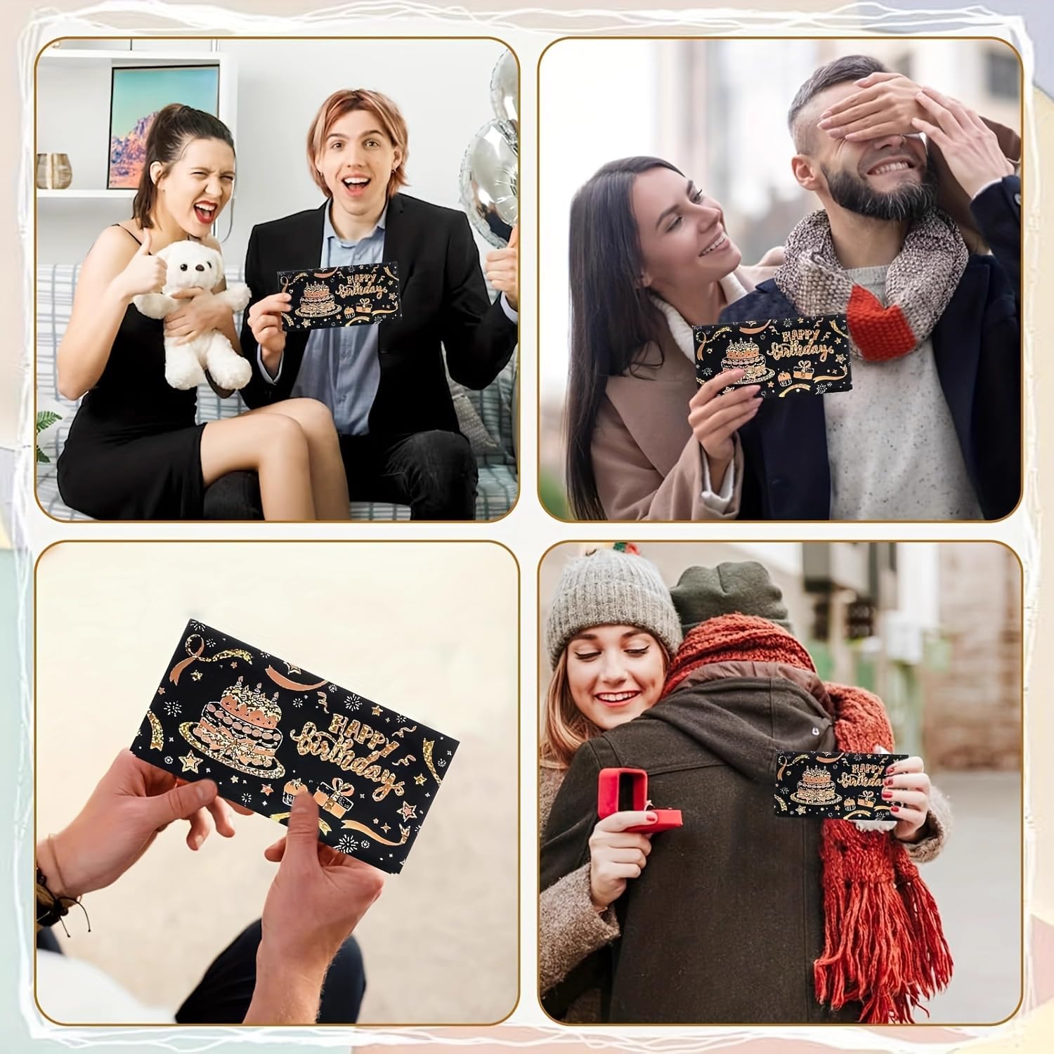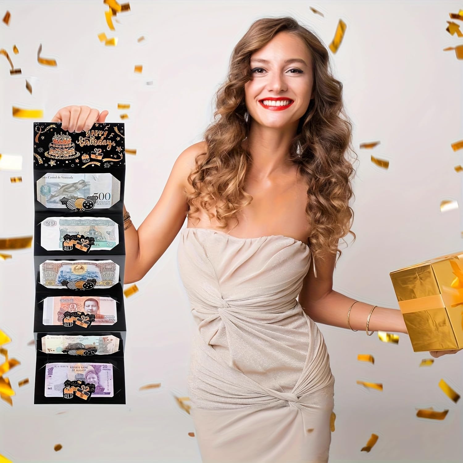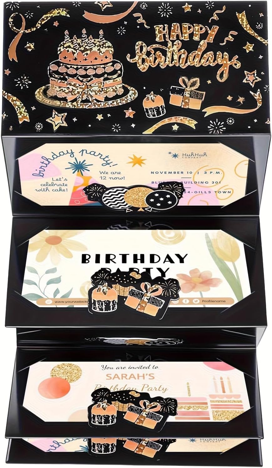 Elegante design nero e oro: la busta per soldi di compleanno presenta un sofisticato sfondo nero con lussuose lettere dorate, mostrando "Happy Birthday" in uno stile finemente realizzato. La sua finitura scintillante aggiunge un tocco di festa, rendendolo un accessorio regalo visivamente sorprendente per ogni occasione speciale. Sei pratiche slot per contanti: progettata con sei slot dedicati per contenere saldamente regali in contanti, questa busta ti consente di presentare denaro in modo creativo e organizzato. Offre un modo sorprendente e memorabile per fare regali monetari, assicurando che il destinatario scopre il tesoro nascosto con eccitazione. Ideale per compleanni traguardi: adatto per festeggiare compleanni di tutte le età, che si tratti di un 16°, 18°, 21°, 30°, 40°, 50° o oltre, questo biglietto aggiunge un tocco premuroso al tuo regalo. È perfetto per uomini, donne, ragazze e ragazzi, rendendolo una scelta versatile per familiari e amici. Crea ricordi duraturi: più di un semplice biglietto, questo porta soldi funge da ricordo che può essere amato per anni. La combinazione di un design elegante e un regalo monetario lo trasforma in un ricordo significativo che riflette la tua generosità e attenzione ai dettagli. Regalo perfetto per qualsiasi celebrazione: che si tratti di una festa di compleanno, di un evento importante o di una riunione a sorpresa, questa busta per contanti migliora la gioia di fare un regalo. Il suo aspetto raffinato e il design funzionale lo rendono un'ottima scelta per chi vuole offrire stile e praticità.