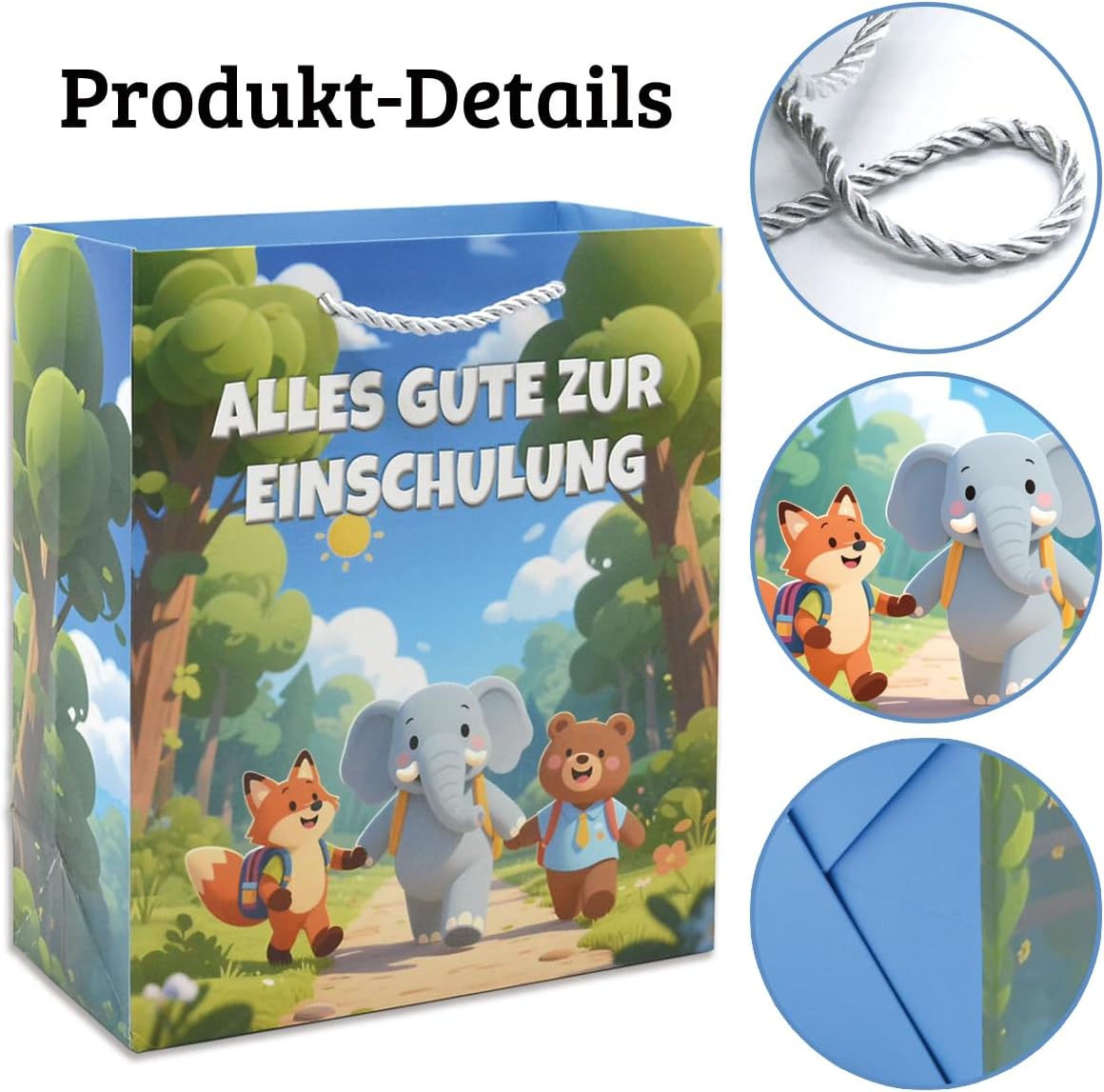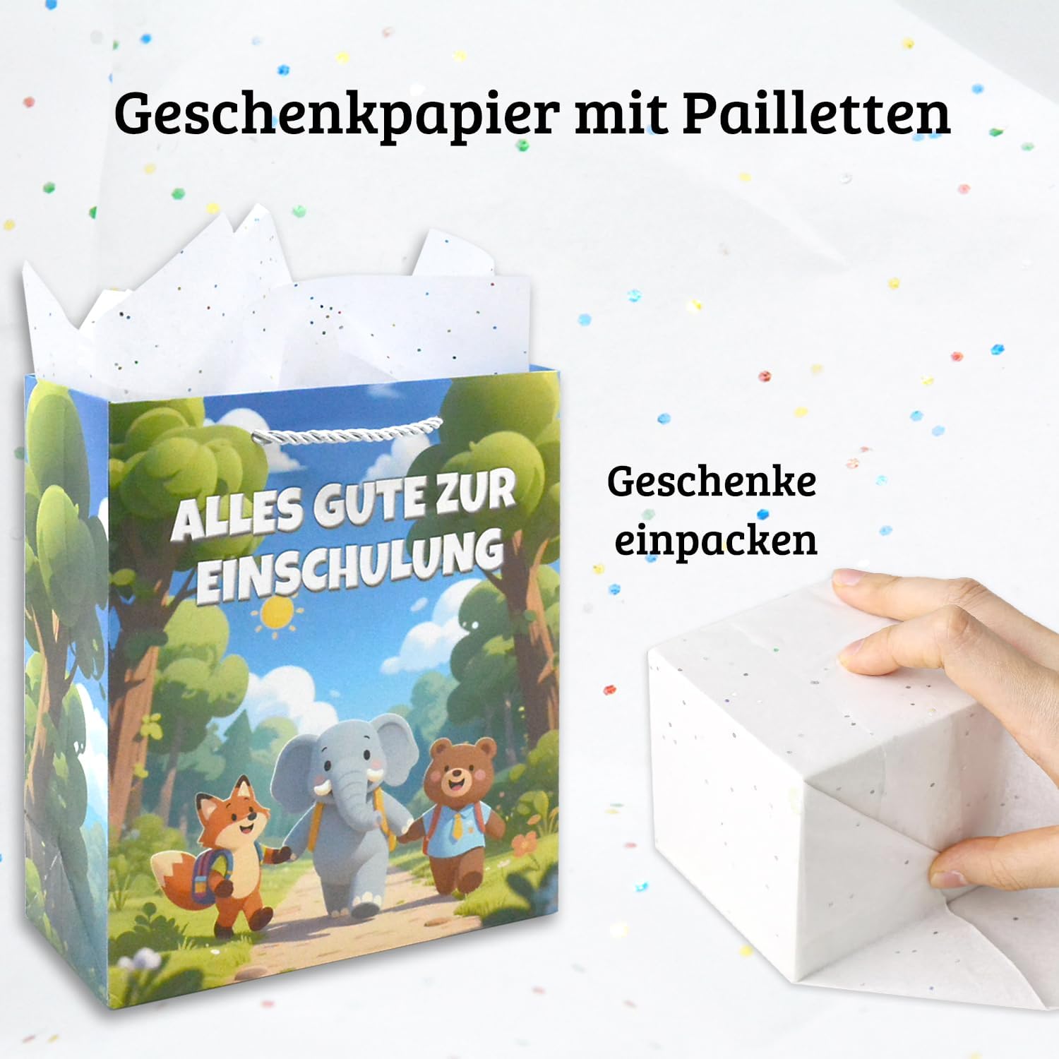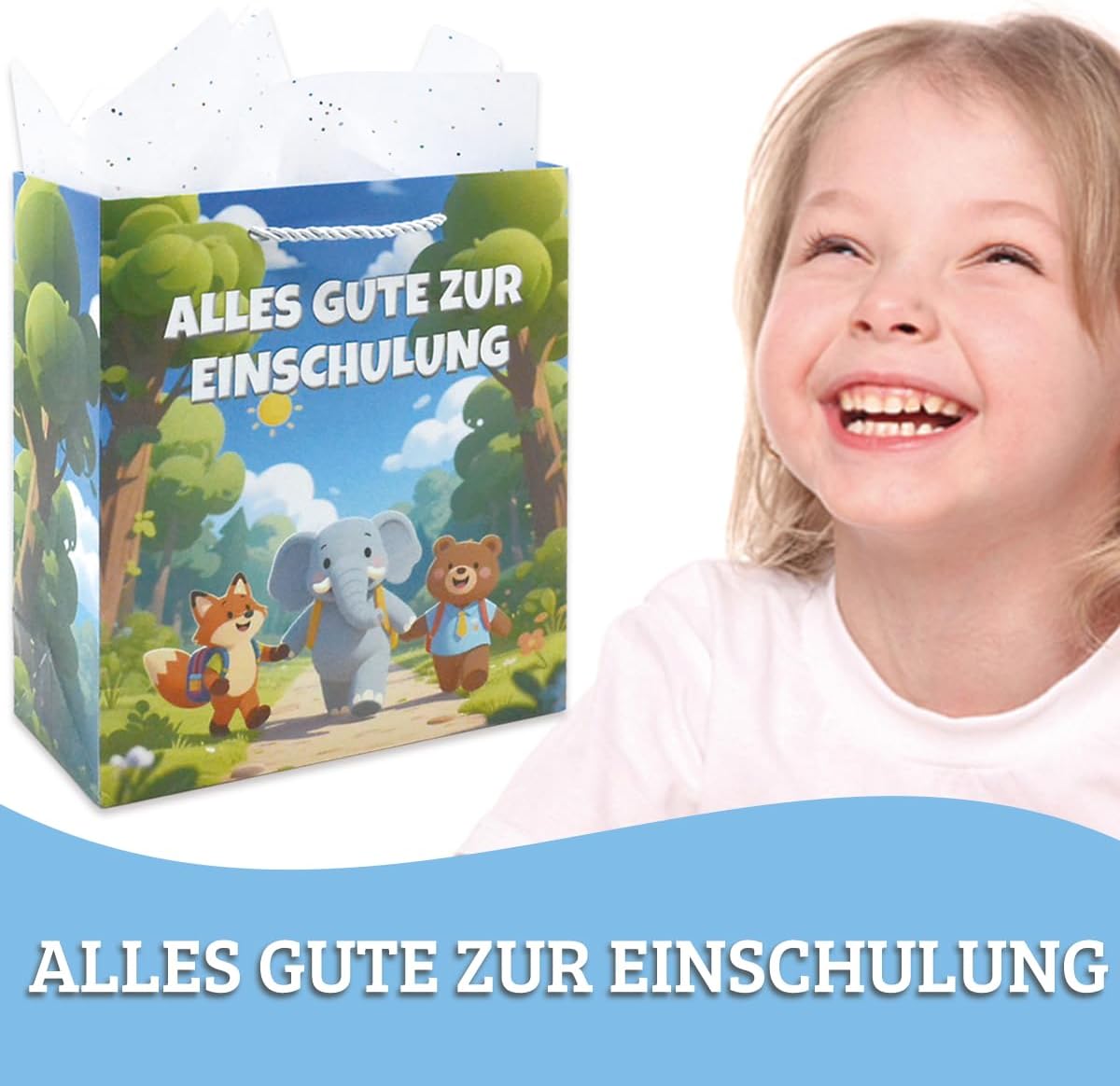 Caratteristiche: 1 set di sacchetti regalo per scolari in carta con manici + 2 set di carta velina, il sacchetto regalo viene fornito con "HAPPY FOR SCHOOL" e motivi di animali stampati per le occasioni speciali. 𝑮𝒓öß𝒆:Sacchetto regalo: 26 x 22 x 10 cm; Carta velina: 50 x 70 cm; La carta velina è perfetta per decorare la borsa o per incartare piccoli regali. 𝑸𝒖𝒂𝒍𝒊𝒕ä𝒕: Sacchetti regalo in carta particolarmente resistenti: riutilizzabili, riciclabili, rispettosi dell'ambiente, degradabili e compostabili. Grande valore: quello perfetto Accessori decorativi per l'inizio della scuola, l'inizio della scuola, l'inizio della scuola per scolari, ragazze e ragazzi. Facile da trasportare: ampio spazio per regali, regali in contanti, dolcetti o bomboniere: le robuste borse con manici con coulisse sono particolarmente facili da trasportare.