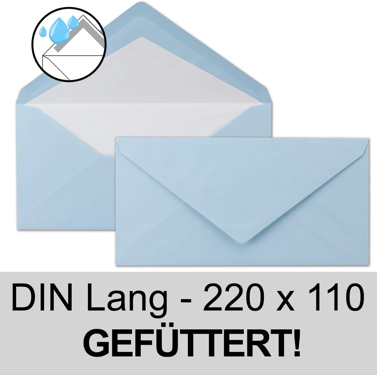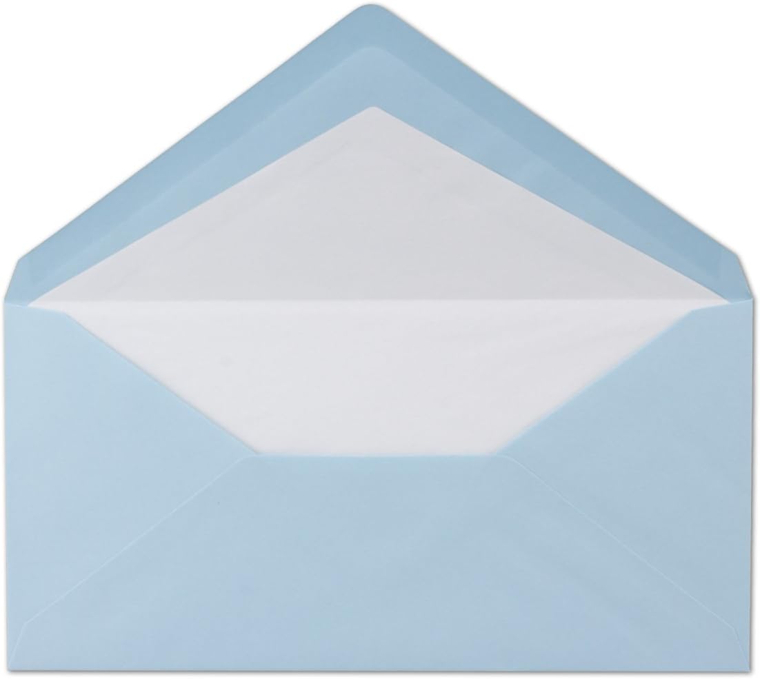 Con buste colorate foderate con carta velina bianca, le vostre lettere, inviti o lettere commerciali sembrano pregiati e nobili. Stampabile con qualsiasi stampante, scrivibile con qualsiasi penna. Provate una penna oro o argento – il risultato vi sorprenderà Colore: azzurro – Fodera: bianco – Grammatura: 80 g/m² – carta colorata con superficie opaca rendono le vostre lettere o inviti per matrimonio o compleanno una vera attrazione Formato: DIN lungo, dimensioni 220 x 110 mm o 11 x 22 cm, con incollaggio a umido (gommatura), senza finestra, adatto per biglietti DIN lunghi o lettere DIN A4 Caratteristiche: carta fine da 80 g/m² – con fodera in seta fine, assolutamente opaca, aletta gommata appuntita da inserire o incollare Contenuto: 25 buste. Produzione e vendita dalla Germania. - GUSTAV NEUSER: i professionisti della carta e dei biglietti da oltre 100 anni