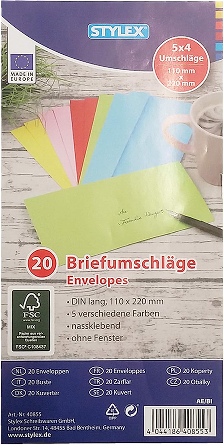 Formato: DIN lungo Dimensioni: 110 x 220 mm Con adesivo umettabile, senza finestra Colori assortiti in verde, blu, rosso, rosa, giallo