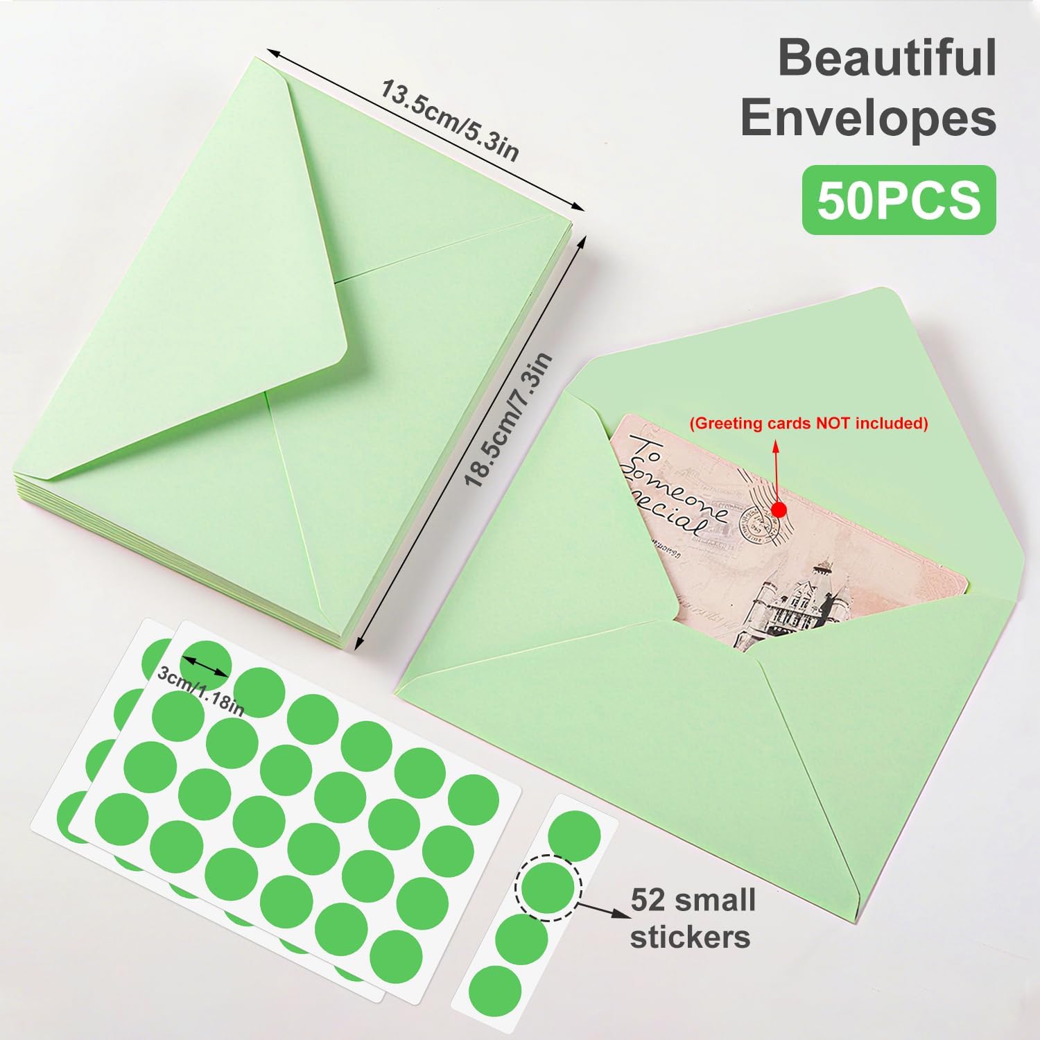 MOLTO BELLE E RESISTENTI: Ottime buste, Carta spessa, importante, elegante. Non sono sbiadite nonostante siano esposte alla luce in libreria proprio davanti a una finestra. Buona fattura e resistenti, di buona qualità, piacevoli al tatto, riutilizzabili e dall'aspetto classico. FAI DA TE: Le copertine di queste buste sono vuote, buone per le forniture di bricolage e per creare il tuo stile personale, puoi disegnare qualsiasi immagine o scrivere qualsiasi cosa tu voglia. Sono scrivibili e stampabili (con laser e a getto d'inchiostro). Si prega di verificare prima la compatibilità della rispettiva stampante. UTILI: Lascia che ti parli di queste 18,5 x 13,5 cm color verde con chiusura a umido e patella a punta. Grammatura, 110 g/m². La chiusura a umido con patella a punta è un altro dettaglio che fa la differenza. Inoltre, il formato è pratico e adatto a diverse esigenze. Se stai spedendo qualcosa di speciale, qui ogni particolare conta — e queste buste lo capiscono. BUSTE ELEGANTI E A BUON MERCATO: La confezione contiene 50 buste. Perfetta se hai bisogno di una buona quantità senza dover acquistare stock industriali. Eleganti, solide e raffinate, danno valore a ciò che contengono ancora prima che venga aperto. BUSTE LETTERE: Belle bustine colorate. Adatte ad ogni ricorrenza. Ottime come partecipazioni di matrimonio. Ideali per poter scrivere vari auguri personalizzati. Perfette per inviti, biglietti personalizzati, eventi o anche solo per aggiungere un tocco in più alle tue spedizioni.