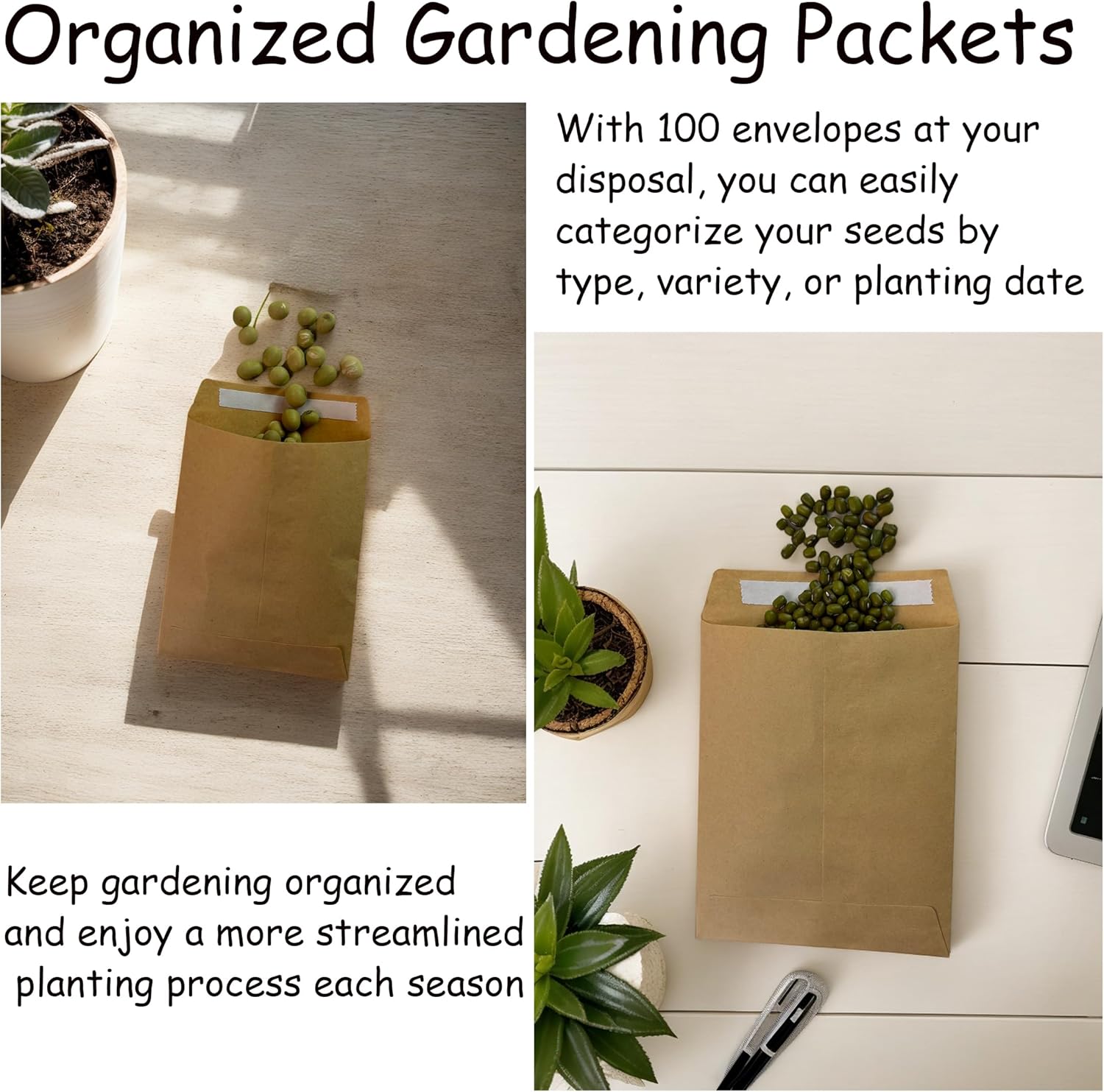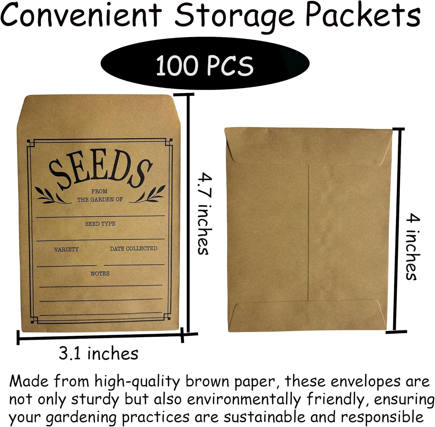 Contenuto della confezione: set di 100 buste di carta marrone per semi, ognuna misura 7,9 x 10,2 cm, perfette per riporre e organizzare i semi del tuo giardino Design richiudibile: il sistema di chiusura autoadesivo consente molteplici usi mantenendo i semi conservati in modo sicuro e protetti dall'umidità CARATTERISTICHE DELL'ORGANIZZAZIONE: Campi prestampati per la registrazione del tipo di seme, varietà, data raccolta e note aggiuntive per la conservazione sistematica dei semi Dimensioni pratiche: le dimensioni compatte di 7,9 x 11,9 cm rendono queste buste ideali per riporre semi di verdure e fiori di varie dimensioni Struttura durevole: realizzata in robusta carta marrone che fornisce una protezione affidabile e mantiene la vitalità dei semi durante la conservazione