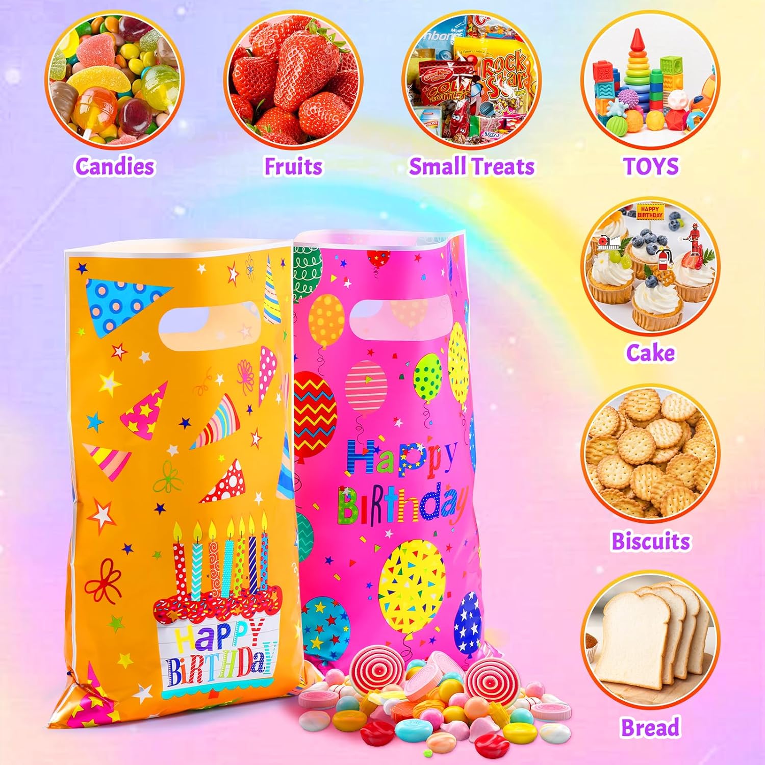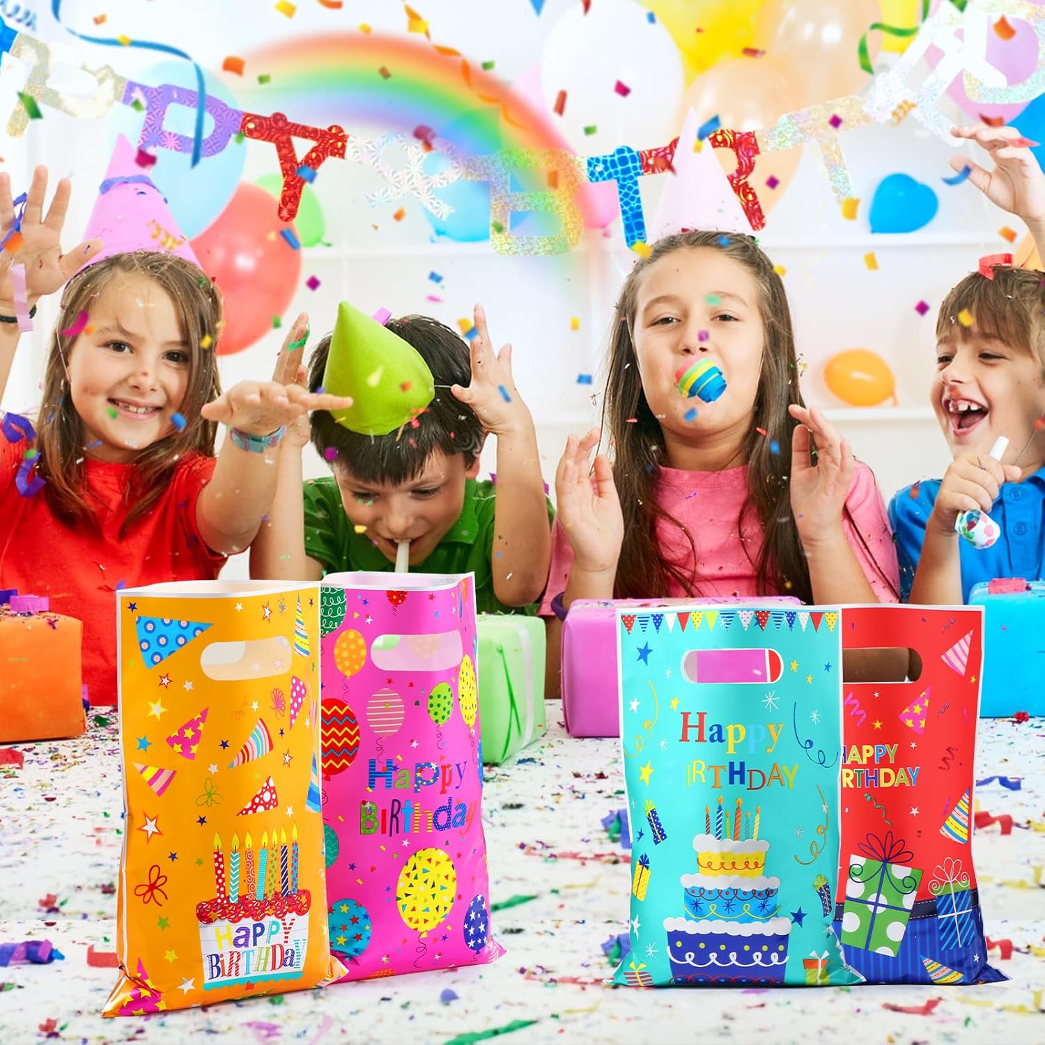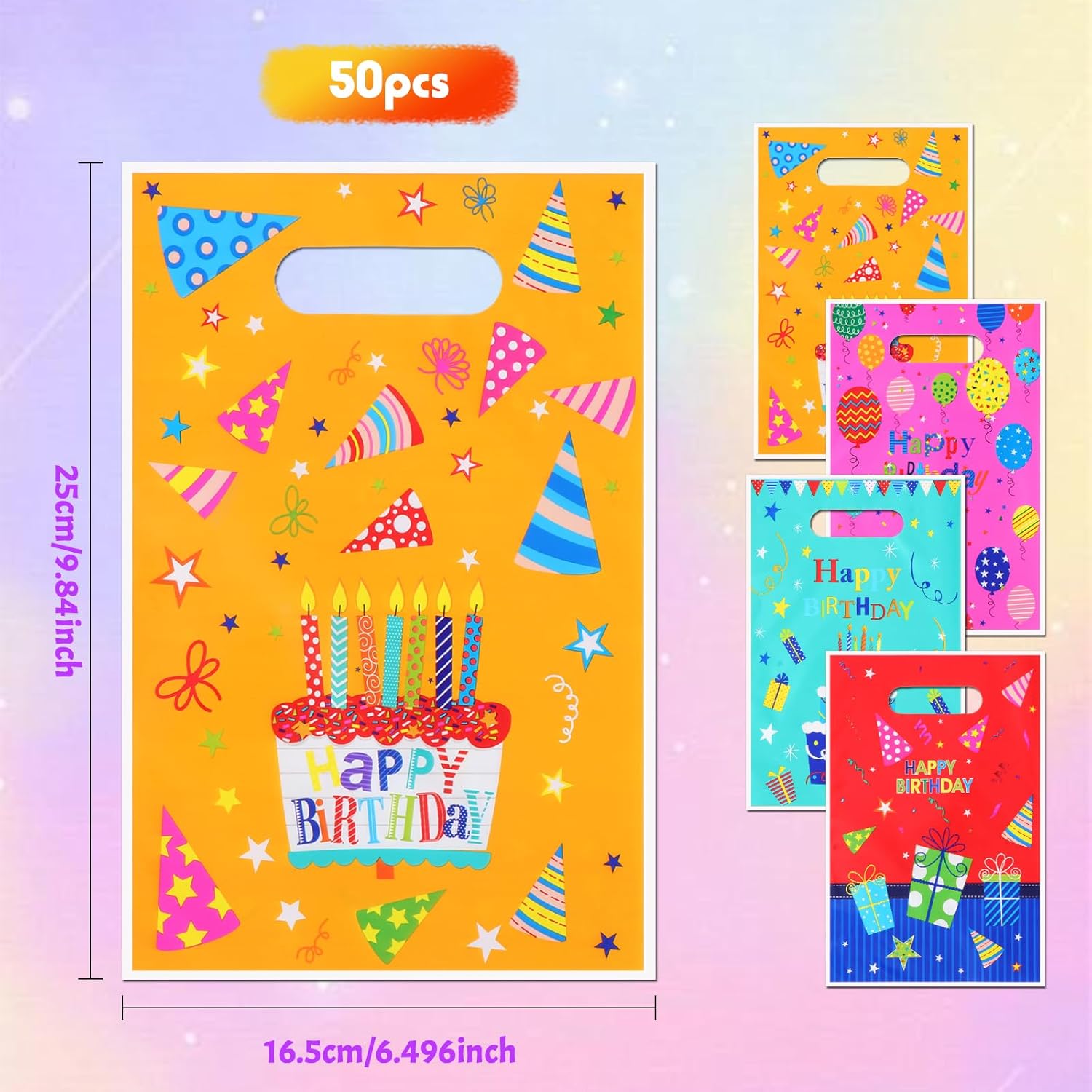 Set generoso: ogni set contiene 50 piccoli sacchetti regalo di 16,5x25 cm. Lo spazioso scomparto offre spazio per tutti i tipi di regali. I quattro colori (giallo, turchese, rosa, rosso) per un abbinamento ricco. Materiale durevole: plastiche di alta qualità accuratamente selezionate, realizzate con perizia, assicurano che le borse di compleanno per bambini siano robuste e resistenti agli strappi e non vengano danneggiate anche dopo un uso ripetuto. Un colpo d'occhio dolce e colorato: le borse per il compleanno dei bambini sono a tema con elementi infantili come palloncini, torte e regali, con colori vivaci e stampa ad alta risoluzione, e ogni modello trasuda vitalità Design pratico e facile da usare: le borse per borse da festa hanno un'eccellente capacità di carico, sono stabili, non stringono le mani e non sono facili da rompere Regalo ideale: adatto per fai da te, artigianato, decorazione e imballaggio, souvenir e compleanni. Puoi combinare liberamente borse compleanno in diversi colori per esprimere i tuoi pensieri