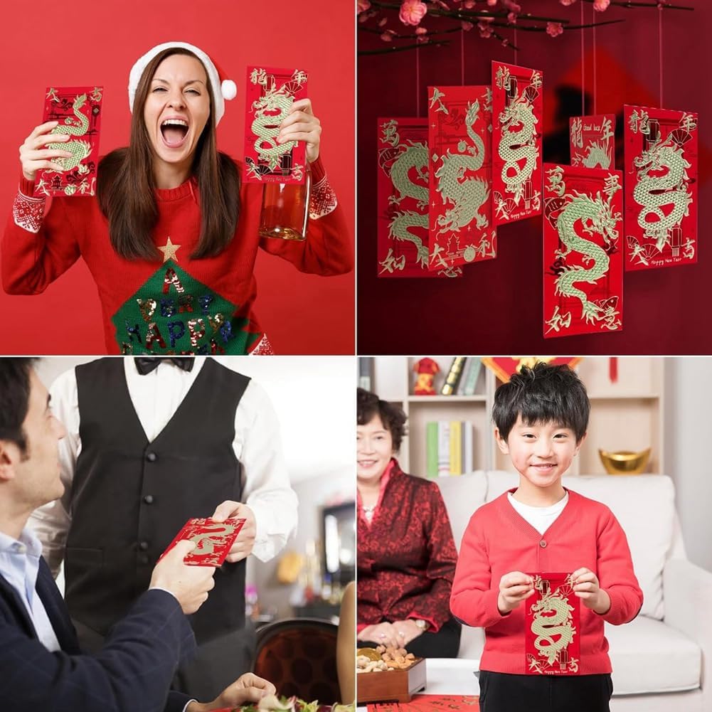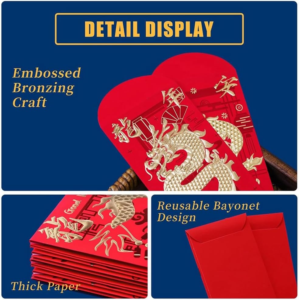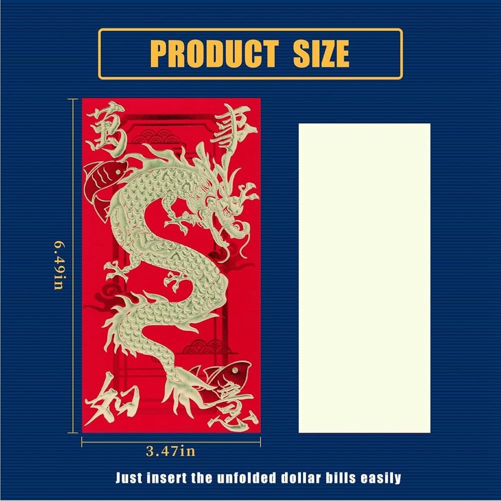 Buste rosse per Capodanno cinese: le buste rosse significano i migliori auguri e per te e per gli altri durante l'anno 2024 ed esprimono i tuoi ringraziamenti e desideri nella cultura cinese Materiale di buona qualità: realizzate in carta spessa, le buste per il capodanno lunare sono e non si rompono facilmente. La chiusura con linguetta e fessura, quindi non è necessario leccare o attaccare nulla 6: Le buste rosse del capodanno cinese sono decorate con 6 diverse forme e caratteri cinesi. La lamina dorata è molto lucida e la goffratura è bella e delicata Ampia applicazione: la busta rossa è perfetta per presentare regali in denaro alla famiglia, una grande aggiunta alle celebrazioni del capodanno cinese, utilizzata per decorazioni e bomboniere e così via La confezione contiene: 18 buste dell'anno del drago rosso, 6 motivi, 3 per ciascuno delle dimensioni di 17 x 9 cm, perfette per banconote da dollari, non c'è bisogno di piegarle