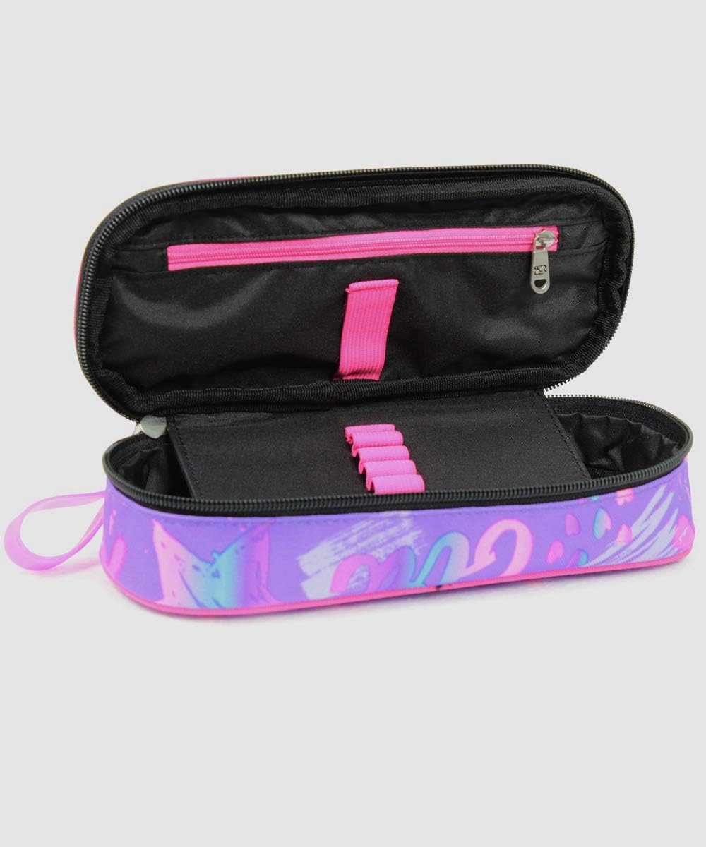 Dimensioni: 10x23x5,5 cm Caratteristiche: pattina interna attrezzata con passanti elastici porta penne Tasche: taschino interno con zip Altre caratteristiche: logo in gomma, tirazip in silicone