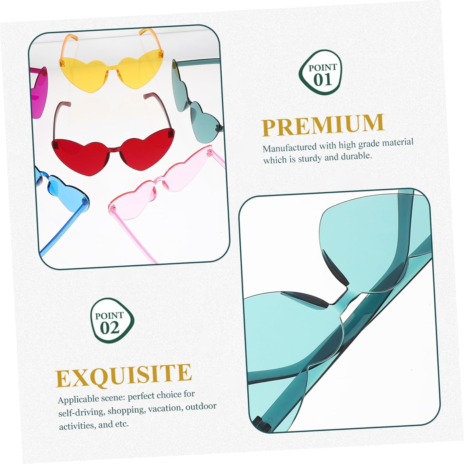 Il pacchetto include 6 occhiali da sole senza montatura Caratteristiche -Colore: occhiali da sole senza montatura a forma di cuore di colori assortiti per -Materiale: PC, graziosi occhiali da sole da donna - Dimensioni: occhiali da sole bomboniere 15,00X15,00X6,00cm/5,89X5,89X2,36in - Scenario applicabile: scelta perfetta per guida autonoma, shopping, vacanze, attività all'aperto e occhiali da sole a forma di cuore ecc. - Lavorazione eccezionale, design ragionevole, stabili e pratici, vi regaleranno una buona esperienza di utilizzo degli occhiali da sole come bomboniere. - Perfetti per Natale, compleanno, Halloween e altre feste con una varietà di outfit per mostrare il tuo senso della moda: occhiali da sole per San - Deliziosi e affascinanti occhiali da sole a forma di cuore con montatura senza montatura che completeranno il tuo look da occhiali da sole da donna. - Belli ed eleganti, impreziosiscono il tuo viso. Sono un fantastico, i tuoi amici li adoreranno. Occhiali da sole senza montatura da donna. Informazioni sulle merci occhiali da sole senza montatura a forma di cuore per Quantità sufficiente per la tua scelta, puoi scegliere questi occhiali da sole da festa e condividerli con i tuoi amici e familiari.occhiali da sole in plastica Gli occhiali da sole senza montatura per le donne sono lisci e non danneggeranno il viso, offrendoti un'esperienza di utilizzo e vestizione comoda per il tuo
