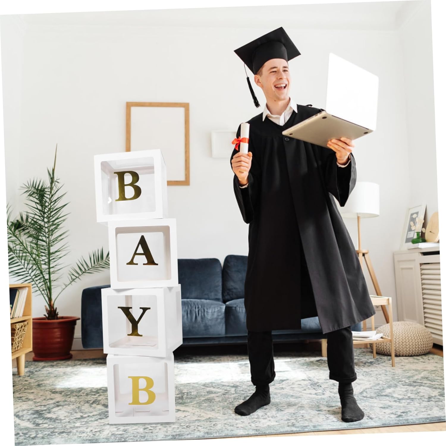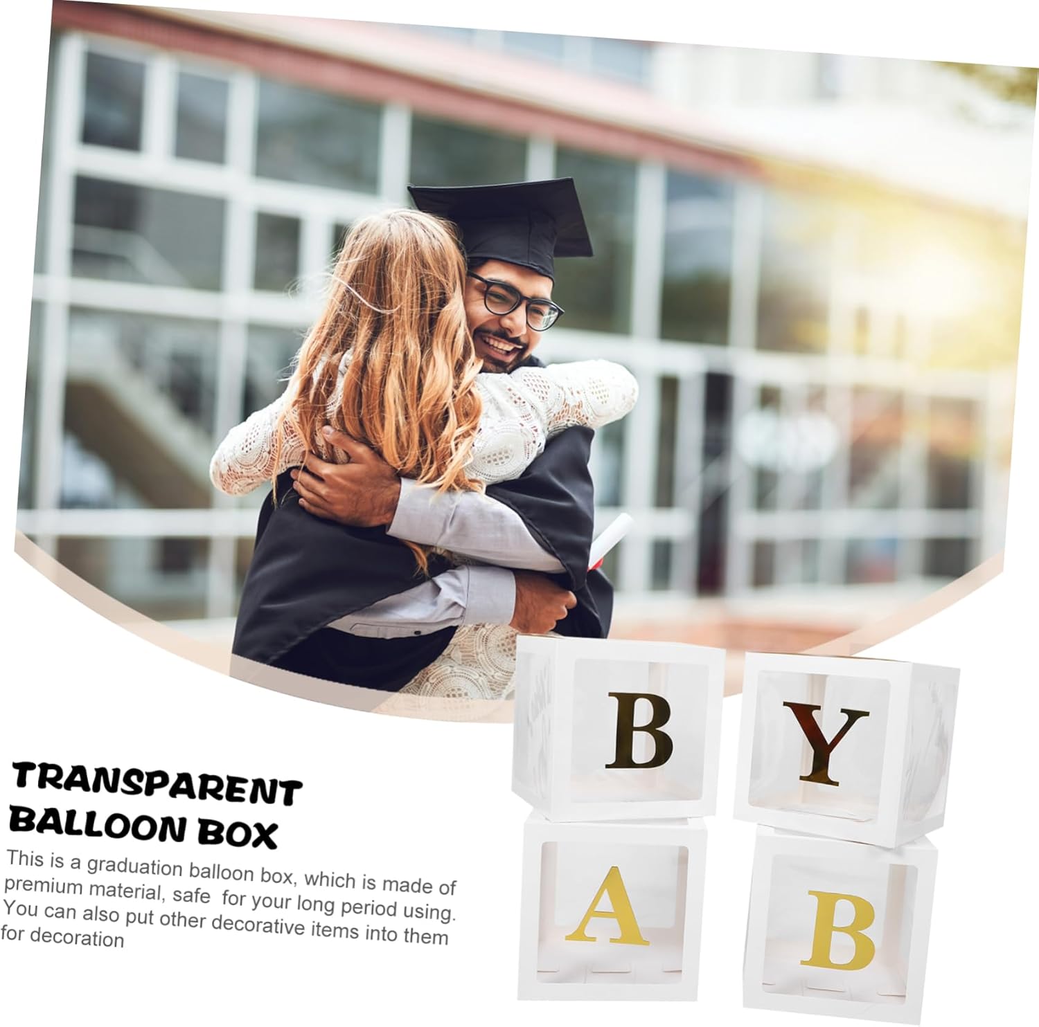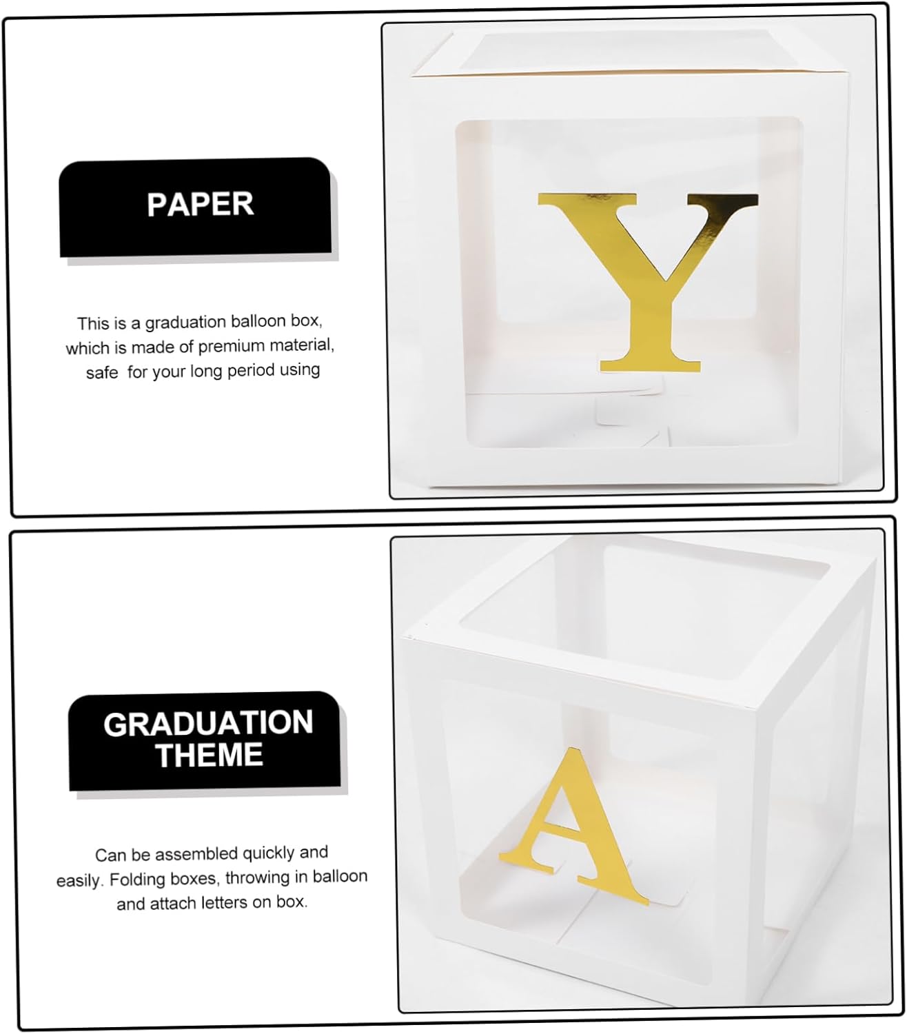 Scatole per palloncini quadrate: realizzate in pvc e carta, resistenti all'usura e durevoli, non facili da danneggiare, scatole per palloncini con palloncino Scatole di palloncini per laurea: possono aiutare a creare un'atmosfera calda e festa di laurea e sono un oggetto di scena per la fotografia, decorazioni per feste di laurea Forniture per feste di laurea: l'installazione pieghevole della scatola dei palloncini è semplice, comoda e veloce, facile da usare, decorazioni per feste di laurea Decorazioni per feste di laurea - realizzate in pvc e materiale di carta, molto e adatte per decorare, scatole di palloncini con lettere Scatole di palloncini con lettere: attacca la lettera sulla scatola con la colla inclusa, infine, metti diversi palloncini nella scatola, decorazioni per la festa di laurea
