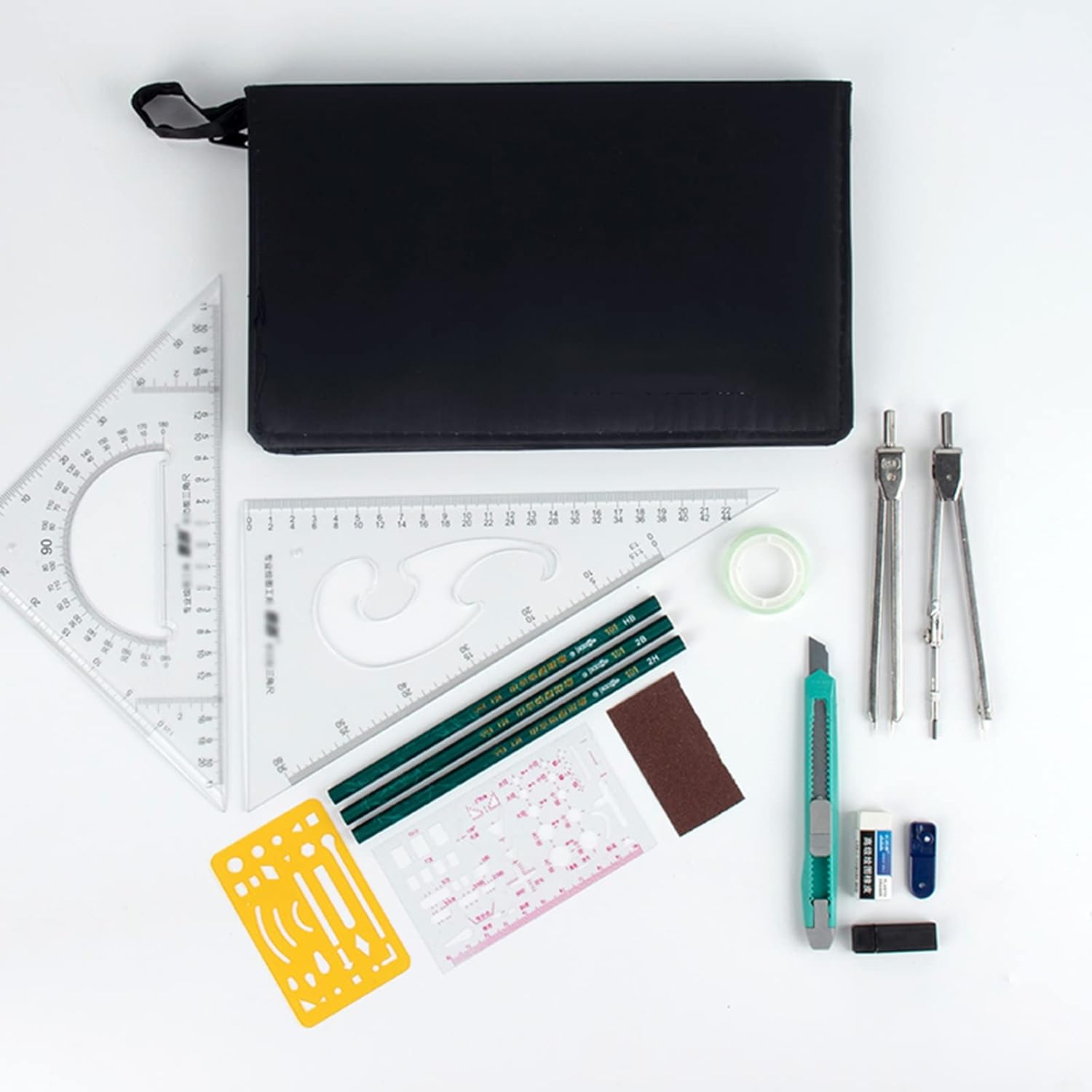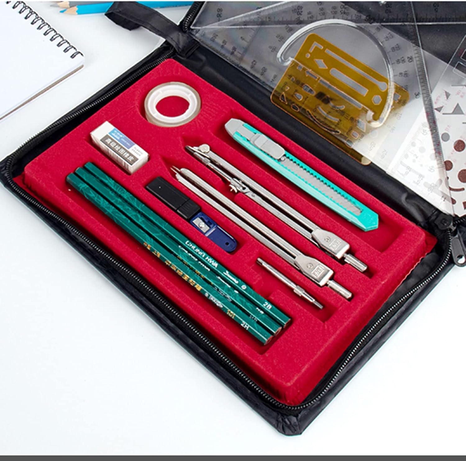 Set kit geometria per realizzare schede didattiche e di studio di disegno di ingegneria architettura, lavorazione del legno. Design dall'aspetto classico, sensazione di comfort, precisione precisa, plotter professionale, la confezione esterna è facile da trasportare con borse di stoffa. Il kit di geometria include: 2b/2h/h BX1, COLTELLO MESO X1, COLLA PER CANCELLERIA X1, Gomma 4B X1, Calibro grandex1, Bussola Per scambiare altre monete, usa il bastone ARM, disegna cerchi più grandi. È possibile applicare diversi strumenti a piacere ed è sufficiente un pacchetto di disegno.