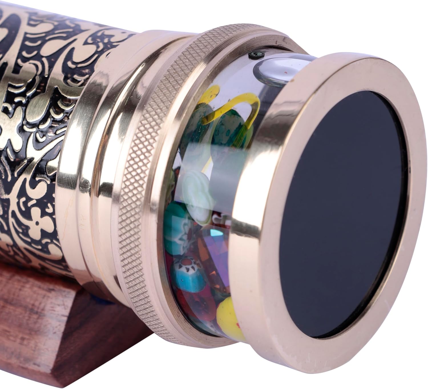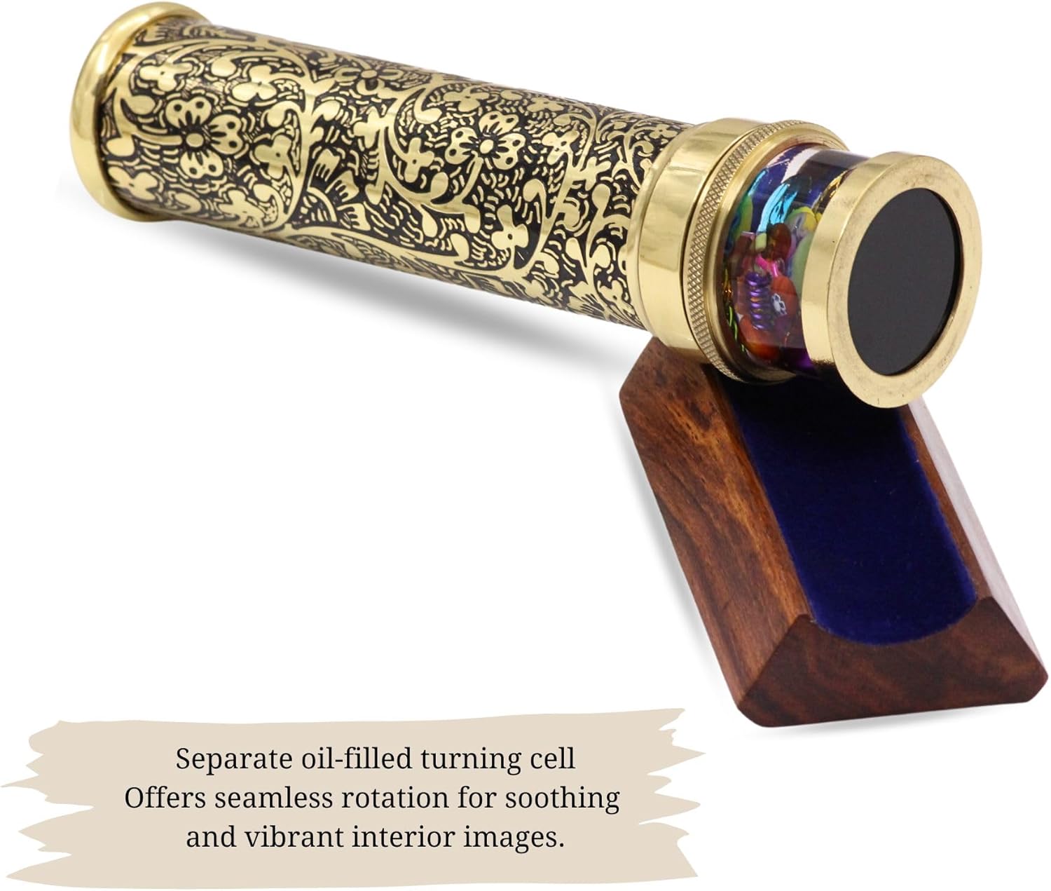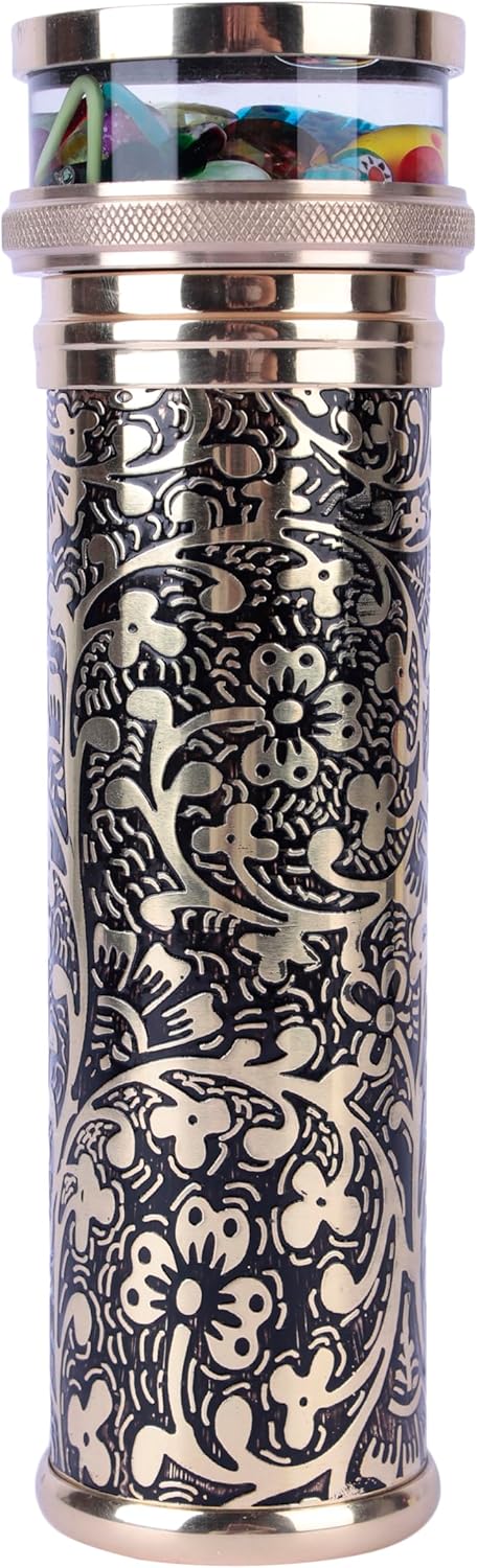 Costruzione in ottone artigianale: realizzata da abili artigiani in India con ottone massiccio, disegni floreali incisi con acido, una finitura patina nera e rivestimento laccato protettivo per qualità cimelio. Modelli visivi abbaglianti: dispone di un sistema a tre specchi e di una cella rotante riempita di olio separata per creare modelli vibranti e in continua evoluzione ad ogni rotazione fluida. Rotazione senza sforzo: dotato di un sistema di cuscinetti lisci di precisione per una rotazione facile, silenziosa e senza soluzione di continuità per goderti le tue esplosioni di colore e disegni preferiti. Elegante base per espositore: include un supporto in legno massello (10,3 x 5,8 cm) per una visualizzazione stabile ed elegante su qualsiasi scrivania, scaffale o custodia da collezione. Chiarezza visiva superiore: lo specchio frontale di alta qualità offre immagini interne nitide, luminose e affascinanti per un'esperienza visiva senza pari. Rilassante e terapeutico: le cellule piene di olio forniscono movimenti fluidi e calmanti, perfetti per la meditazione, il rilassamento o il sollievo dallo stress. Tesoro da collezione: un'aggiunta sorprendente per gli amanti dell'arte, i collezionisti vintage e chiunque cerchi un complemento d'arredo bello e funzionale.