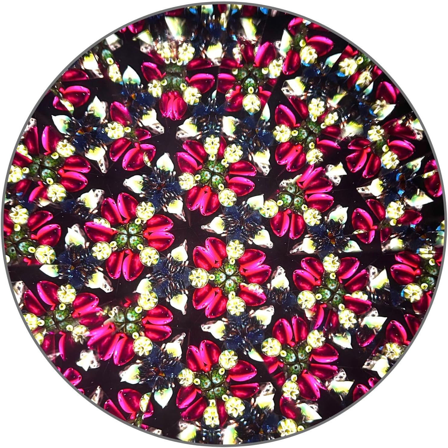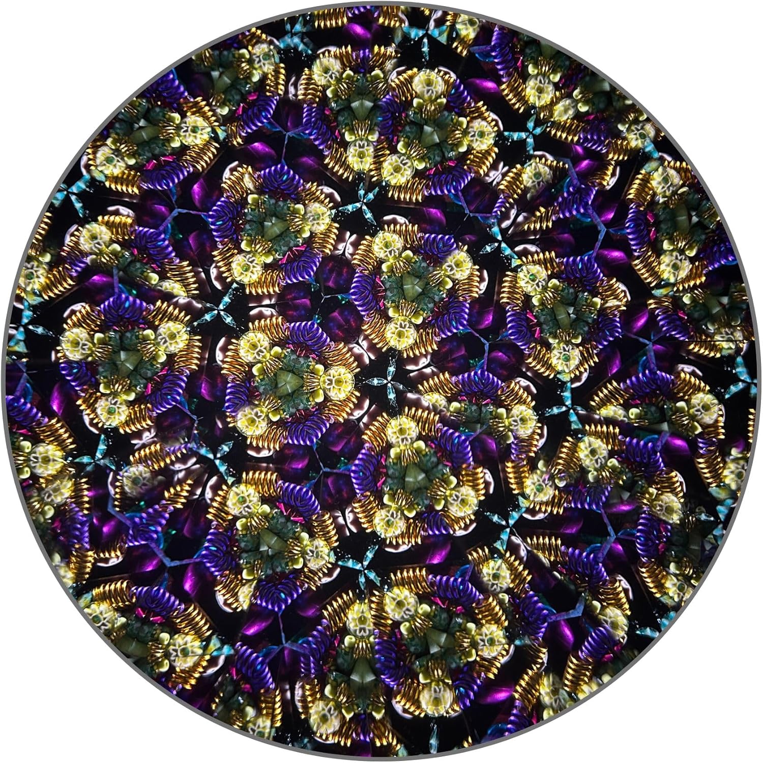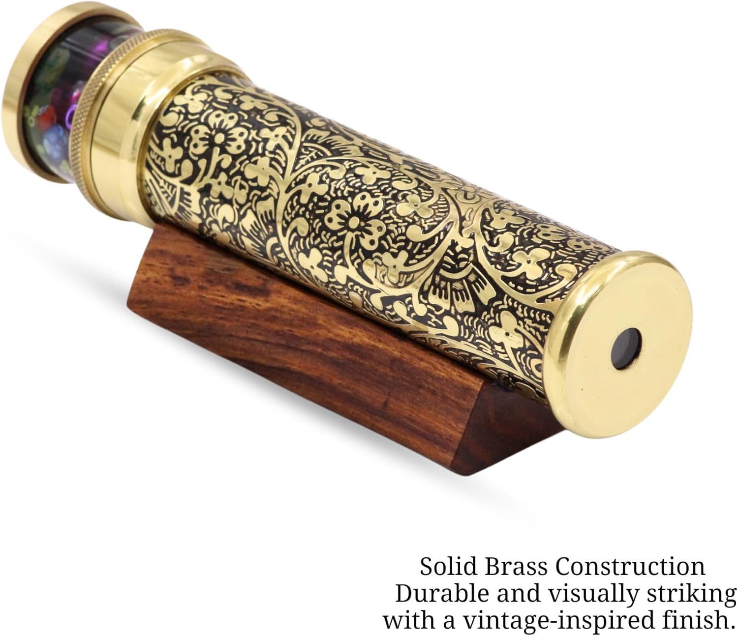 Costruzione in ottone artigianale: realizzata da abili artigiani in India con ottone massiccio, disegni floreali incisi con acido, una finitura patina nera e rivestimento laccato protettivo per qualità cimelio. Modelli visivi abbaglianti: dispone di un sistema a tre specchi e di una cella rotante riempita di olio separata per creare modelli vibranti e in continua evoluzione ad ogni rotazione fluida. Rotazione senza sforzo: dotato di un sistema di cuscinetti lisci di precisione per una rotazione facile, silenziosa e senza soluzione di continuità per goderti le tue esplosioni di colore e disegni preferiti. Elegante base per espositore: include un supporto in legno massello (10,3 x 5,8 cm) per una visualizzazione stabile ed elegante su qualsiasi scrivania, scaffale o custodia da collezione. Chiarezza visiva superiore: lo specchio frontale di alta qualità offre immagini interne nitide, luminose e affascinanti per un'esperienza visiva senza pari. Rilassante e terapeutico: le cellule piene di olio forniscono movimenti fluidi e calmanti, perfetti per la meditazione, il rilassamento o il sollievo dallo stress. Tesoro da collezione: un'aggiunta sorprendente per gli amanti dell'arte, i collezionisti vintage e chiunque cerchi un complemento d'arredo bello e funzionale.