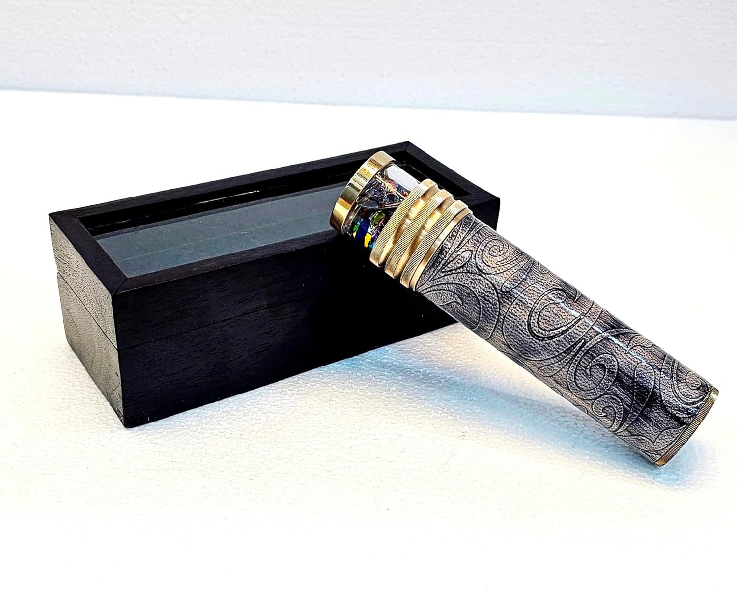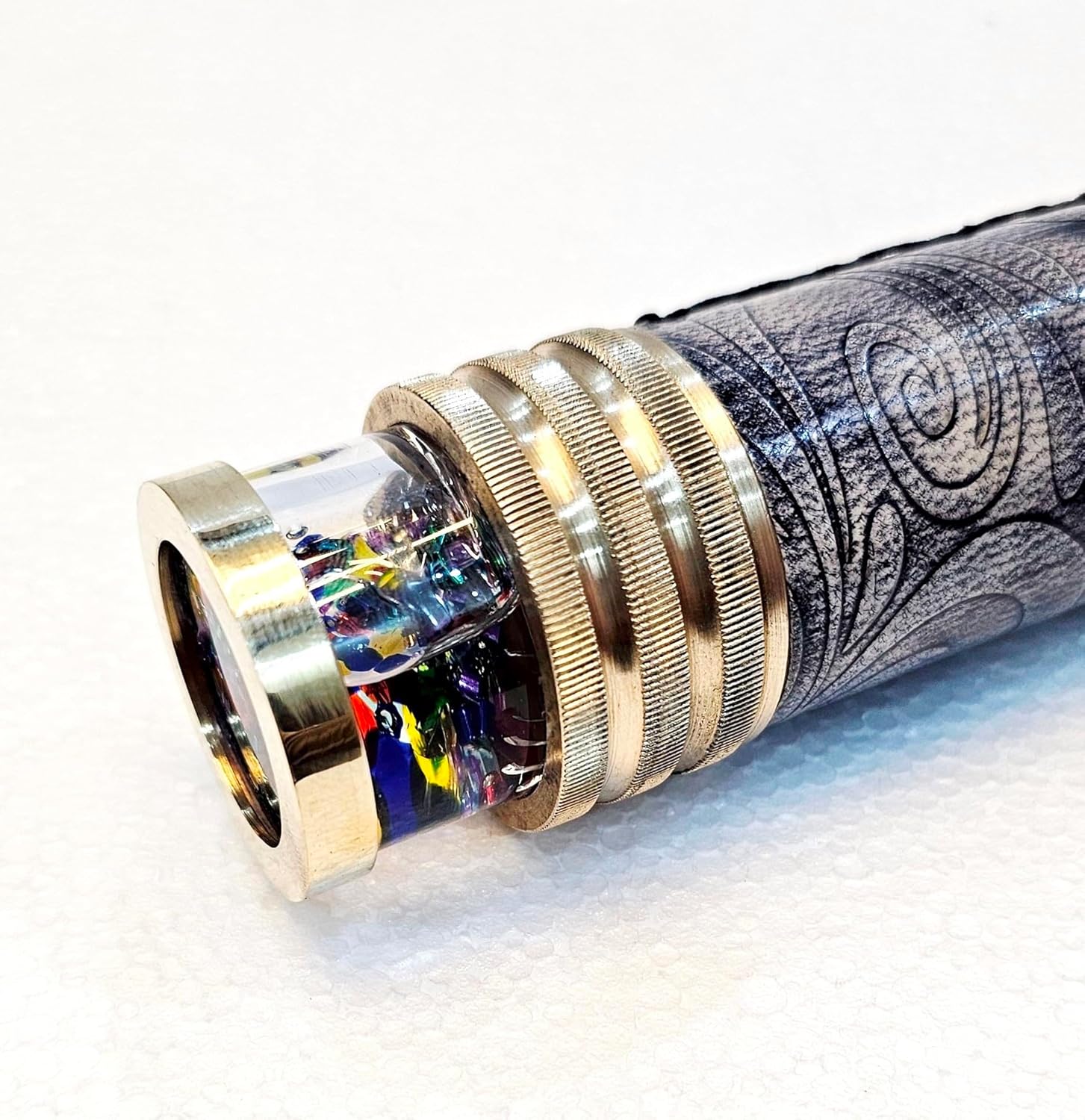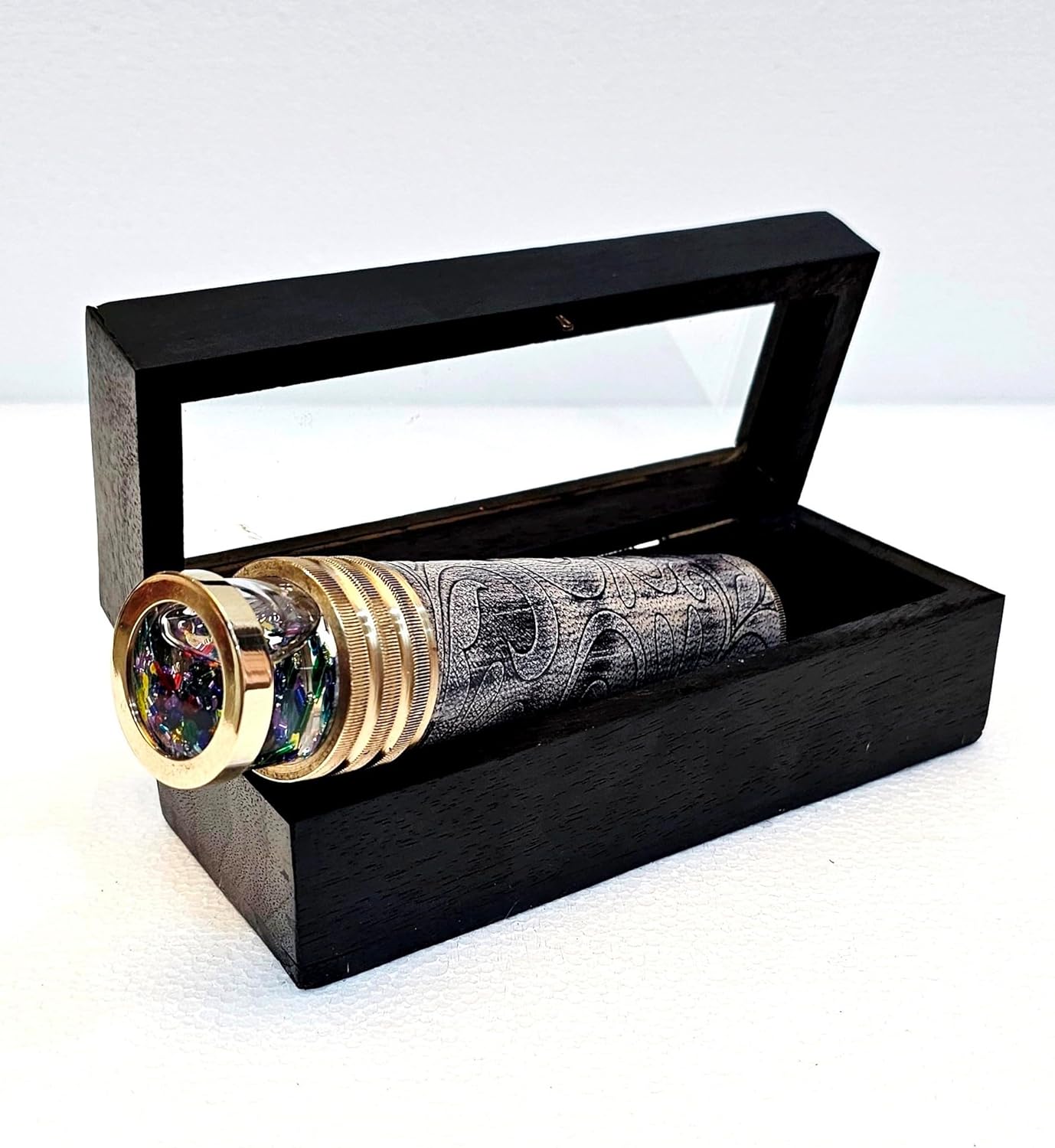 Materiale: ottone e pelle Finitura: finitura nera anticata (come mostrato nell'immagine) Dimensioni: bellissimo regalo vintage da collezione, dimensioni totali: 15,2 x 3,8 cm; peso 240 grammi Lo specchio interno crea immagini colorate..Caleidoscopio Extra Wheel, Brass Kaleidoscope, due ruote di forma e colorate diverse sono posizionate di fronte al set di specchi, e ruotando le ruote vengono create infinite nuove immagini riflettenti. Le ruote possono essere spostate per trovare forme e colori specifici Un ottimo pezzo di conversazione per la casa o l'ufficio! Un regalo fantastico per un collezionista o per una persona speciale!