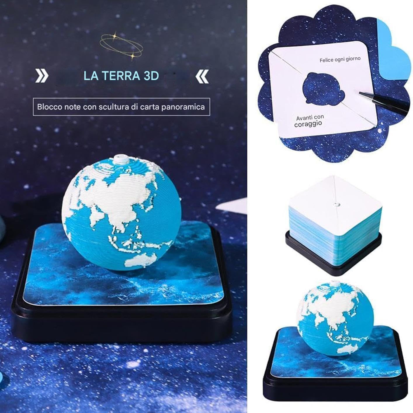Coinvolgente arte cartacea 3D: goditi gli intricati dettagli di un design panoramico a strati con un modello terrestre 3D ritagliato su carta, offrendo un accattivante mondo in miniatura e un coinvolgente coinvolgimento visivo Rappresentazione simbolica del : questo calendario da tavolo 3D combina un design interattivo che strappa pagine con un concetto di ispirazione celeste, creando una connessione simbolica con il e la natura per un'esperienza quotidiana culturalmente arricchente Estetica globale accurata: caratterizzato da incisioni scientificamente accurate di continenti e mari, questo calendario da tavolo mostra i dettagli della copertura marina nei colori bianco-blu, fondendo perfettamente arte e scienza in un arredamento funzionale Funzionalità segnalibro creativo: supportato da un'affidabile base acrilica, questo accessorio da scrivania multiuso presenta un'integrazione creativa di segnalibri, fornendo stabilità e utilizzo versatile come strumento di pianificazione e decorazione Design artistico dinamico: con la sua bellezza dinamica e il design estetico minimalista, questo calendario da tavolo 3D l'arredamento degli interni fungendo anche da elegante pezzo da esposizione d'arte, fornendo una miscela armoniosa di funzionalità e fascino visivo