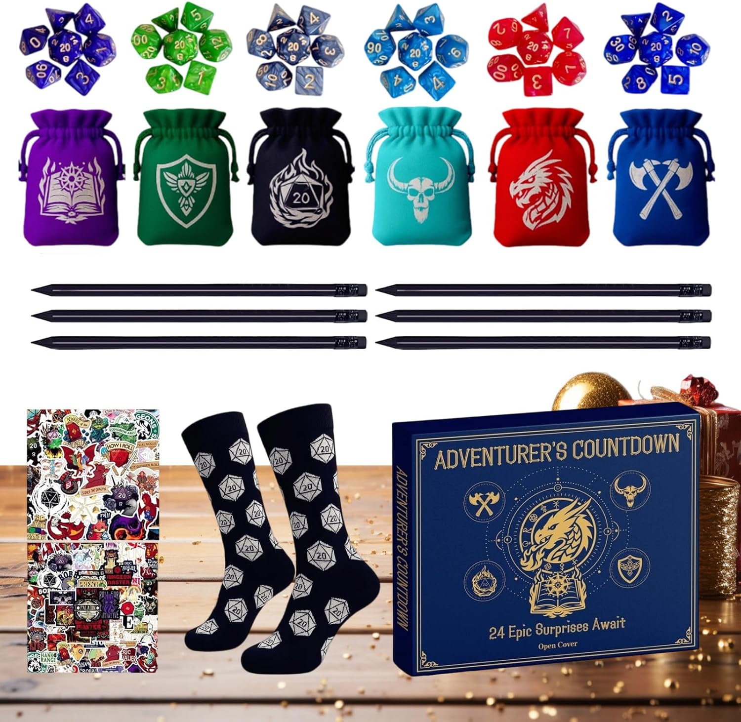 Porta gioia: sblocca la griglia giornaliera per rivelare dadi, equipaggiamenti e oggetti da collezione esclusivi, creando un'esperienza coinvolgente che aumenta l'entusiasmo delle vacanze per appassionati e collezionisti. Facile da trasportare: ideale per i giocatori, con borse incluse per un facile trasporto e organizzazione e un set di sei dadi poliedrici per migliorare la tua esperienza di gioco. Tutti i componenti sono facilmente organizzati e trasportati in sicurezza mentre viaggi o fai scorta Scatena la creatività: progettato per diari con penne a tema che catturano i dettagli dei personaggi e sbloccano il potenziale artistico quando scrivi o disegni Accessori utili: viene fornito con calzini e collane a tema divertenti e pratici, perfetti per mostrare spirito fantasioso durante le serate di gioco aumentando il divertimento Aumenta l'atmosfera: trasforma quaderni e attrezzature con 50 adesivi fantasy che aggiungono i tuoi accessori danno un'emozionante sensazione di esplorazione