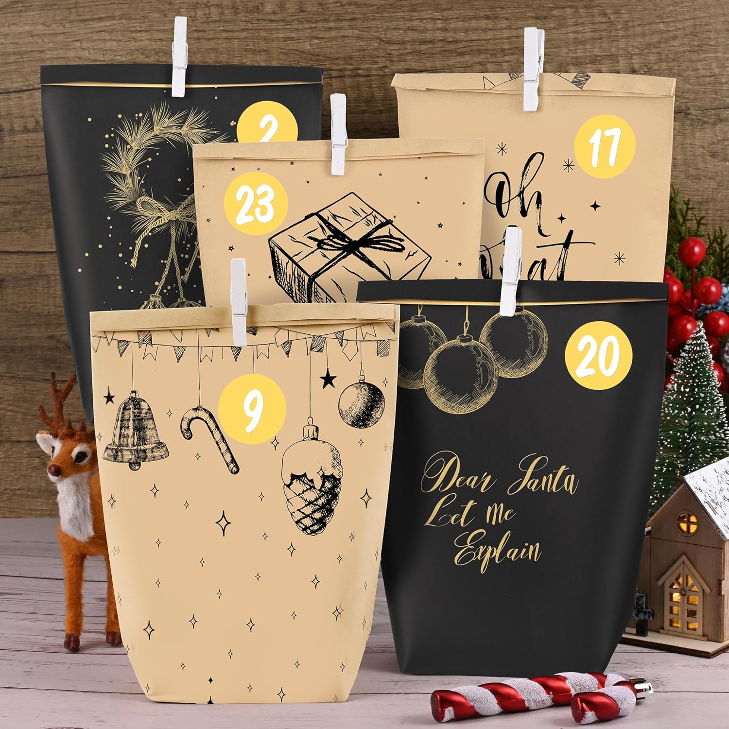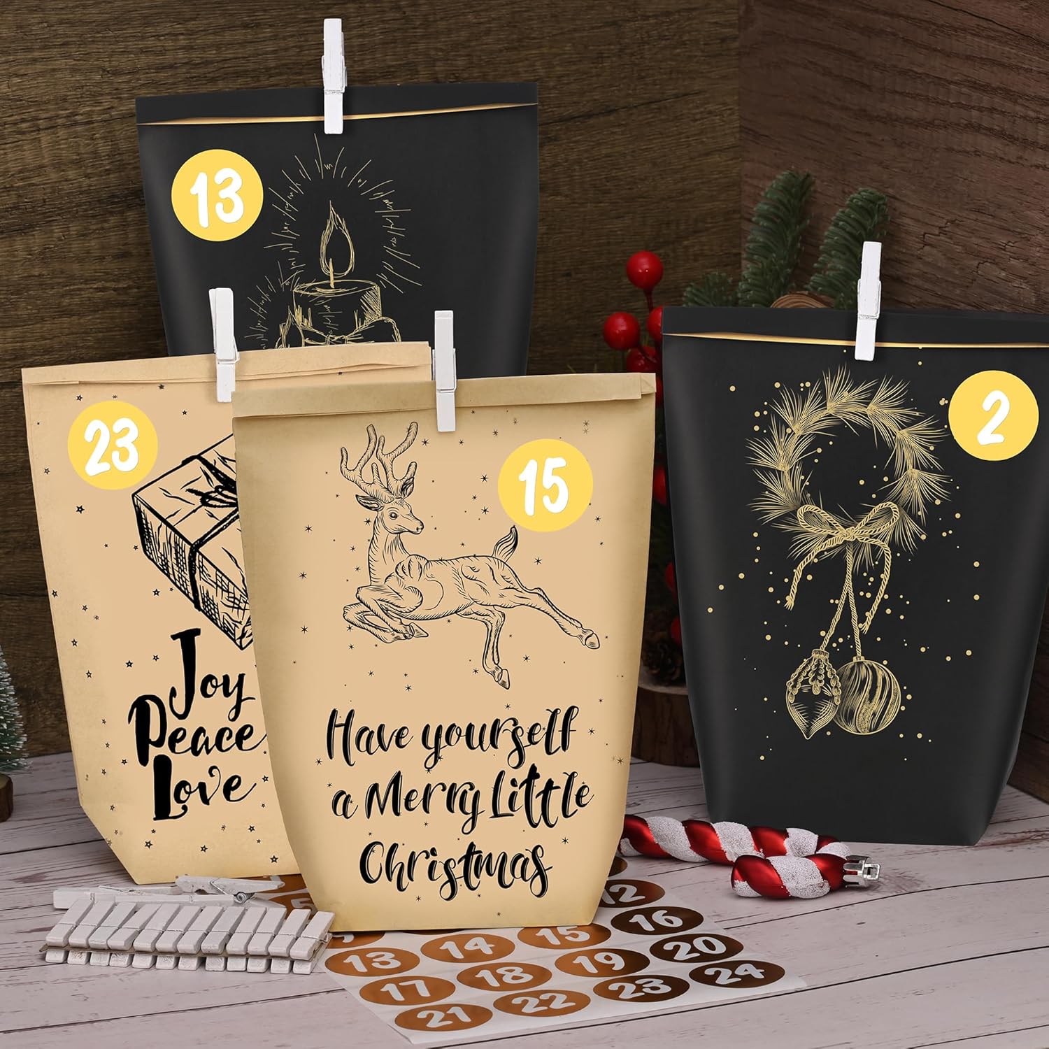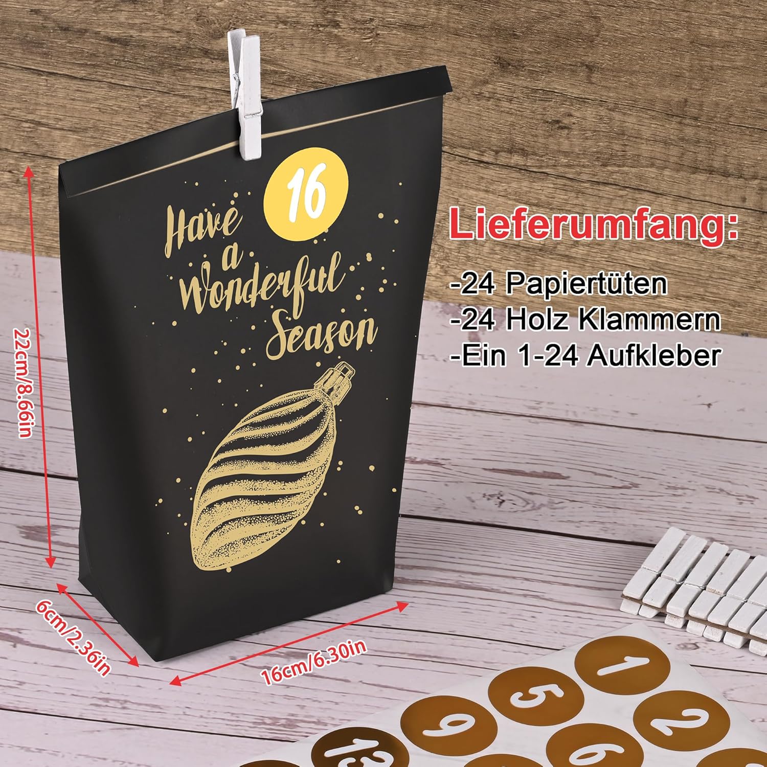 CALENDARIO DELL'AVVENTO ARTISTICO IN NERO E GIALLO: questo set contiene 24 sacchetti di carta stampati con schizzi in contrasto nero e giallo: sacchetti gialli con renne nere e stelle, sacchetti neri con alberi di Natale gialli e campanelle. Con 24 adesivi con numeri dorati puoi facilmente creare un conto alla rovescia unico! DESIGN SCHIZZO DI LUSSO CON ACCENTI DORATI: la combinazione di potenti adesivi neri, gialli caldi e oro lucido dona alla tua casa un'atmosfera di vacanza moderna. Ogni borsa (22x16 cm) mostra motivi disegnati a mano e detti giocosi: una vera attrazione! ESPERIENZA CREATIVA FAI DA TE PER TUTTA LA FAMIGLIA: Progetta il tuo calendario dell'Avvento in pochi minuti: riempi semplicemente i sacchetti con cioccolato, mini regali o buoni, attacca gli adesivi con i numeri dorati e goditi l'attesa. Perfetto per lezioni di artigianato condivise con i bambini! RIUTILIZZABILE E RISPETTOSO DELL'AMBIENTE: la carta kraft di alta qualità e gli adesivi che possono essere rimossi senza lasciare residui rendono questo calendario una scelta sostenibile. Usa le buste artistiche come eleganti confezioni regalo dopo Natale! ELEGANTE DECORAZIONE IN EVIDENZA: Appese a un filo dorato, disposte sulla mensola del caminetto o come ghirlanda da tavolo con lucine, queste borse abbozzate** trasformano qualsiasi stanza in una galleria di Natale. Ideale per gli amanti del design scandinavo!