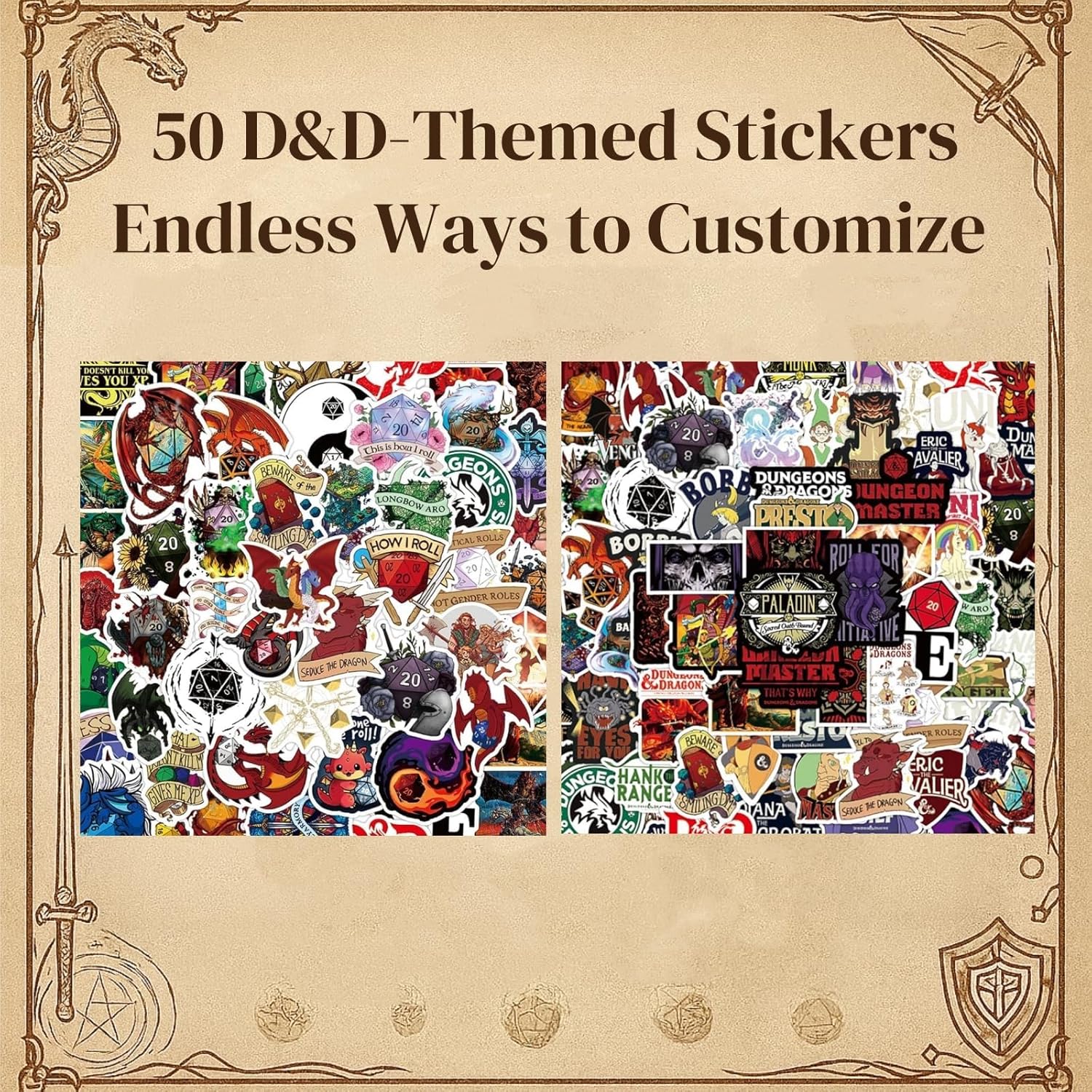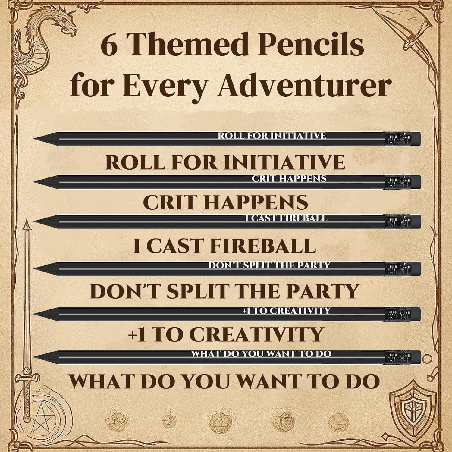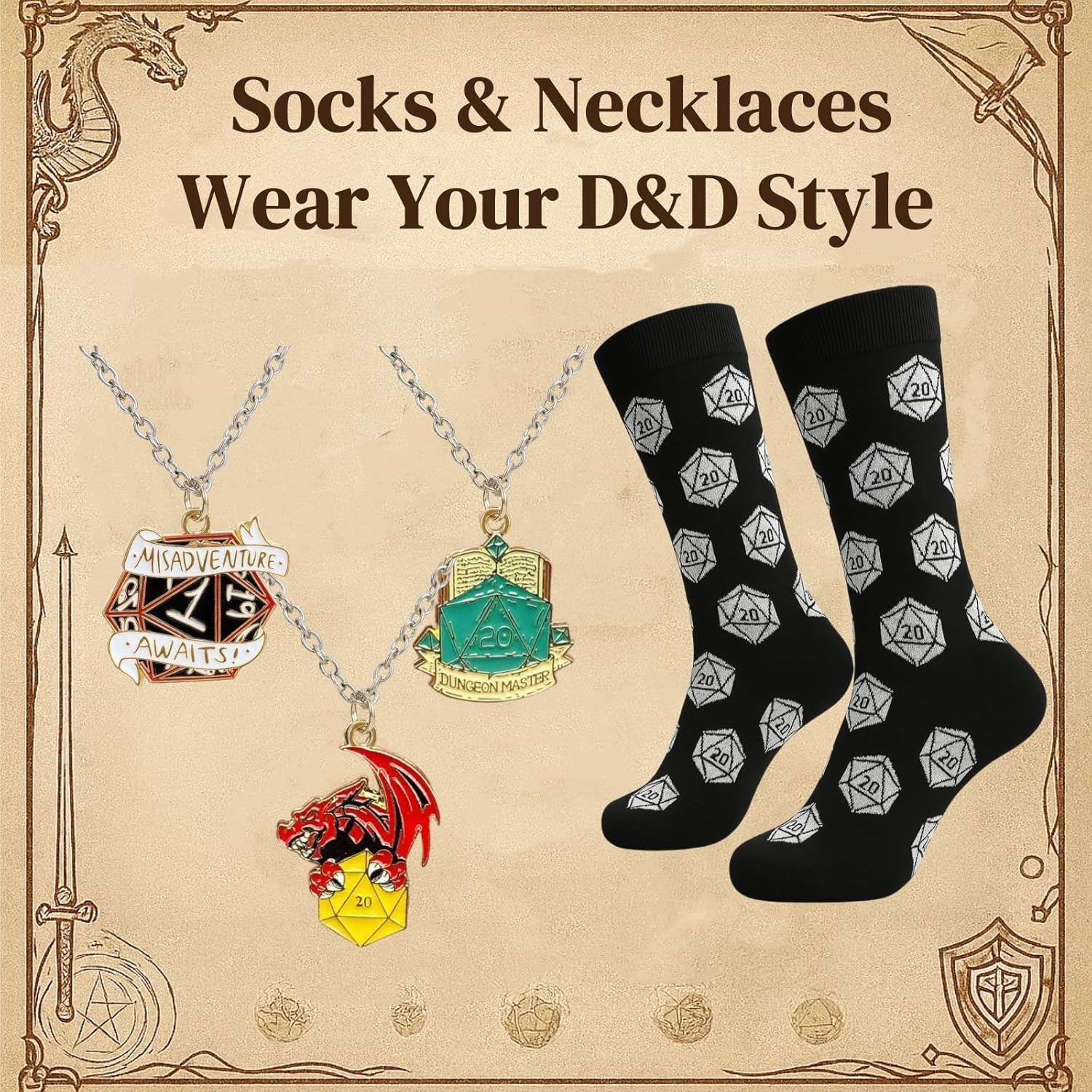 Epica avventura con conto alla rovescia di 24 giorni: sblocca nuove sorprese ogni giorno: set di dadi, equipaggiamento a tema e oggetti da collezione che danno vita al tuo mondo di gioco. 6 set completi di dadi con borse abbinate: ogni set viene fornito con una borsa con cordoncino dal design unico. Ottima attrezzatura per ogni avventuriero: 6 matite a tema per prendere appunti, mappare missioni o tenere traccia di battaglie epiche. Indossa la tua avventura: include calzini con motivo D20 e 3 collane a tema, perfette per serate di gioco o abbigliamento casual. 50 adesivi a tema: decora il tuo schermo, i tuoi quaderni o i tuoi attrezzi con disegni fantasy di alta qualità.