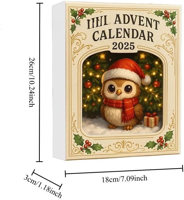 Magico conto alla rovescia natalizio con motivi di gufi: vivi l'attesa festiva con il nostro calendario dell'avvento 2025 con gufi! Dietro ciascuna delle 24 porte si nasconde una nuova sorpresa: un mini gufo che trasformerà il tuo dicembre in un viaggio magico pieno di gioia e fascino di gufi. Per bambini e adulti – divertimento per tutta la famiglia: questo calendario dell'Avvento entusiasma grandi e piccini! Che si tratti di bambini, genitori o collezionisti, le simpatiche figurine di gufi portano gioia ogni giorno e creano momenti condivisi pieni di magia natalizia e gioia della scoperta. Artigianato di alta qualità e ricchi dettagli: i mini gufi sono realizzati in acrilico resistente e sono dipinti con cura. Colori vivaci, strutture fini e volti espressivi rendono ogni figura una piccola opera d'arte e un prezioso oggetto da collezione. Decorazioni festive e ornamenti per l'albero di Natale: con i suoi giocosi ornamenti in acrilico 2D, la collezione è perfetta come decorazione per l'albero di Natale o come decorazione per la tavola. Dona ad ogni stanza un'allegra atmosfera natalizia, ideale per il soggiorno, l'ufficio o l'angolo festivo della casa. Regalo perfetto per Natale e collezionisti: sia per la famiglia, gli amici o i colleghi, questo calendario dell'Avvento con gufi è il regalo ideale per il periodo dell'Avvento. Gli adorabili personaggi e le sorprese quotidiane assicurano un'esperienza di disimballaggio indimenticabile, piena di fascino e magia natalizia.