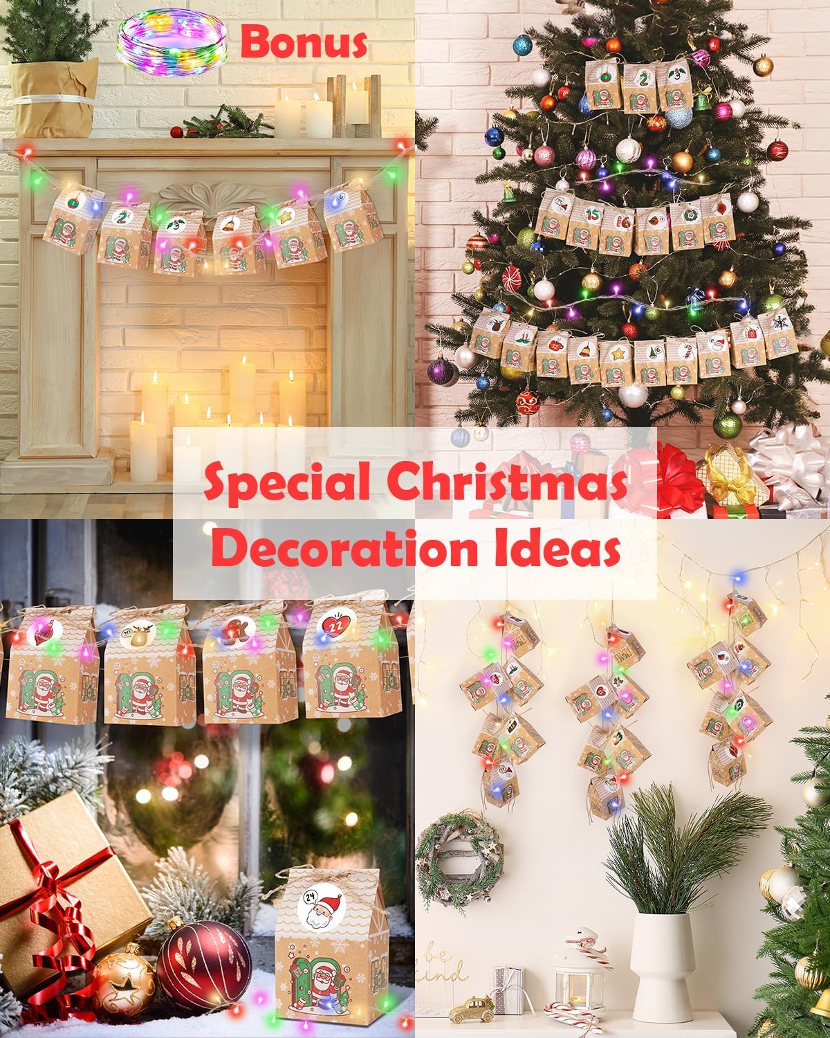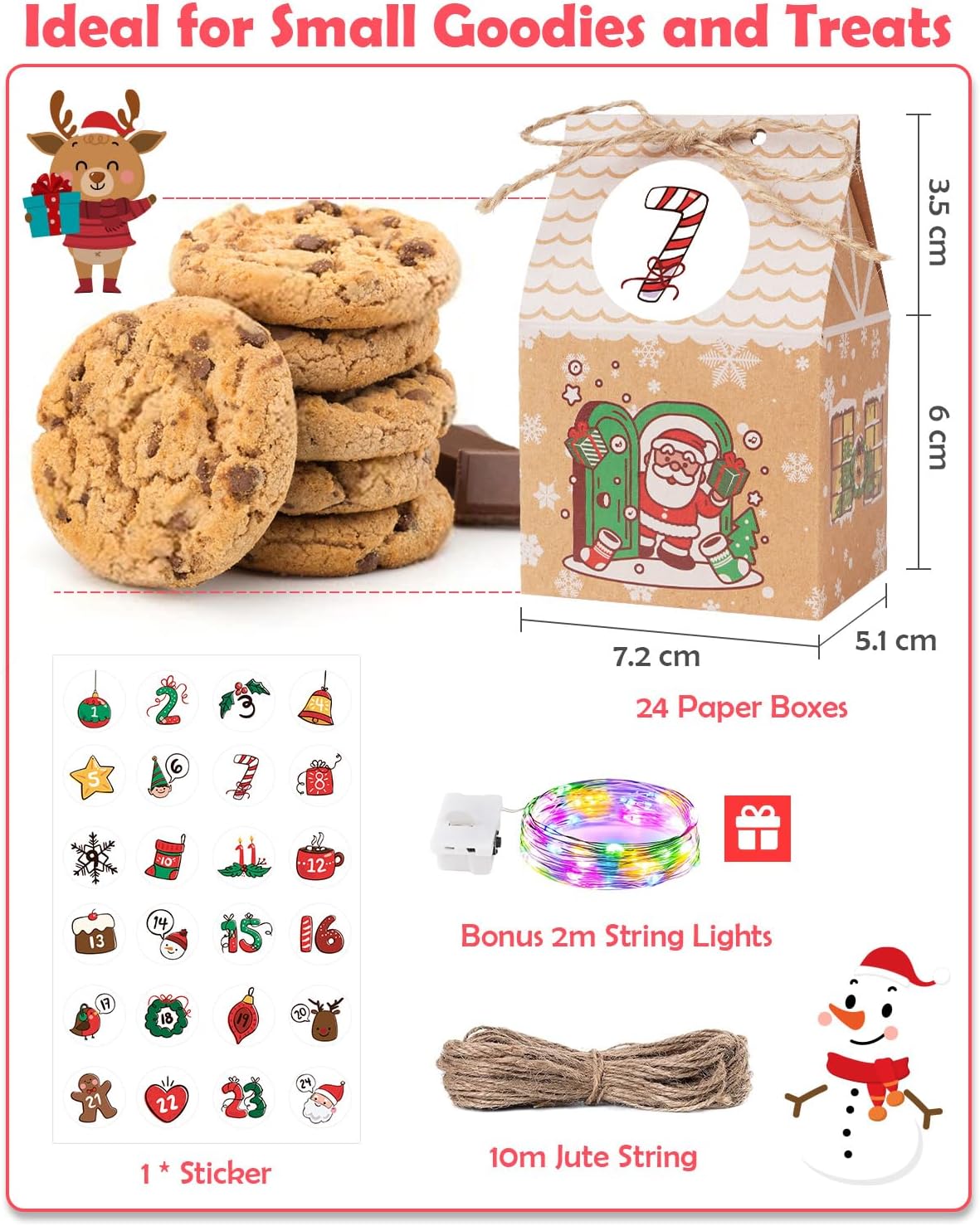 Un calendario dell'Avvento in stile fiabesco: 24 deliziose casette del calendario dell'Avvento sono allineate insieme per formare un villaggio di Natale in miniatura! 24 sacchetti sono stampati con 12 diversi motivi di schizzo, lucine da 2 m, 1 foglio di adesivi, cordoncino di iuta da 10 m in dotazione per migliorare l'atmosfera festosa. Crea i tuoi contenuti come regalo affinché ogni giorno sia un momento d'amore pieno di sorprese. È il calendario dell'Avvento 2025 perfetto per bambini, donne, mamme, nonne e uomini. 2 m di lucine colorate in regalo: le bellissime lucine colorate hanno tre modalità lampeggianti in combinazione con i 24 sacchetti regalo GRANDFUN. Il calendario dell'Avvento porta la decorazione natalizia all'interno a un nuovo livello e la rende più vivace e interessante. Una forte atmosfera festosa e trasmette gioia. Molto adatto per feste scolastiche o aziendali, Natale, Capodanno e altre decorazioni per l'albero di Natale. Design compatto e raffinato che accoglie pensieri preziosi: Le dimensioni delle buste natalizie casetta da riempire di GRANDFUN sono 7,2x5,1x9,5 cm, appositamente pensate per piccoli regali. Ogni scatola può contenere facilmente caramelle, biscotti, bustine di tè, gioielli e altri tipi di piccoli regali. Il design delicato fa sembrare i regali unici. Concetto di decorazione: i calendari dell'Avvento 2025 da riempire di GRANDFUN sotto forma di piccole case ricordano le case delle fiabe. Il loro design tridimensionale è vivido e offre eccezionali effetti decorativi. I sacchetti regalo di Natale possono essere appesi al camino, alla ringhiera delle scale, al davanzale della finestra o all'ingresso. I calendari dell'Avvento per riempire le case creano un'atmosfera densa di conto alla rovescia per la famiglia e gli amici e diventano una parte indispensabile della decorazione natalizia. Molteplici usi e rispetto dell'ambiente: i sacchetti natalizi da riempire di GRANDFUN sono spessi e durevoli, resistenti agli strappi. Chiudi semplicemente i sacchetti con le clip di legno incluse e potrai riutilizzarli ogni anno a Natale o alle feste. I sacchetti natalizi in carta risparmiano sui costi e proteggono l'ambiente. Compila il tuo calendario dell'Avvento. In caso di carenza, contattaci immediatamente: poiché i prodotti vengono imballati manualmente, c'è una probabilità del 5% di carenza. In questo caso contattaci e ti invieremo immediatamente una sostituzione. Grazie per la comprensione e il supporto!