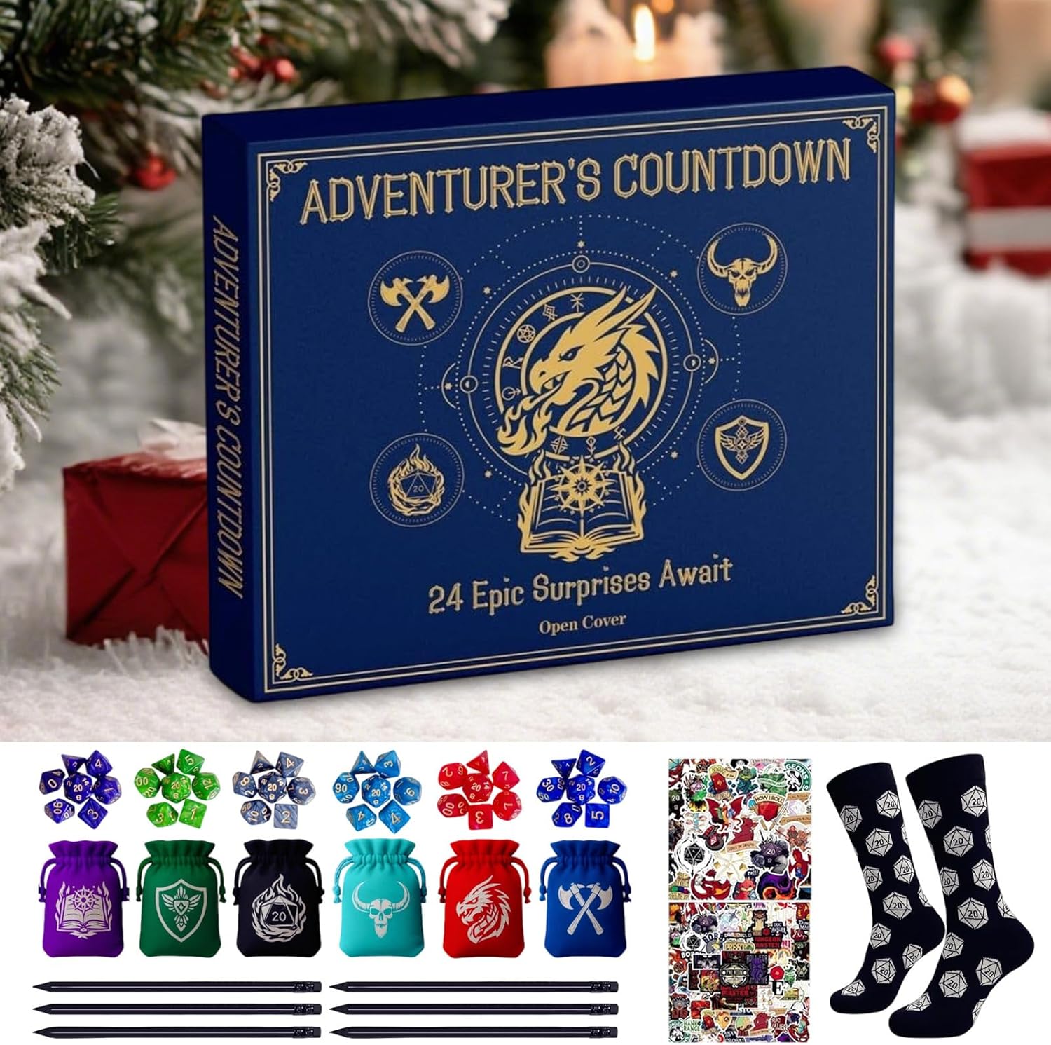Migliora l'umore: potenzia il tuo spirito natalizio aprendo ogni giorno una porta di opportunità collezionabili: scopri dadi, attrezzature e oggetti a tema che aumentano in modo unico la gioia dell'attesa in ogni fase Sblocca la creatività: progettato per diari con penne a tema che catturano i dettagli dei personaggi e liberano il potenziale artistico mentre scrivi o disegna Migliora l'atmosfera: trasforma quaderni e attrezzature con 50 adesivi fantasy che aggiungono entusiasmo ai tuoi accessori Aggiungi uno spirito di scoperta e rendi ogni oggetto unico Espansioni del gioco: Includi calzini e collane a tema per un divertimento pratico. Aumenta lo spirito di immaginazione e immergiti in esperienze di gioco coinvolgenti con ricordi duraturi. IDEALE IN VIAGGIO: Perfetto per i giocatori con borse incluse per un facile trasporto e organizzazione, oltre a un set di sei dadi poliedrici per migliorare l'esperienza di gioco, garantendo che tutti i componenti siano gestiti in modo sicuro e senza sforzo durante il trasporto o lo stoccaggio