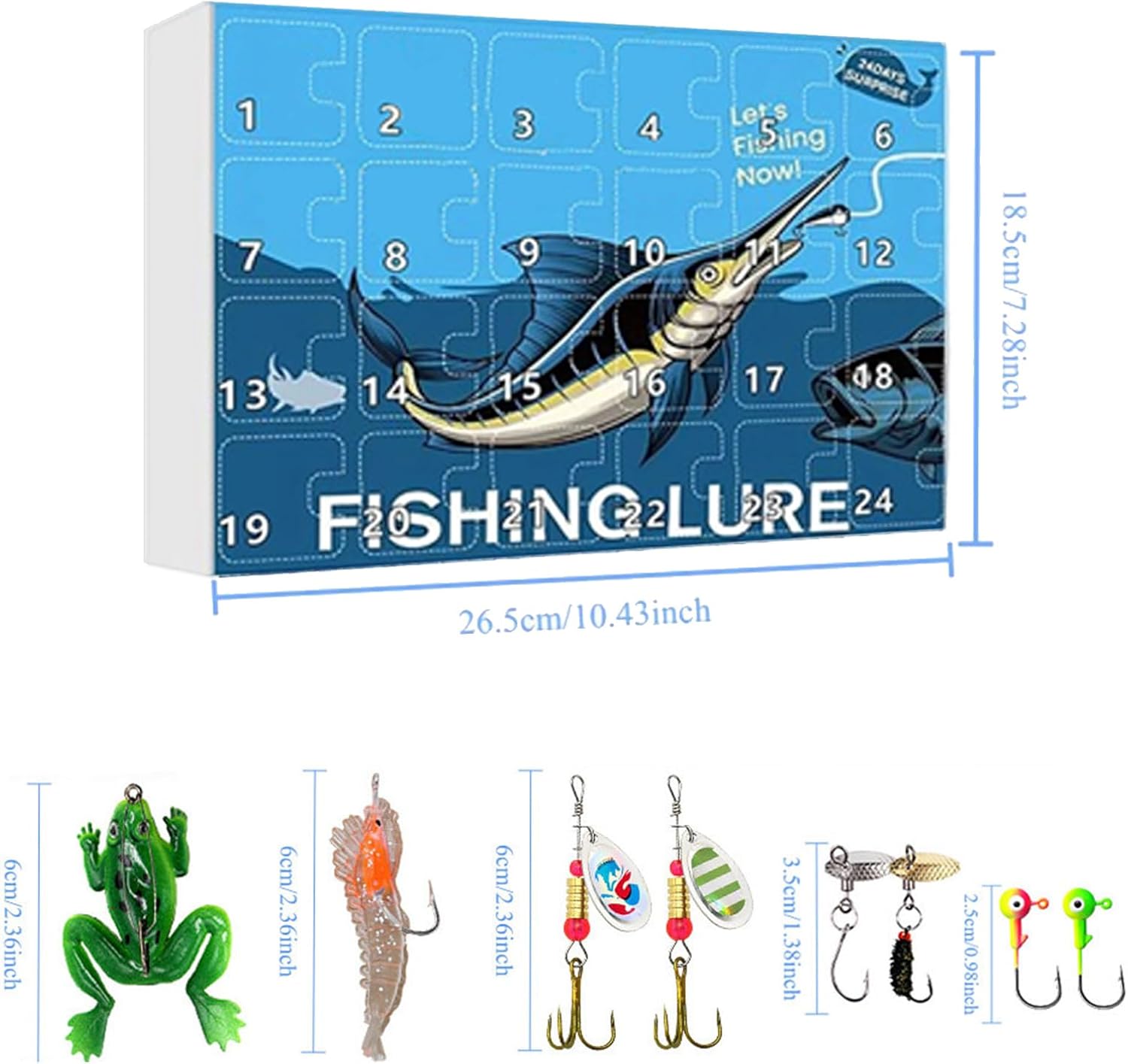 Avventura per il conto alla rovescia di Natale: festeggia le vacanze con questo calendario dell'avvento di pesca interattivo che combina temi festivi ed elementi giocosi per aggiungere divertimento ed eccitazione ogni giorno. Kit da pesca: il calendario dell'Avvento semplifica la preparazione della pesca con spazio di archiviazione portatile, ricchi contenuti ed esche da pesca e accessori, soddisfacendo le esigenze di pesca di base e fornendo un inizio senza sforzo alle attività all'aperto. Regalo di Natale perfetto: questo calendario dell'avvento della pesca unisce praticità e gioia festosa come una divertente confezione regalo, ideale come regalo di Natale per diverse età e arricchisce naturalmente l'atmosfera festosa. Sveglia per l'interesse degli esploratori: crea ricordi duraturi con il calendario dell'avvento della pesca interattivo, promuove il legame familiare attraverso il conto alla rovescia e ispira entusiasmo per la preparazione e la scoperta delle attività all'aperto. Uso multifunzionale: questo calendario dell'avvento combina temi natalizi e di pesca con design accattivanti e accattivanti in una squisita confezione rigida. È un regalo distintivo e apprezzato per occasioni versatili.