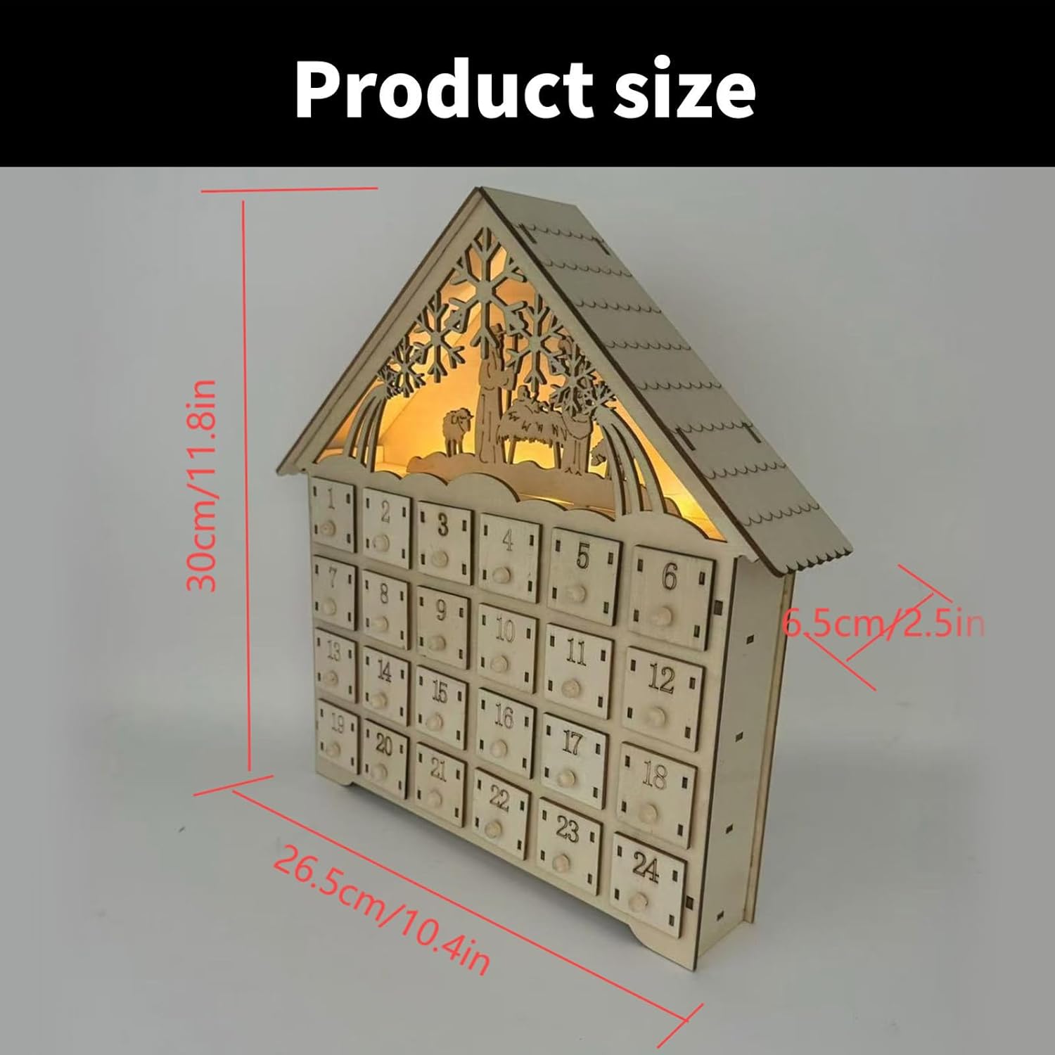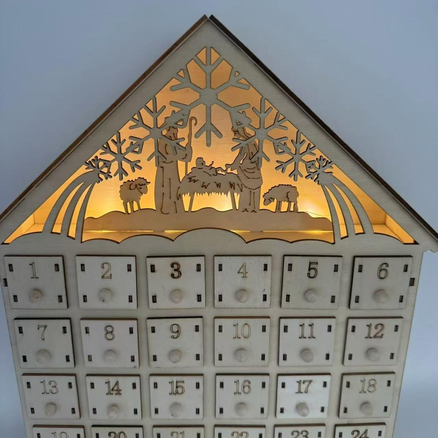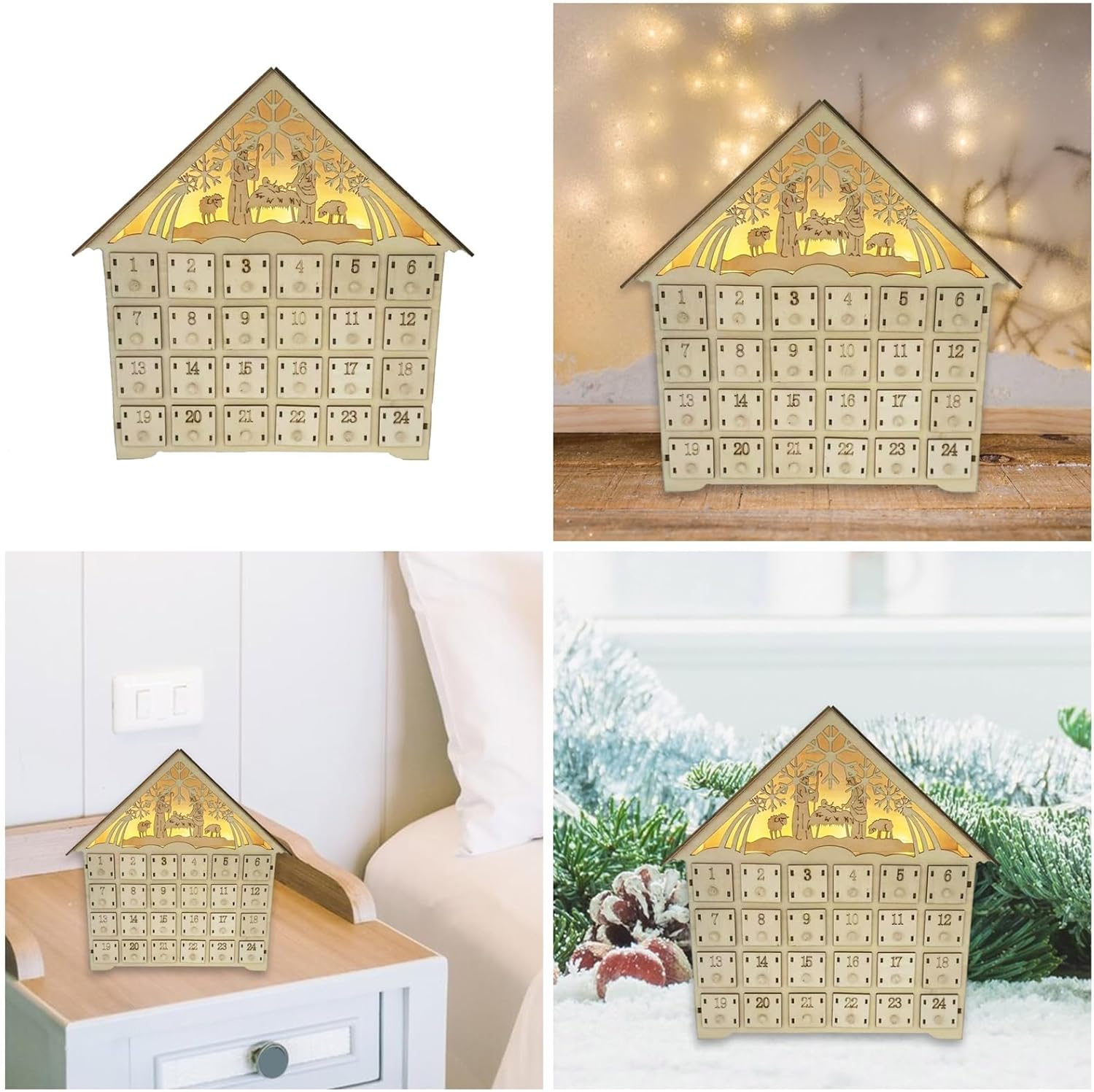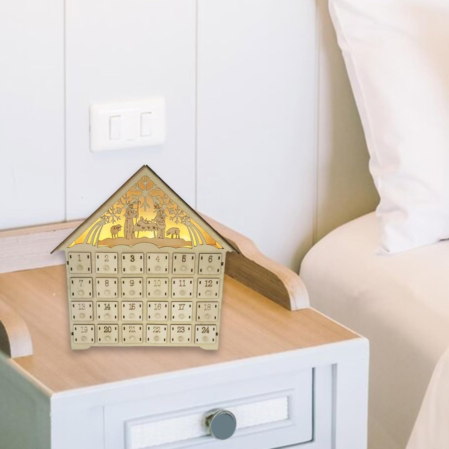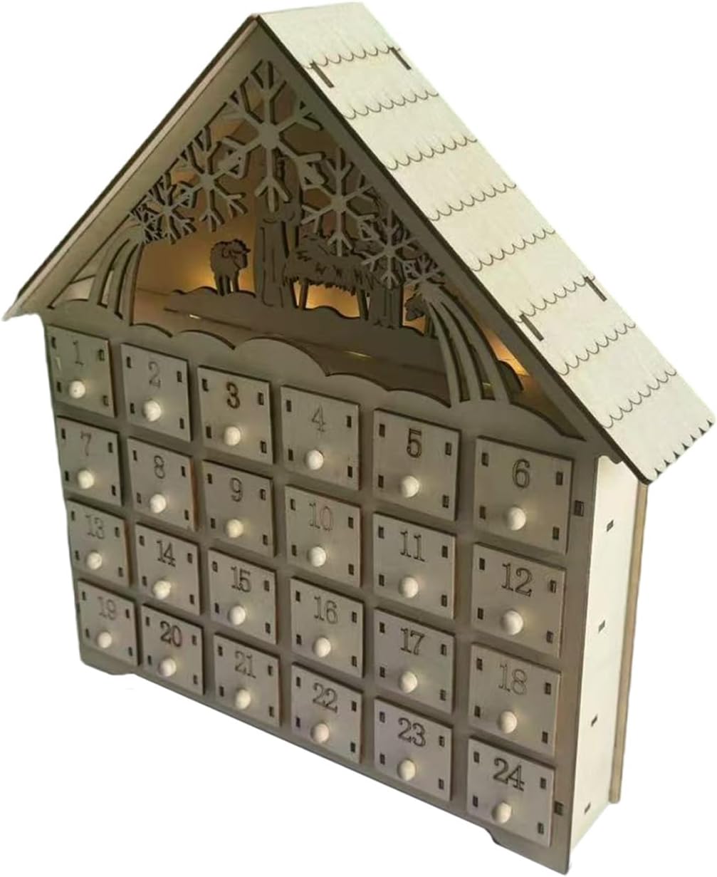 Vivi il fascino del Natale con il calendario dell'Avvento a LED, che presenta una miscela unica di tradizionali cassetti dell'Avvento e moderne luci a LED Posiziona questo incantevole ornamento sulla mensola del camino o sul tavolo per riempire la tua casa con gli spiriti della stagione e rendere l'inaugurazione di ogni giorno un evento speciale per bambini e adulti Perfetto per le famiglie che desiderano creare una tradizione natalizia o per chiunque apprezzi l'anticipazione del conto alla rovescia fino al giorno di Natale. Questo calendario in legno finemente intagliato presenta 24 cassetti individuali per sorprese quotidiane, completati da una scena elegante con un albero di Natale rotante e fiocchi di neve, il tutto illuminato da luci LED soffuse e festive. Con i suoi disegni delicati e la calda luce, il calendario dell'Avvento non è solo una decorazione, ma un elemento centrale, che riunisce gli innamorati per celebrare il calore e l'eccitazione delle festività.
