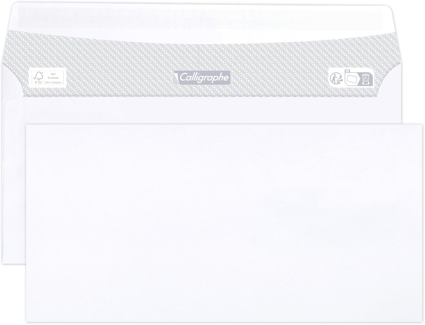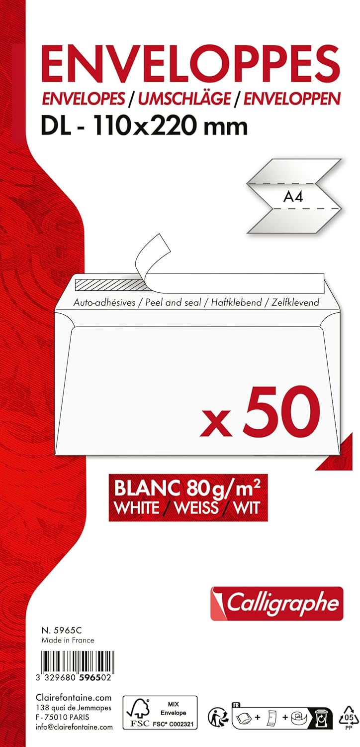 Calligraphe (gamma per corrispondenza Clairefontaine) 5965C - Confezione da 50 Buste Bianche DL-110x220mm - Autoadesive - 80g/m²
