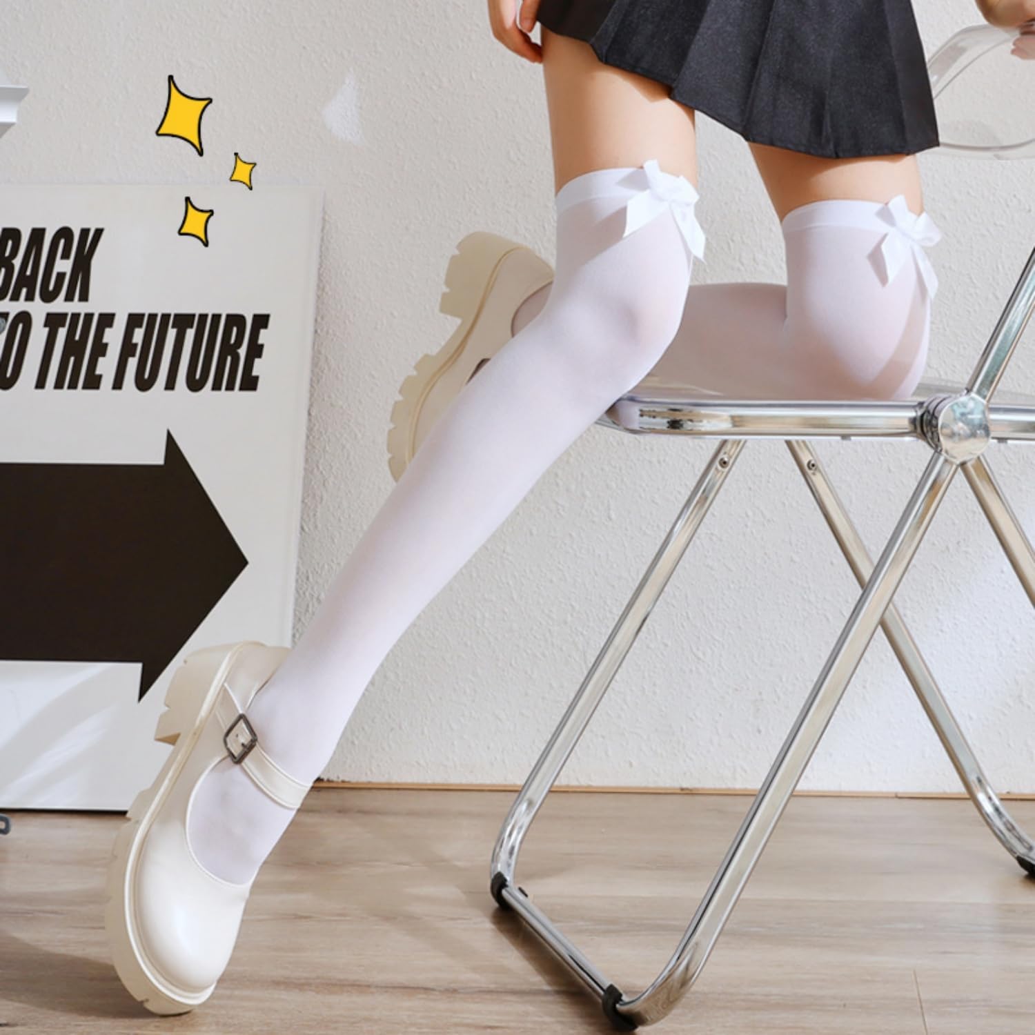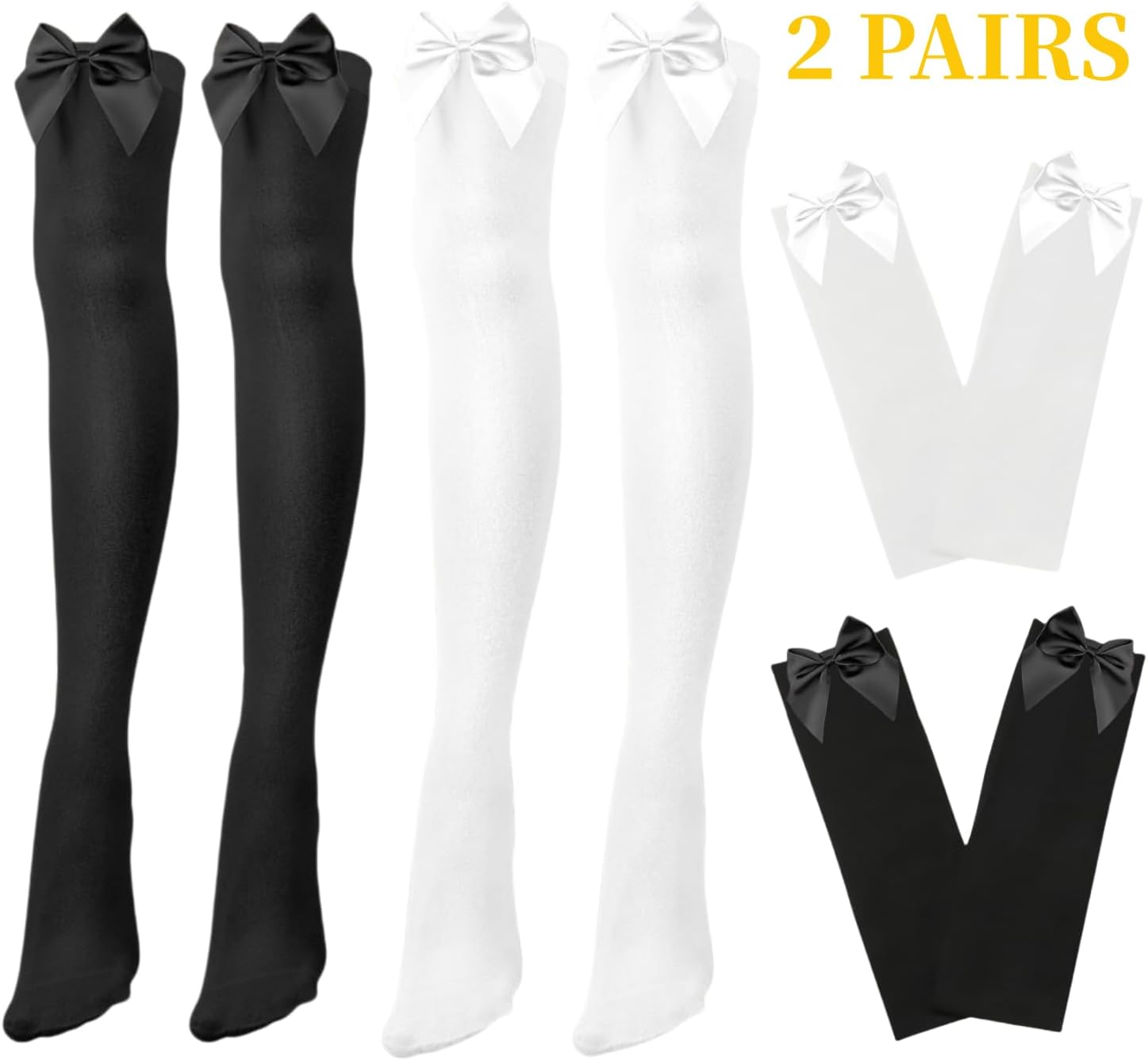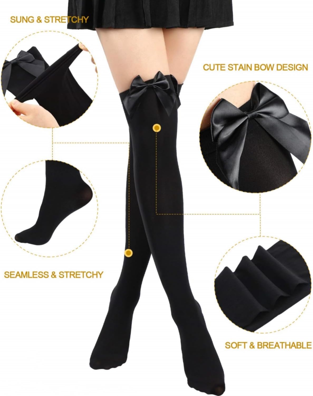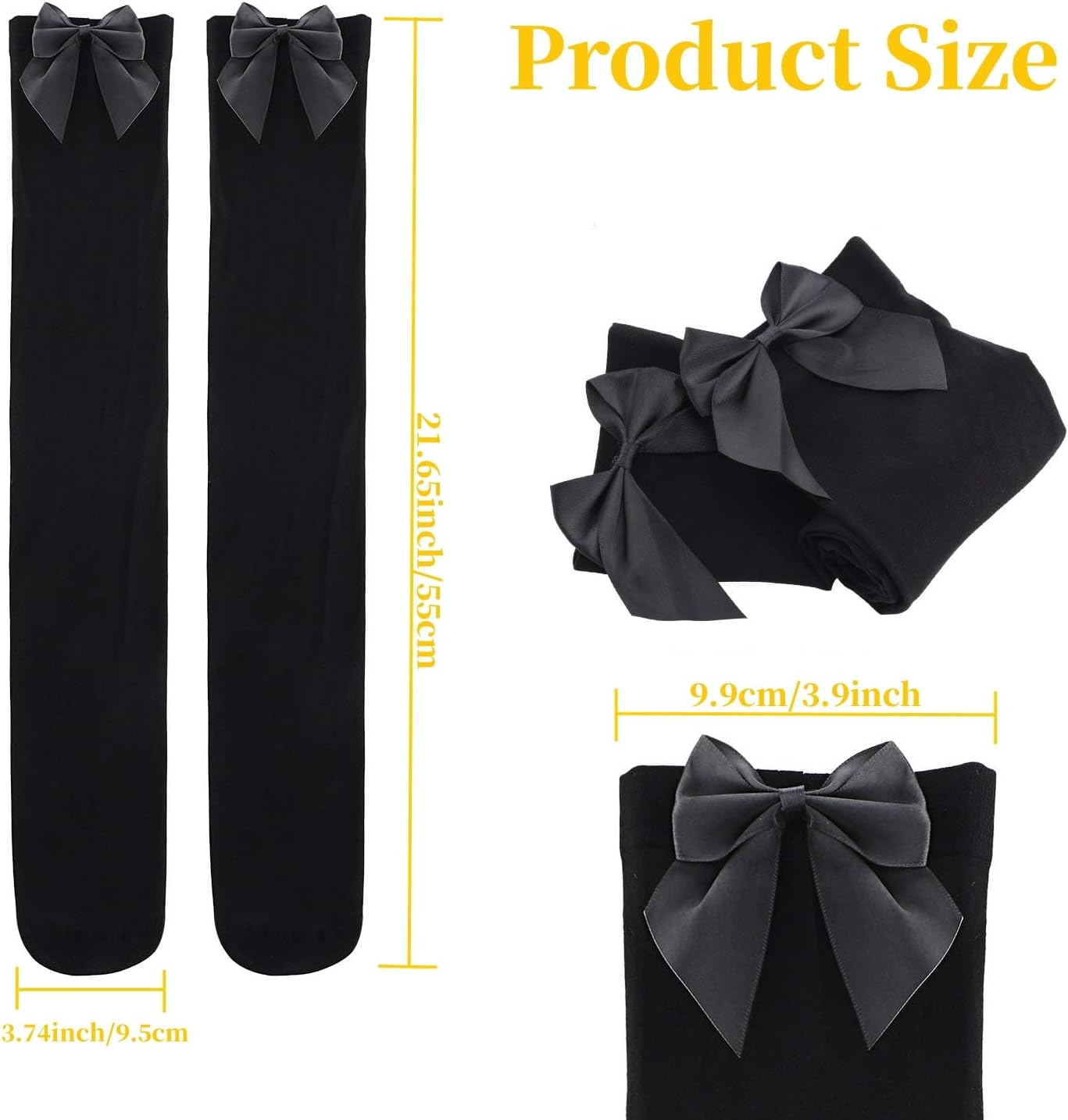 Calze con fiocco da donna Le calze sopra il ginocchio da donna sono realizzate con materiali di alta qualità, sono durevoli e resistenti all'usura, morbide e inodore, delicate sulla pelle ed elastiche possono offrirti calore e moda. Specifiche: Nome del prodotto:Calze con fiocco Dimensioni del prodotto: 19,6 × 2,9 pollici/50 × 7,5 cm Materiale: 80% nylon e 20% elastan e sono Colore: bianco, nero Quantità: 2 pezzi Incluso: 2*Calzini Lunghe Donna con Fiocchi Calzini stile ginocchio con fiocco Calzini neri al ginocchio da donna adatti per l'uso quotidiano, danza, spettacoli teatrali, costumi da festival, cosplay o altre occasioni. I calzini neri al ginocchio da donna si adattano facilmente a vari capi di abbigliamento.