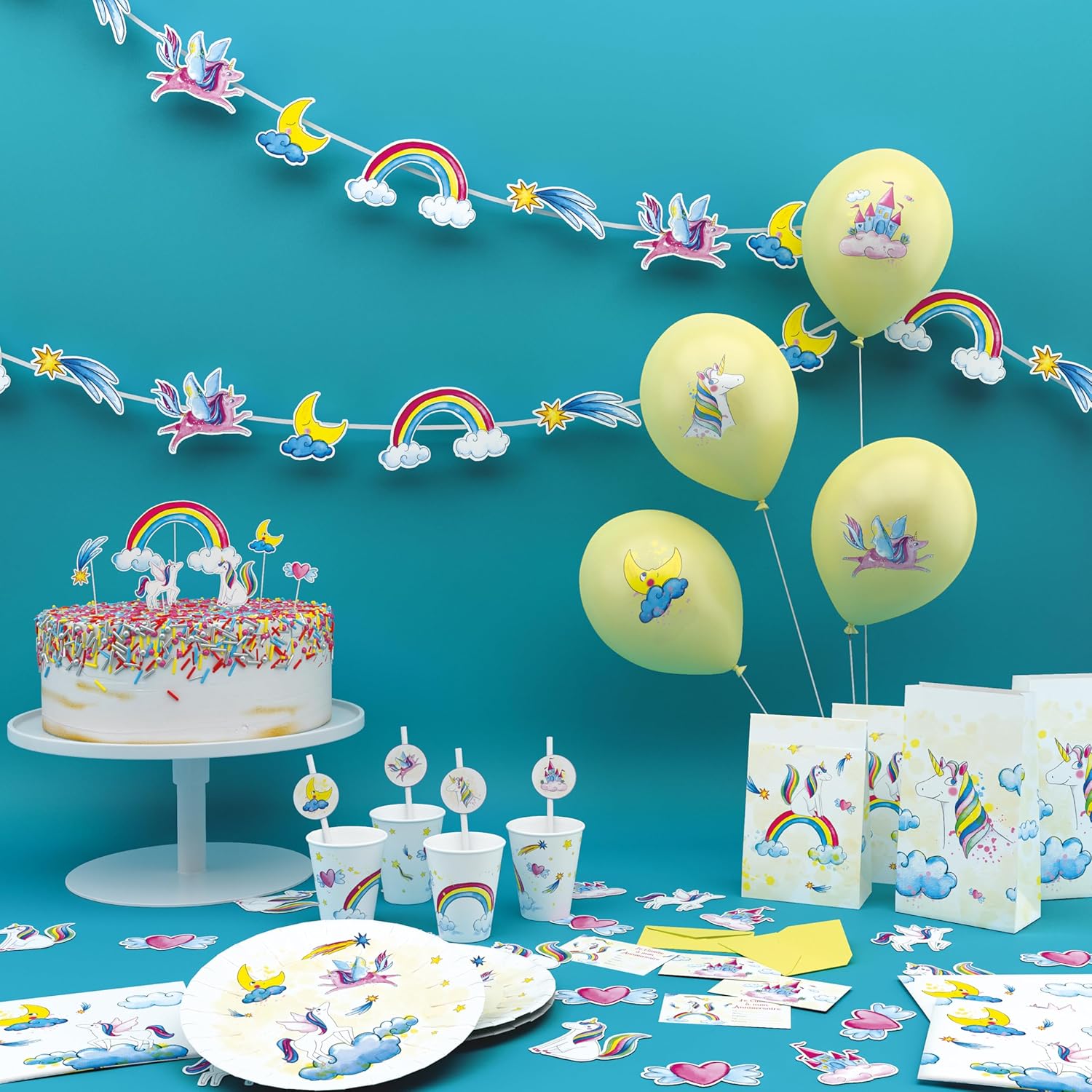 Tema fatato: immergi i bambini in un universo magico dove gli unicorni portano un tocco di sogno e magia. Atmosfera Incantata: Questi accessori decorativi creano un'atmosfera morbida e accattivante, ispirata al mondo degli unicorni. Elementi coordinati: tutti gli elementi si armonizzano perfettamente, fornendo un'esperienza visiva coerente e incantevole. Facile da usare: perfetto per trasformare rapidamente e facilmente qualsiasi spazio in un regno magico. Tutti gli articoli rispettano le normative europee vigenti, garantendo così sicurezza e qualità.