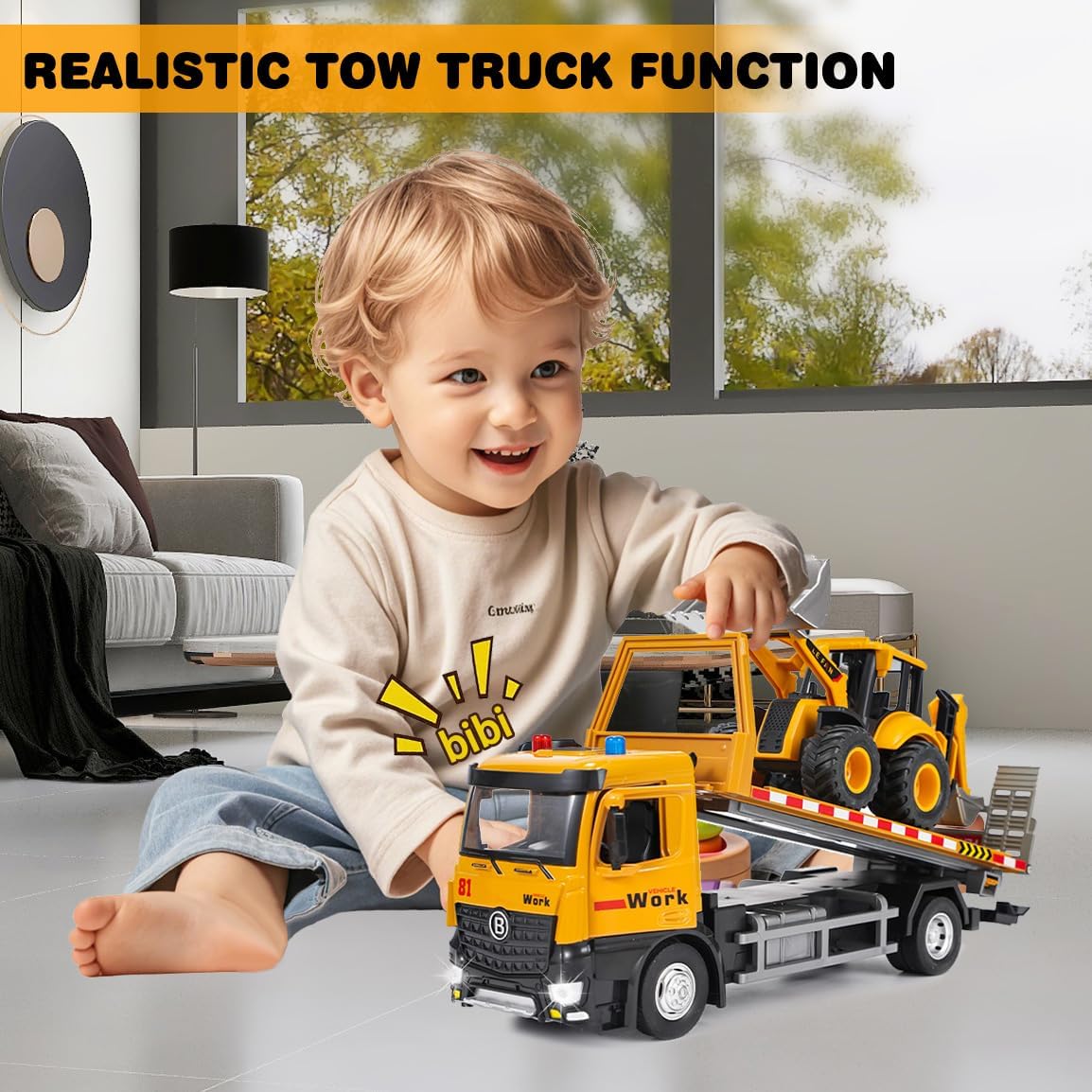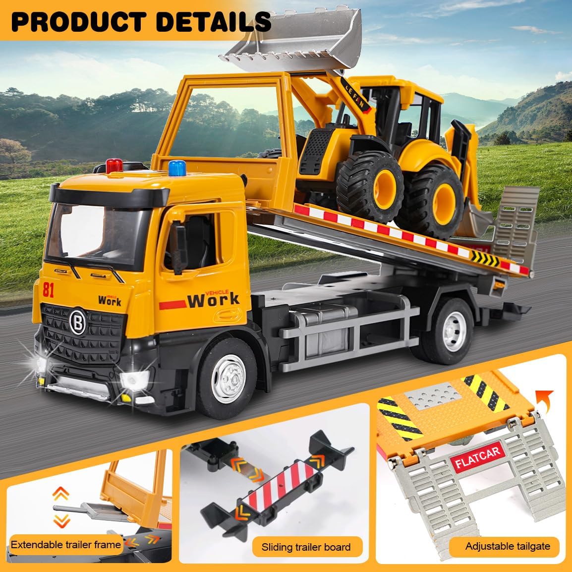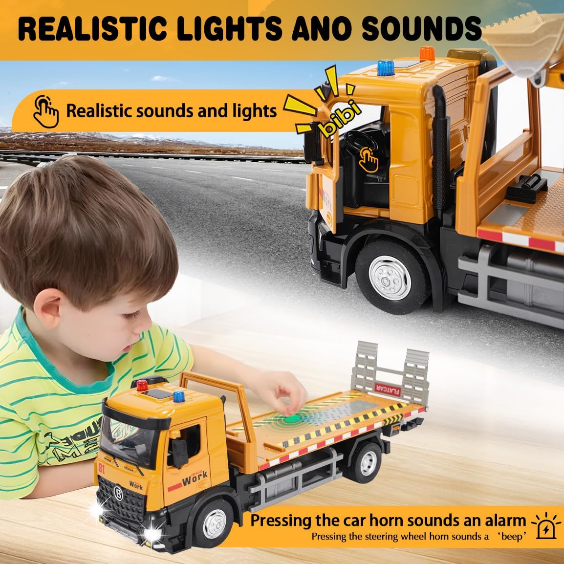 Giocattolo carro attrezzi: riceverete 1*carro attrezzi versatile (33*11*8,3 cm) e 1*veicolo di carico (con funzione escavatore e pala, 20,5*8*8 cm) in un unico set. Il rimorchio può essere ribaltato per caricare e scaricare e simula scenari di trasporto e di lavoro reali. Offre molteplici possibilità di gioco come il trasporto, lo scavo e il carico e soddisfa la curiosità del vostro bambino per i veicoli da cantiere. Materiali di alta qualità: la parte anteriore del veicolo è realizzata in una lega robusta e resistente agli urti, mentre la carrozzeria è in plastica resistente. Gli pneumatici in gomma antiscivolo garantiscono una guida fluida. Le porte possono essere aperte e gli specchietti retrovisori ripiegati, riproducendo così i dettagli realistici del veicolo! Colori vivaci e strutture chiare. Comandi flessibili, sviluppo delle capacità motorie: il pianale di carico del rimorchio può essere facilmente ribaltato, la pala e il braccio dell'escavatore sono liberamente mobili. Il volante con clacson riproduce i comandi di un vero veicolo. Giocando si sviluppano le capacità motorie fini delle mani e la coordinazione occhio-mano! Effetti luminosi e sonori interattivi: con musica e effetti luminosi integrati, il camion emette un segnale acustico quando si preme sulla carrozzeria. Azionando il clacson sul volante, il veicolo emette un segnale acustico che simula un vero camion. Questo rende l'esperienza di gioco ancora più vivace, cattura l'attenzione dei bambini e garantisce ore di divertimento! Una scelta sicura per i genitori: i bordi sono arrotondati e privi di sbavature, non ci sono piccole parti che possono staccarsi facilmente, quindi i bambini possono giocare in tutta sicurezza. I genitori possono partecipare al gioco, spiegare le funzioni del veicolo e la logica di funzionamento attraverso progetti di costruzione, trasmettendo così l'educazione della prima infanzia durante il gioco. L'interazione tra genitori e figli trasmette conoscenze tecniche, garantendo divertimento ed educazione! Il regalo perfetto: è ideale per i bambini che amano i macchinari da costruzione. Quando riceveranno questo carro attrezzi, i loro occhi brilleranno di gioia. È il regalo perfetto per i bambini per il compleanno, Natale o la festa dei bambini.