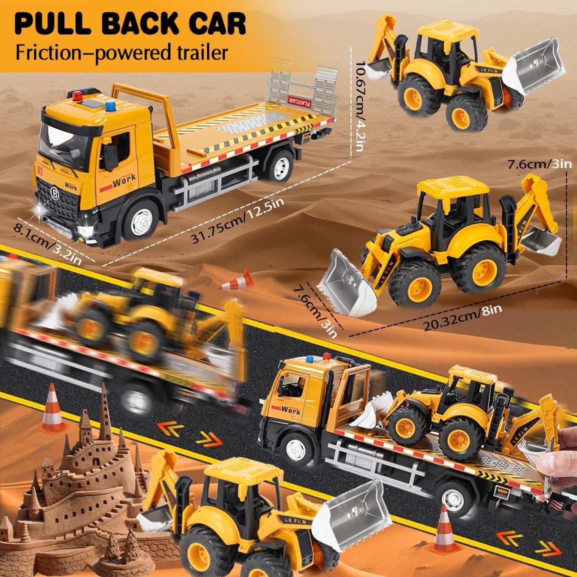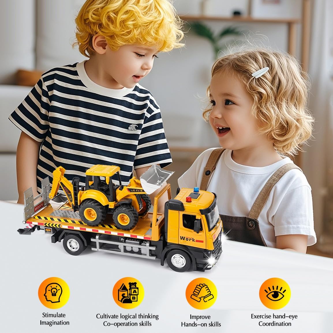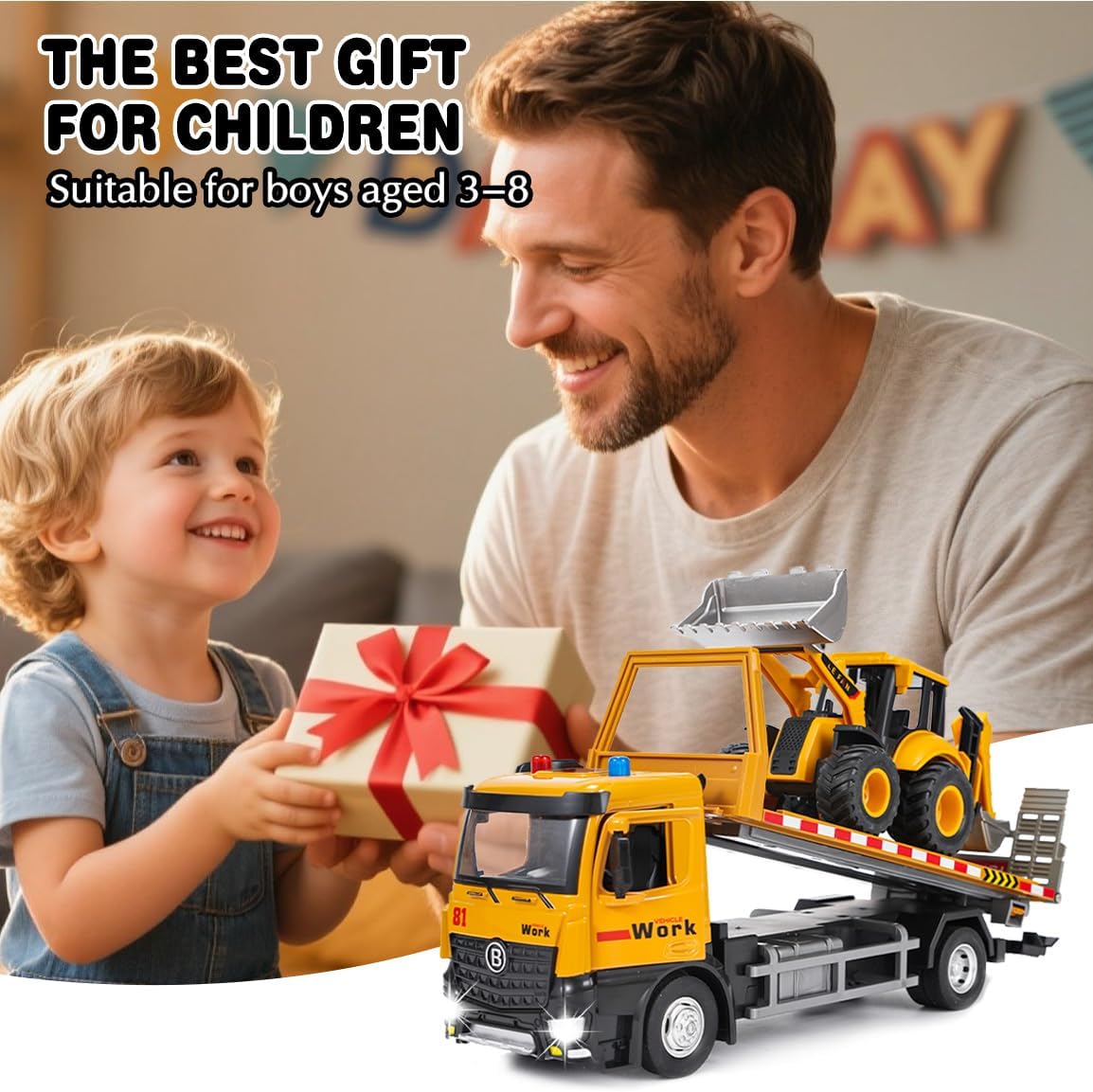Giocattolo carro attrezzi: riceverete 1*carro attrezzi versatile (33*11*8,3 cm) e 1*veicolo di carico (con funzione escavatore e pala, 20,5*8*8 cm) in un unico set. Il rimorchio può essere ribaltato per caricare e scaricare e simula scenari di trasporto e di lavoro reali. Offre molteplici possibilità di gioco come il trasporto, lo scavo e il carico e soddisfa la curiosità del vostro bambino per i veicoli da cantiere. Materiali di alta qualità: la parte anteriore del veicolo è realizzata in una lega robusta e resistente agli urti, mentre la carrozzeria è in plastica resistente. Gli pneumatici in gomma antiscivolo garantiscono una guida fluida. Le porte possono essere aperte e gli specchietti retrovisori ripiegati, riproducendo così i dettagli realistici del veicolo! Colori vivaci e strutture chiare. Comandi flessibili, sviluppo delle capacità motorie: il pianale di carico del rimorchio può essere facilmente ribaltato, la pala e il braccio dell'escavatore sono liberamente mobili. Il volante con clacson riproduce i comandi di un vero veicolo. Giocando si sviluppano le capacità motorie fini delle mani e la coordinazione occhio-mano! Effetti luminosi e sonori interattivi: con musica e effetti luminosi integrati, il camion emette un segnale acustico quando si preme sulla carrozzeria. Azionando il clacson sul volante, il veicolo emette un segnale acustico che simula un vero camion. Questo rende l'esperienza di gioco ancora più vivace, cattura l'attenzione dei bambini e garantisce ore di divertimento! Una scelta sicura per i genitori: i bordi sono arrotondati e privi di sbavature, non ci sono piccole parti che possono staccarsi facilmente, quindi i bambini possono giocare in tutta sicurezza. I genitori possono partecipare al gioco, spiegare le funzioni del veicolo e la logica di funzionamento attraverso progetti di costruzione, trasmettendo così l'educazione della prima infanzia durante il gioco. L'interazione tra genitori e figli trasmette conoscenze tecniche, garantendo divertimento ed educazione! Il regalo perfetto: è ideale per i bambini che amano i macchinari da costruzione. Quando riceveranno questo carro attrezzi, i loro occhi brilleranno di gioia. È il regalo perfetto per i bambini per il compleanno, Natale o la festa dei bambini.