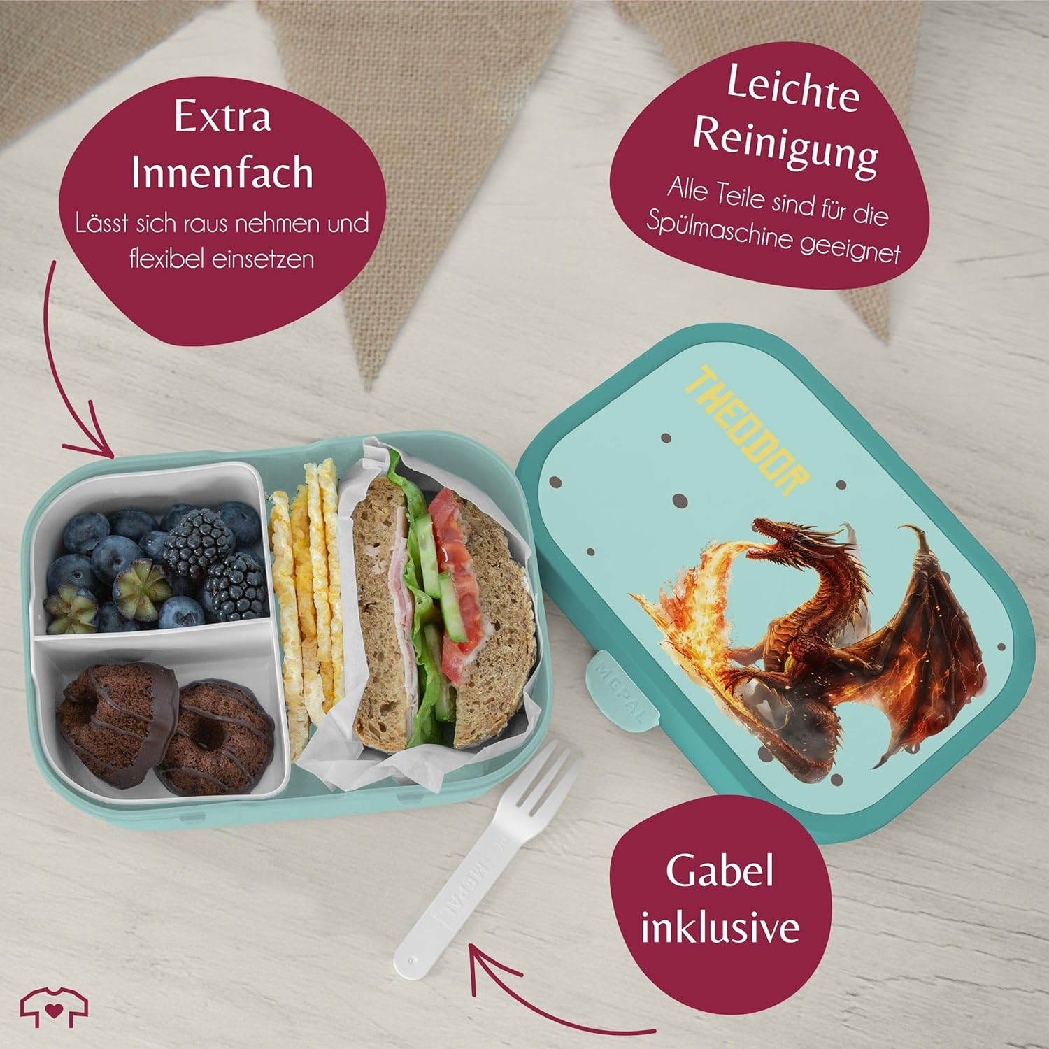 | Enthaltene Komponenten | Bento-Einsatz, Brotdose, Snack-Gabel |