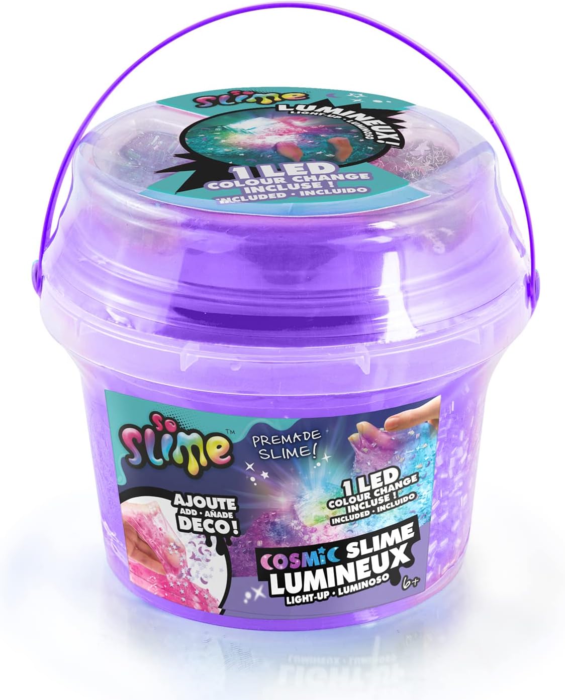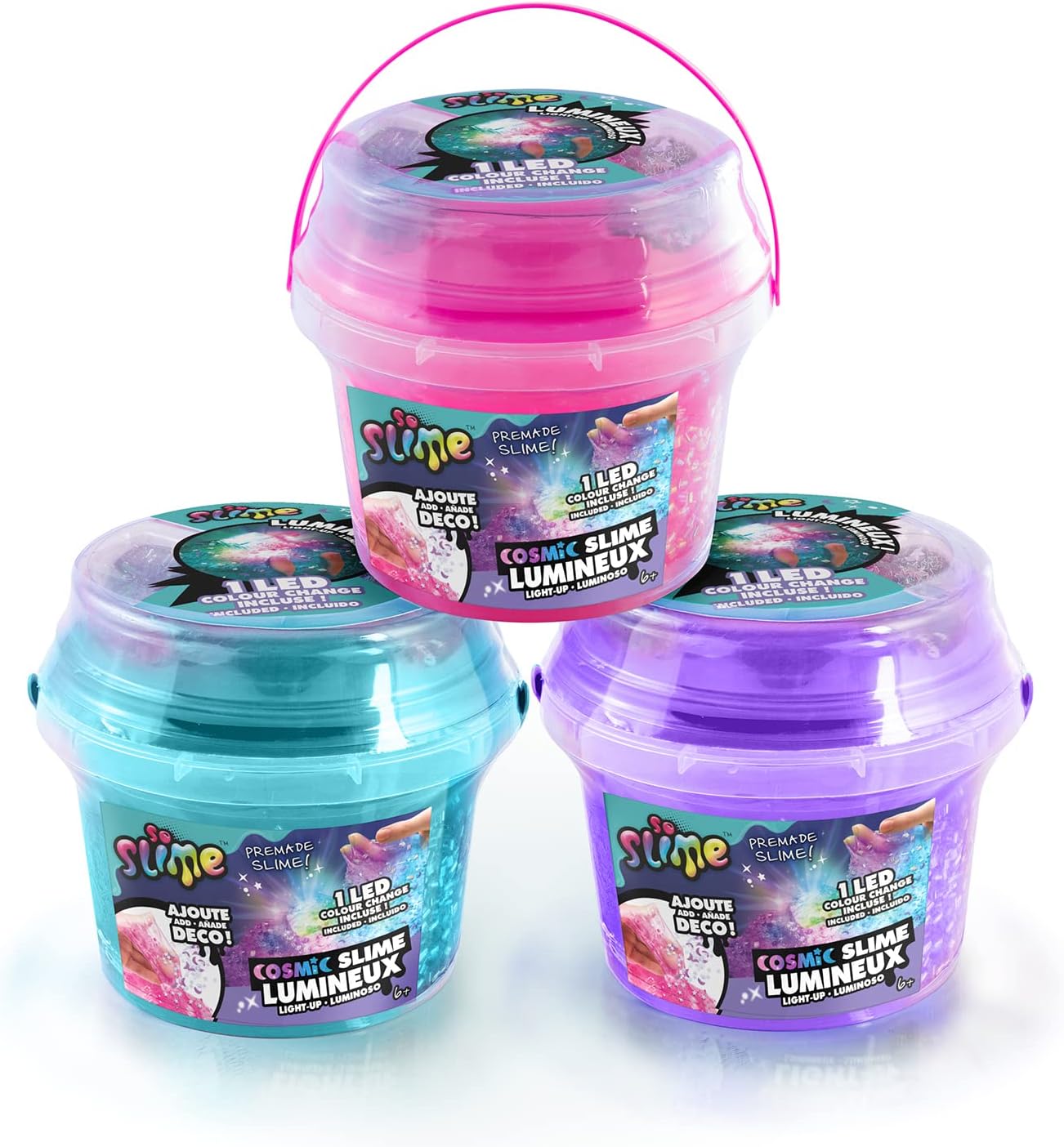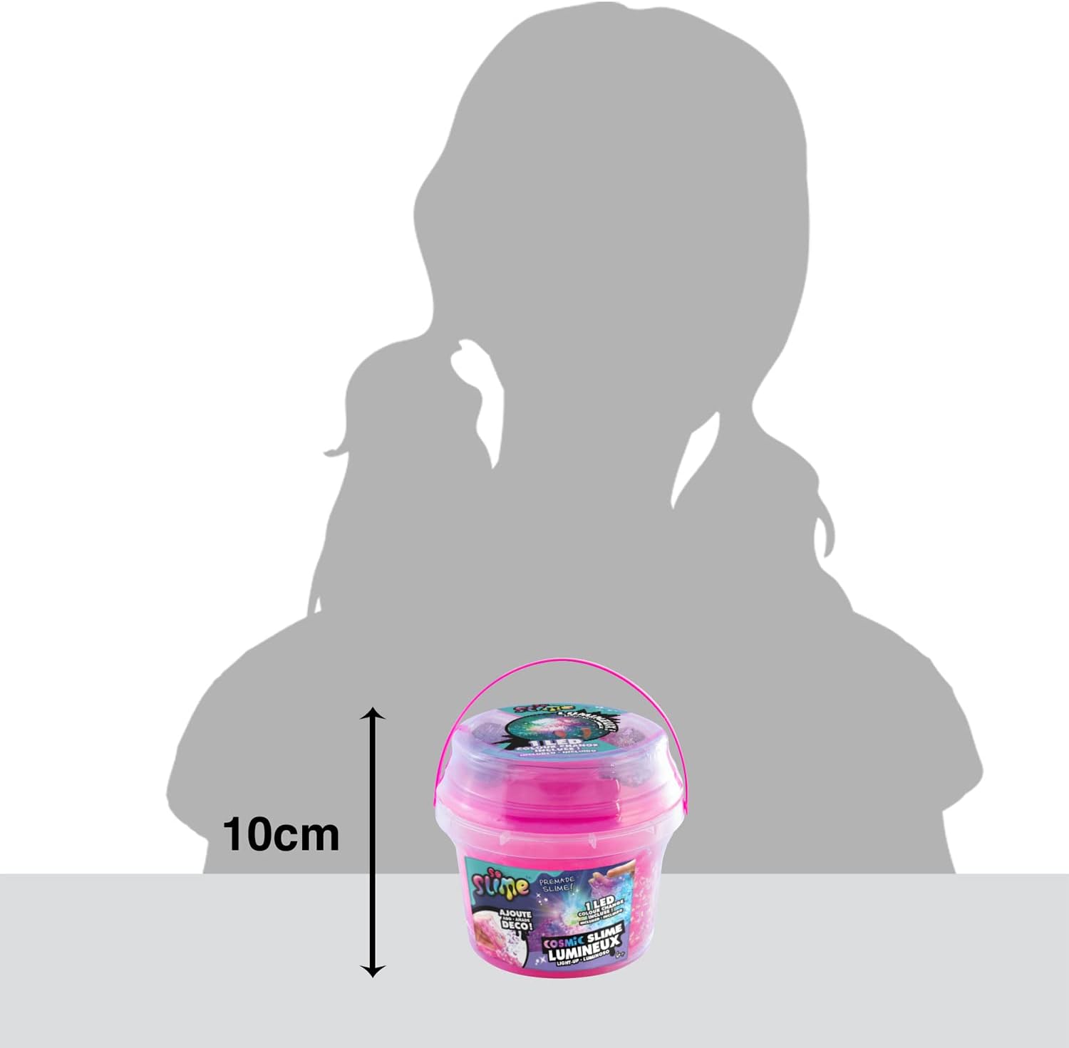 UN BARILLO DI 350 GRAMMI DI SLIME: divertiti con una melma gigante per ancora più divertimento! SLIME COSMICO LUMINOSO: Divertiti con la tua melma colorata e trasparente. Aggiunge decorazioni e LED per un incredibile effetto cosmico! PRATICO: Conserva la tua melma cosmica nel suo barile per goderne più a lungo. Ideale e facile da trasportare 3 COLORI A SCELTA: Rosa, viola o turchese, scegli la tua preferita o collezionali tutti! CONTENUTO: un barile da 350 grammi di melma, 2 sacchetti decorativi, 1 LED. ADATTO PER I BAMBINI: Formula atossica conforme alle norme europee dei giocattoli. Gelificante di origine naturale a base di alghe. A partire dai 6 anni. Prodotti sviluppati in Francia.