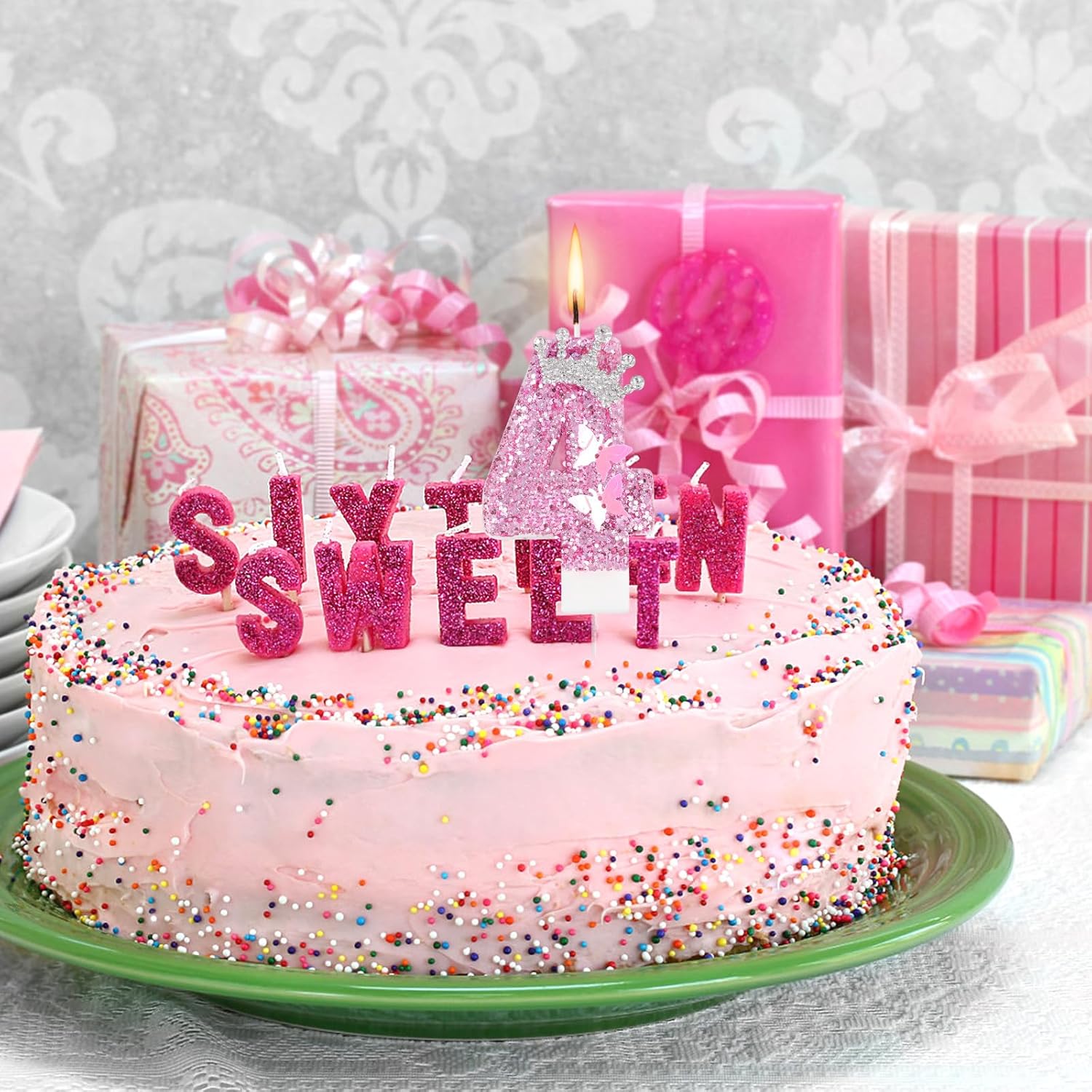 Contenuto della confezione: riceverete 1 candela di compleanno con numeri e 1 bastoncino. Con un design delicato e un bell'aspetto, perfetto per aggiungere un tocco di fascino alla tua torta di compleanno. Materiali eccellenti: la candela con numero glitter rosa è realizzata in cera, paillettes, strass, leghe e plastica e il bastoncino è in plastica. Buona qualità, affidabile e affidabile, facile da accendere e offre un'esperienza di utilizzo migliore. Dimensioni del prodotto: la candela rosa con numero di compleanno è alta circa 7,3 cm e si adatta perfettamente alle torte senza sovrastarne il design: la dimensione giusta per una decorazione elegante. Design delicato: questa candela numerica è decorata con bellissime farfalle, corone di strass e accenti di paillettes, che sono delicati, accattivanti e scintillanti e possono migliorare l'atmosfera delle tue feste di compleanno. Ampia applicazione: la candela con numero glitter rosa è adatta per varie celebrazioni, come compleanni, anniversari, matrimoni, cerimonie di apertura, feste, lauree, riunioni di famiglia, ecc.