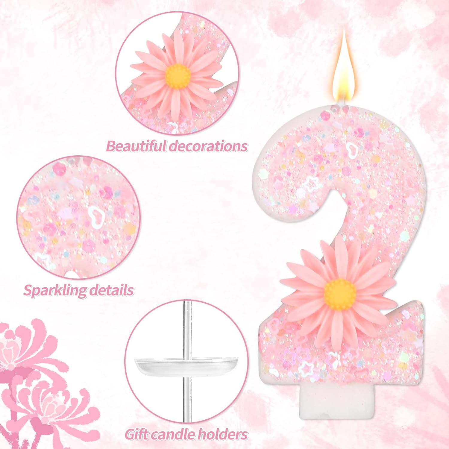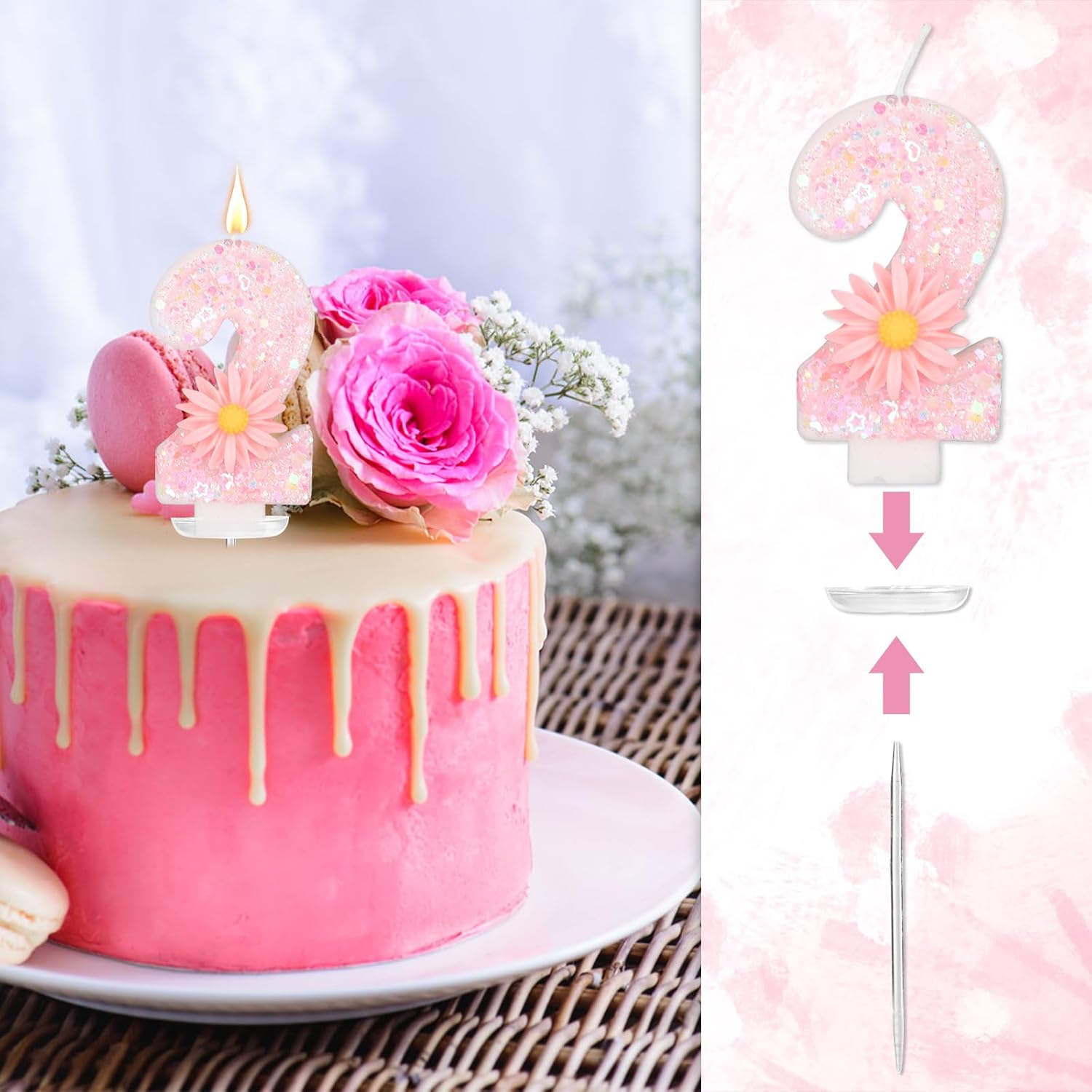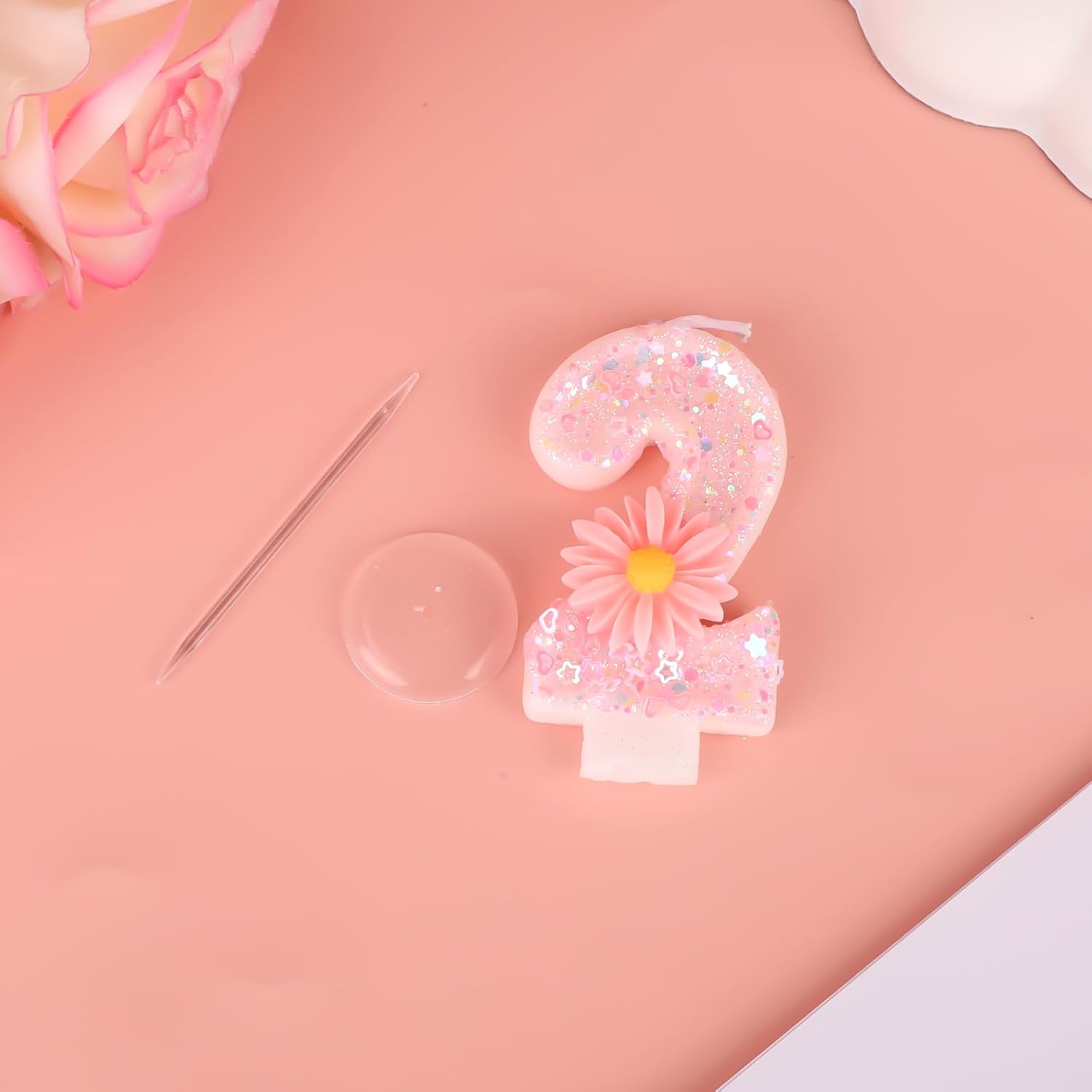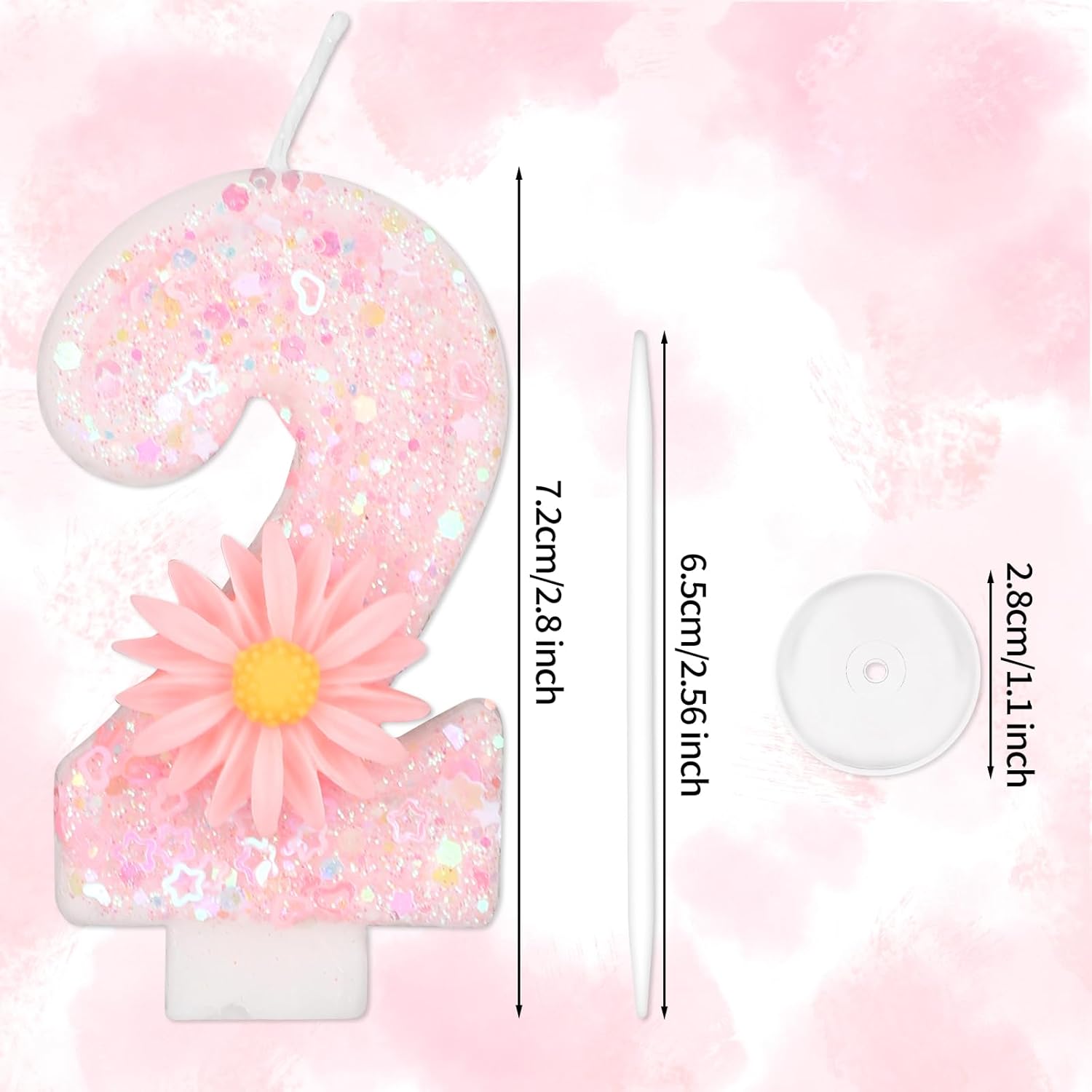 La confezione include: 1 candelina rosa con il numero, 1 vassoio di plastica e 1 bastoncino robusto, perfetti per aggiungere un tocco di fascino alla tua torta di compleanno. Materiali di qualità: Realizzata in cera di paraffina di qualità, questa candela a forma di numero brucia in modo pulito e uniforme. È robusta, resistente allo sbiadimento e costruita per durare, rendendola una scelta affidabile e festosa per le tue celebrazioni. Grazioso design a forma di margherita: questa candela rosa con numero è caratterizzata da brillantini vivaci che brillano magnificamente sotto la luce, impreziosita da un'adorabile e realistica margherita, che aggiunge un tocco affascinante e delizioso a qualsiasi torta di compleanno. Dimensioni perfette: con i suoi 7,2 cm di altezza, questa candela si adatta perfettamente alle torte senza sopraffarne il design: ha le dimensioni giuste per una decorazione elegante. Utilizzo versatile: ideale per feste di compleanno, baby shower, anniversari e altre occasioni speciali, crea momenti indimenticabili con questo delizioso cake topper. È anche un regalo premuroso per amici o persone care che si preparano a festeggiare.
