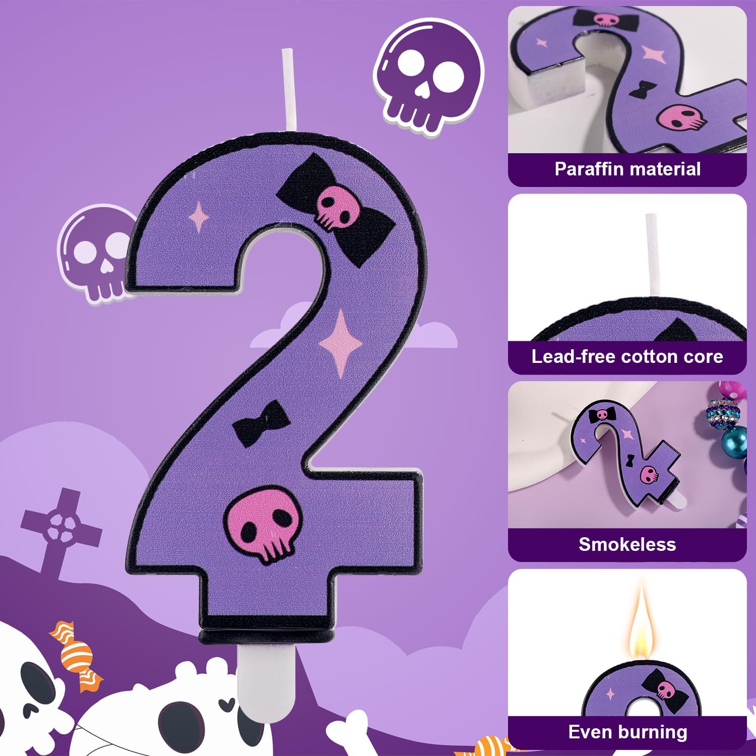 Prodotto incluso: riceverai 1 pezzo di questa candela di compleanno viola.Aspetto carino e design dei cartoni animati lo rendono un'ottima decorazione per le torte, ecc., Che può aggiungere bellezza alla tua festa. Design carino: questa candela del numero di compleanno è progettata con un grazioso tema del cranio viola, carino e interessante, può aggiungere colore alla tua torta e può anche creare un'atmosfera romantica e gioiosa. Dimensioni adatte: la candela viola a forma di cartone animato misura circa 8,3cm di altezza totale con il bastoncino, le dimensioni specifiche sono mostrate nell'immagine, sono adatte alla maggior parte delle torte e ti aiutano ad avere un compleanno indimenticabile. Materiale affidabile: questa candela per torte di compleanno è realizzata in paraffina, di buona qualità, facile da bruciare e bruciare in modo uniforme, nessun fumo e nessun odore, può offrire un'esperienza d'uso migliore e più piacevole. Ampiamente utilizzata: questa candela di compleanno viola è adatta per feste di feste di compleanno, feste a tema viola, feste a tema dei cartoni animati, matrimoni, anniversari, Natale, ecc. È anche una scelta ideale per dare alla famiglia o agli amici.