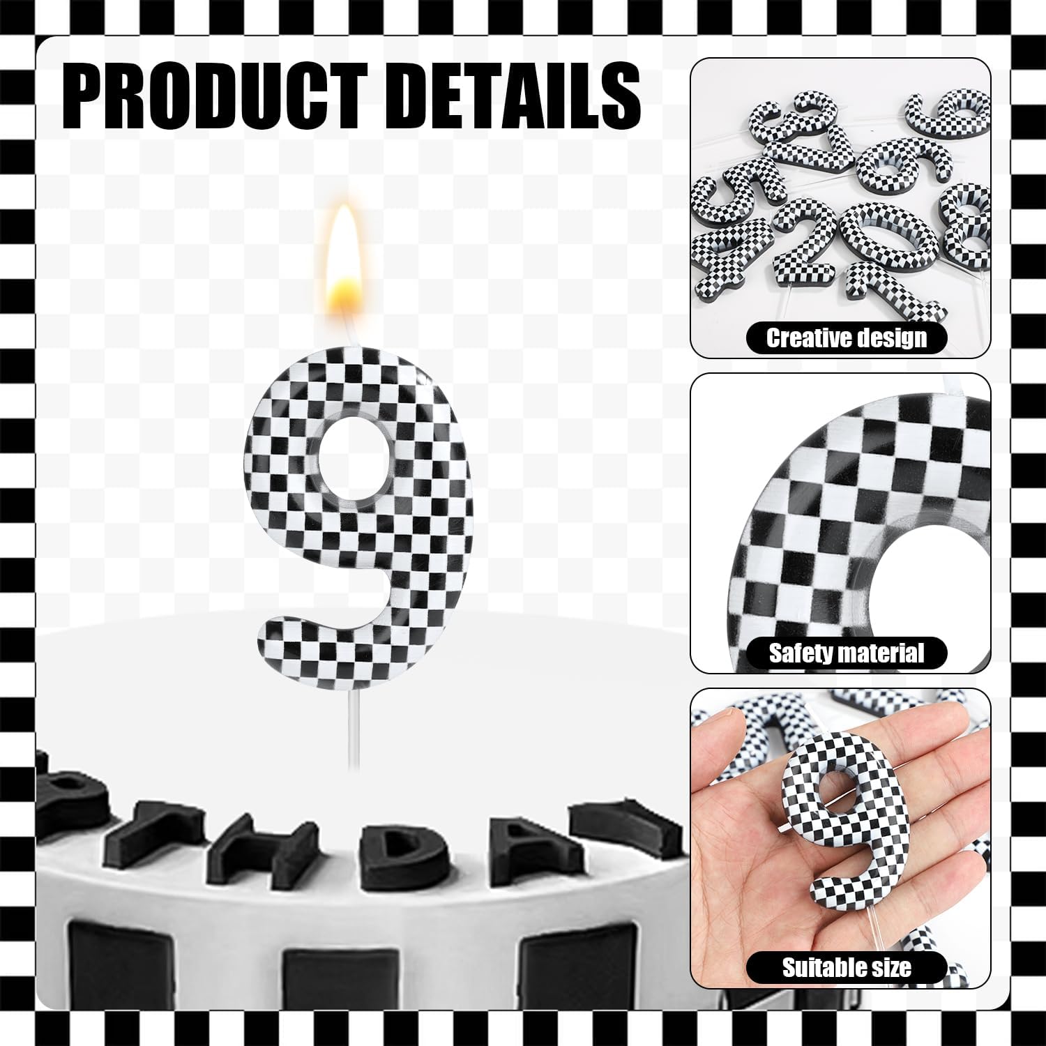 Il pacchetto include: otterrai 1 candela di compleanno a tema da corsa, che può soddisfare le esigenze di decorazione della tua festa di compleanno e rendere più bella la tua torta di compleanno, i fan delle corse non dovrebbero perderla. Design unico: i nostri prodotti adottano un design a tema da corsa molto classico, il motivo a scacchi sembra più affascinante, dando alle persone una sensazione fresca e rilassante, che può essere un buon abbellimento per le tue torte e altri dessert, creando ricordi più indimenticabili per te. Materiale fantastico: i nostri prodotti sono realizzati con paraffina di qualità relativamente di buona qualità.Il materiale è affidabile, nessun odore speciale e non influenzerà il tuo corpo.Il tempo in fiamme è lungo, il che può mantenere la festa di compleanno calda e luminosa e puoi usarla con fiducia. Dimensione del prodotto: la lunghezza delle nostre candele numeriche è di 6 cm, che può essere abbinata alla maggior parte delle dimensioni di torte, come torte di compleanno, torte a tema da festa, torte di laurea, ecc. Non impiegherà troppo spazio e renderà la tua festa di piùgioioso. Ampiamente utilizzato: le nostre candele possono essere utilizzate nella maggior parte delle occasioni e sono molto versatili, come feste di compleanno, feste a tema, feste estive, feste di videogiochi e sono un buon strumento per la decorazione delle torte per feste, permettendo alle persone di sentire i tuoi gusti.