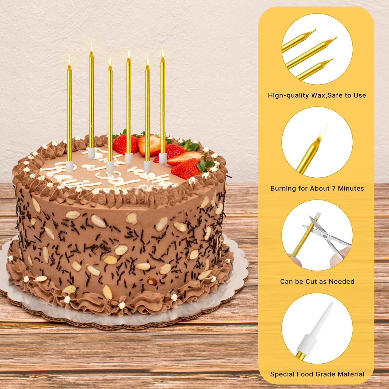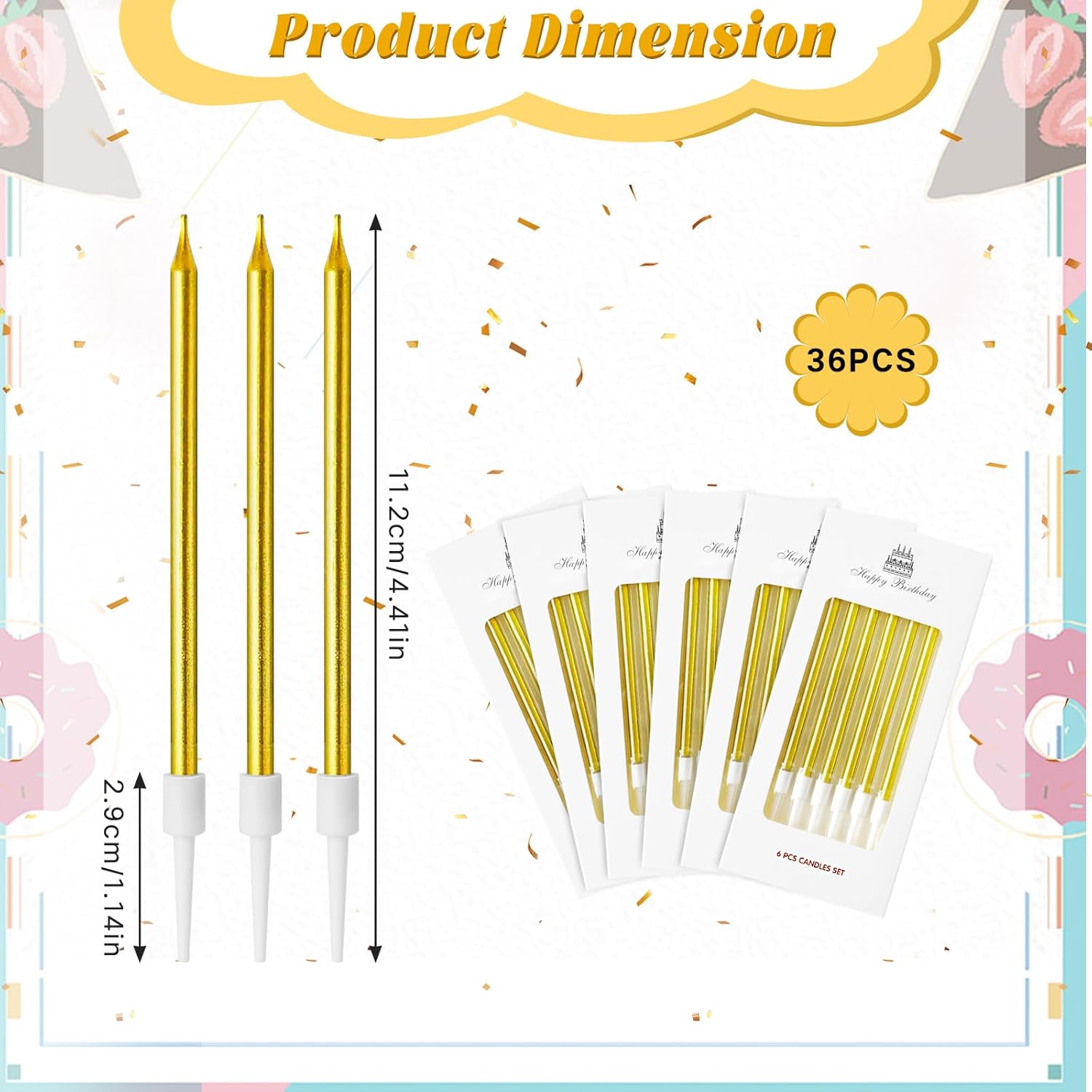 [Alta Qualità & Sicurezza] La candeline compleanno è realizzata in cera di alta qualità per garantire una combustione stabile e duratura, con ciascuna candeline compleanno che brucia per circa 7 minuti. Inoltre, la candeline compleanno non emette alcun odore sgradevole durante la combustione. La base premium per alimenti può entrare in contatto diretto con la torta, garantendo un utilizzo sicuro. [Design Pratico] La base per candele compleanno è realizzata con materiali di alta qualità per alimenti, che la rendono sicura per il contatto diretto con la torta. Inoltre, il design della base impedisce efficacemente alla cera di gocciolare sulla torta, mantenendola pulita, mentre il suo eccellente supporto garantisce la stabilità della candela. [Atmosfera Elegante & Lussuosa] La candeline compleanno particolari presenta un design unico e raffinato. La sua forma allungata si distingue tra le altre candele, trasudando eleganza. L'esterno dorato conferisce a questa candela un aspetto lussuoso e sofisticato. L'oro simboleggia la nobiltà e la celebrazione, abbinandosi perfettamente a vari temi di eventi. [Vari Usi] Le candeline lunghe compleanno sottili sono ottime decorazioni per torte o cupcake, adatte per matrimoni, compleanni, baby shower, addio al nubilato, feste e altre occasioni importanti. Se vuoi rendere la tua festa più colorata e creativa, queste sono altamente raccomandato. [Ampia Quantità] Il set comprende 6 scatole di candeline compleanno, ciascuna scatola contenente 6 pezzi candeline compleanno, per un totale di 36 candele. Ciascuna candeline compleanno è alta 11,2 cm, con un'altezza di base di circa 2,9 cm. La lunghezza delle candeline compleanno può essere regolata secondo necessità.. L'ampia quantità è sufficiente per soddisfare le esigenze delle varie celebrazioni.