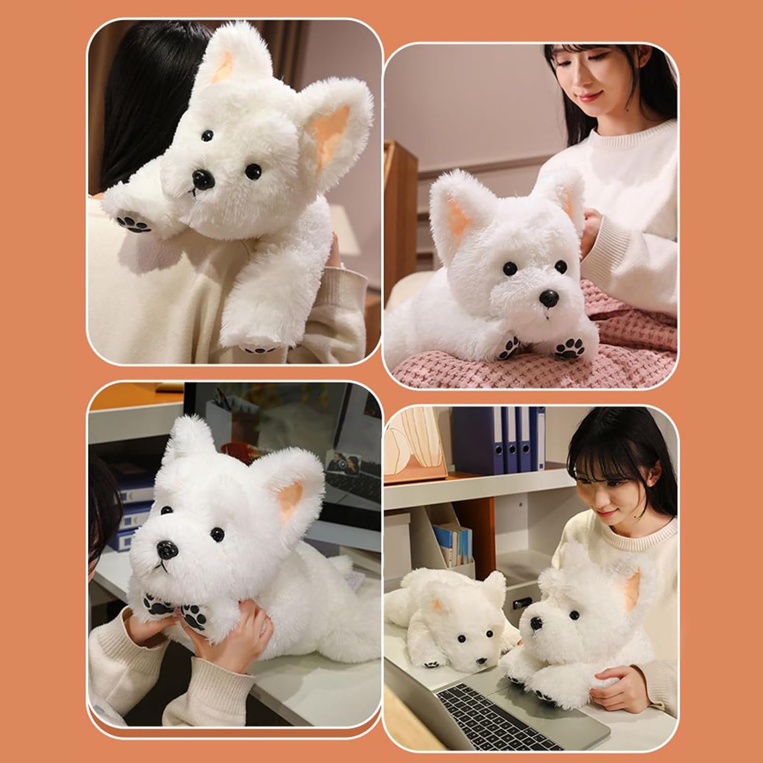 Compagno di Comfort Pacifico: Sperimenta una morbidezza inaspettata con questo pelouche ben progettato, offrendo comfort pacifico e un senso immediato di calma per momenti ancora più accoglienti e rilassanti Morbidezza Incredibilmente Accogliente: Tessuto ultra morbido e imbottitura in peluche offrono una coccola soffice tutto il giorno, sicuro per la pelle sensibile e migliora naturalmente il sonno e il relax con comfort impeccabile Calore in Ogni Dettaglio: Ideale per uso sicuro, questo peluche cane emana tenerezza e affetto, per occasioni di e per arredare camere da letto o con festivi e stile raffinato Compagno Calmante: Progettato per essere una presenza rilassante, questo cane di peluche fornisce tattile e supporto emotivo come compagno affidabile da posizionare sulla scrivania o sul comodino Design Realistico: Il peluche riproduce fedelmente un Westie con texture del tessuto e struttura auricolare eretta, donando appeal visivo e autenticità tattile ideale per arredamento o come confortevole compagno